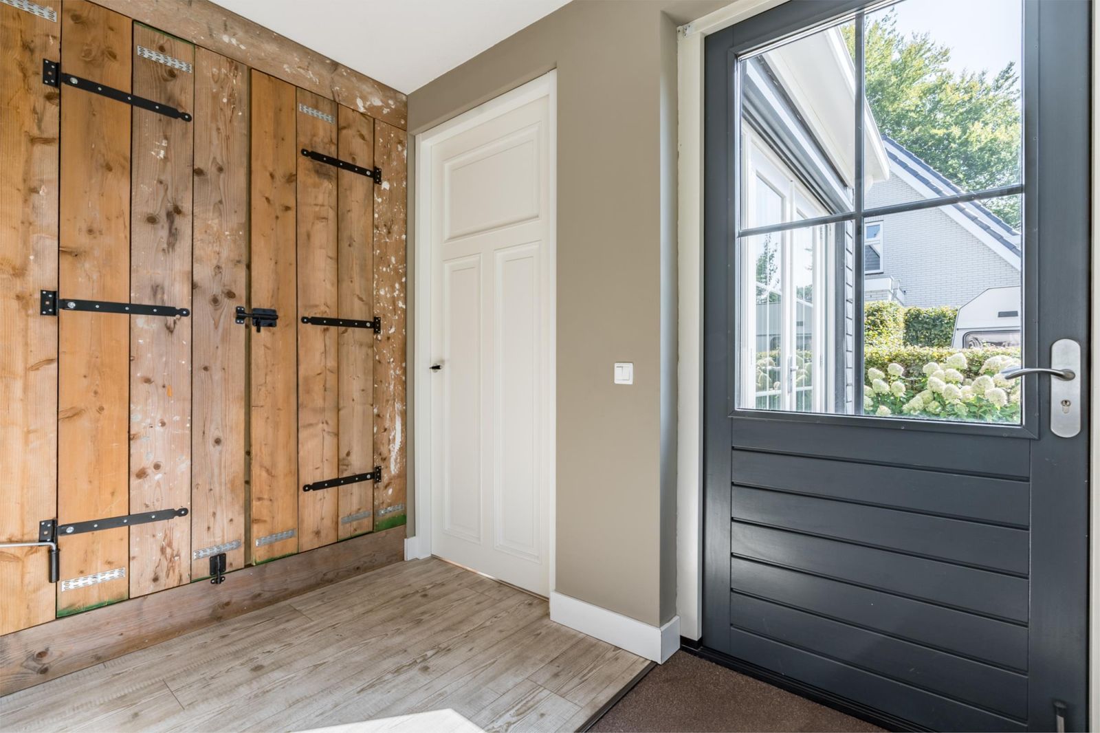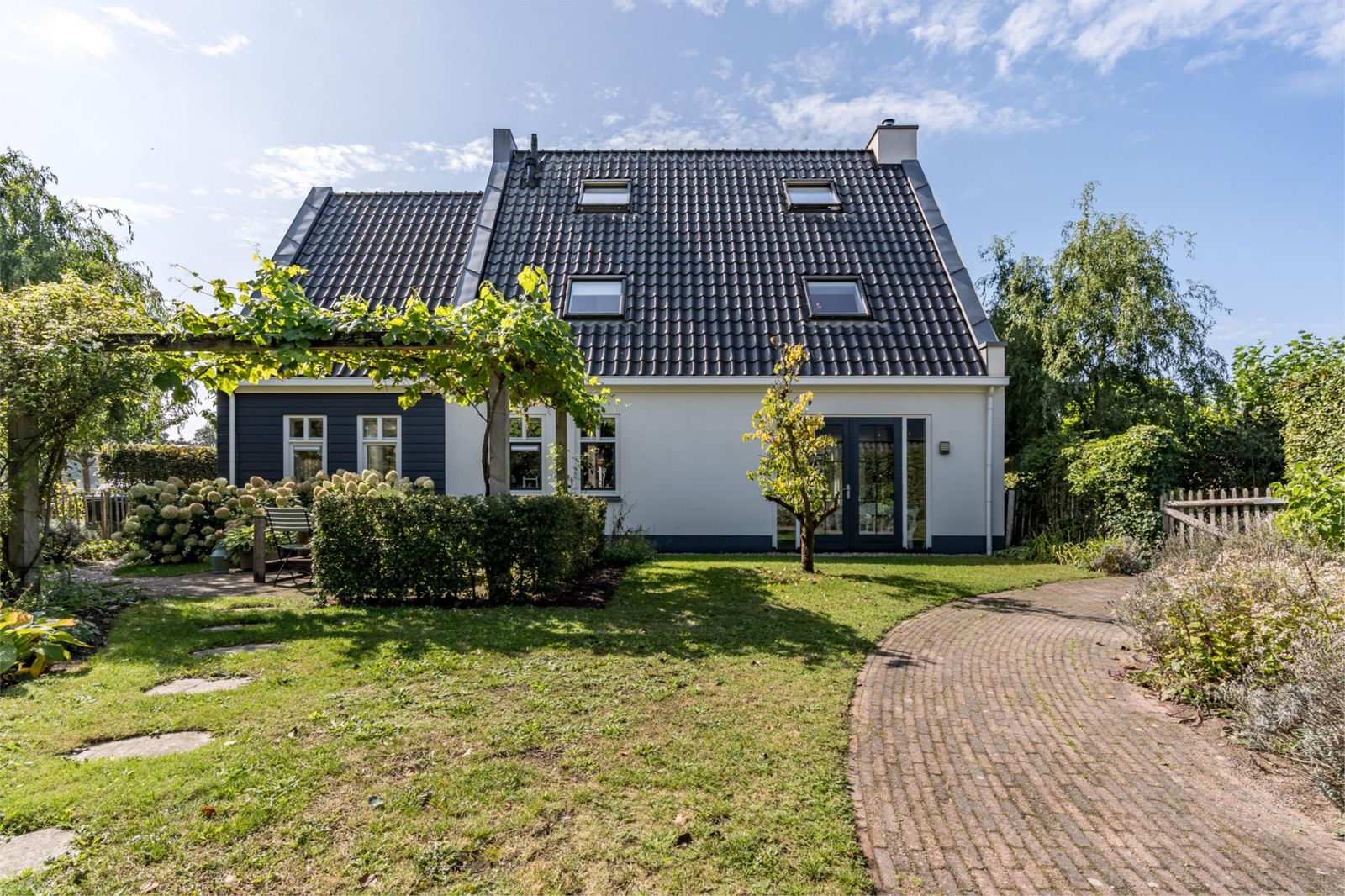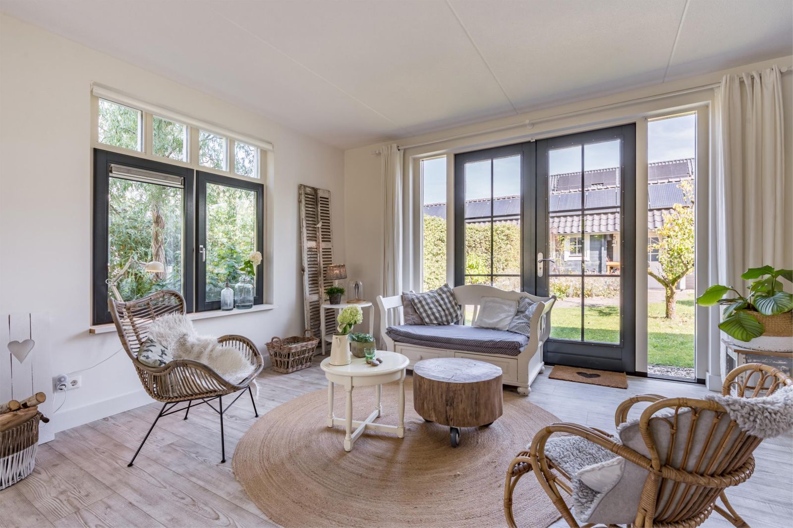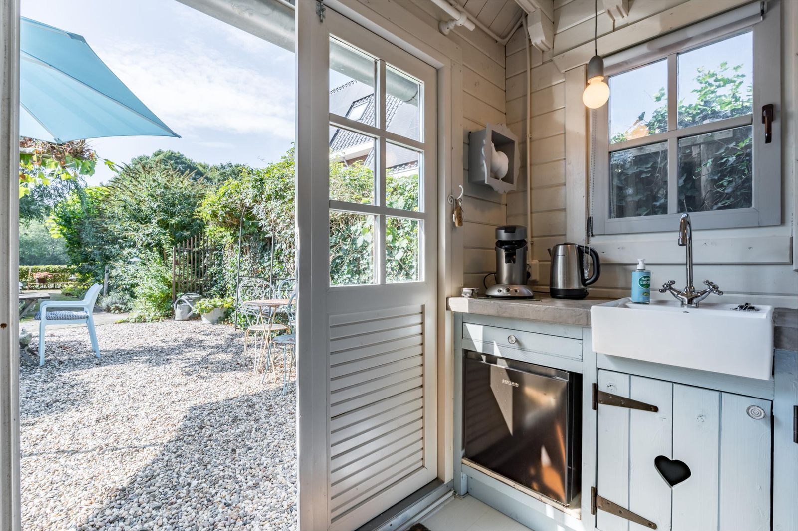 Achterin de tuin staat een groot vrijstaand houten bijgebouw voorzien van 14 zonnepanelen. In het bijgebouw vind je aan de rechterzijde de schuur met een ruime bergzolder en kun je vanuit de gezellige, ruime veranda genieten van de tuin met veel privacy.