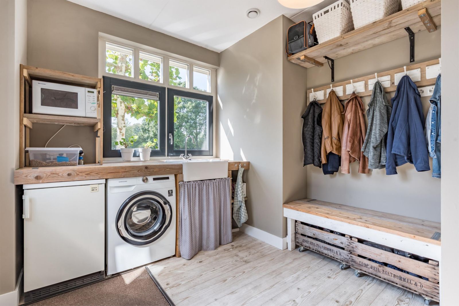 We sluiten de rondleiding van de begane grond af in de bijkeuken die bereikbaar is vanuit de keuken. Hier vind je de garderobe, een grote inbouwkast en een vast meubel welke is voorzien van een spoelbak met warm- en koud water. Tevens is hier plaats voor de wasmachine en bijvoorbeeld een vrieskastje.