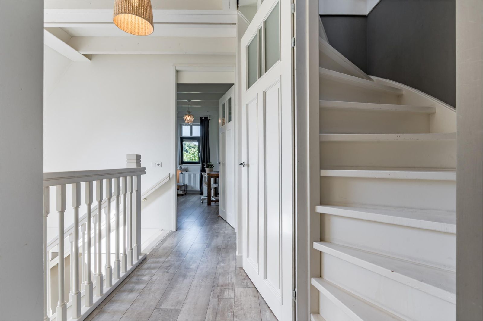 Via de trap in de hal/ vide komen we op de lichte overloop waar je de toegang hebt tot drie grote slaapkamers, een mooie badkamer, een werkruimte en extra kastruimte. Tevens bevindt zich hier de vaste trap naar de zolderverdieping.