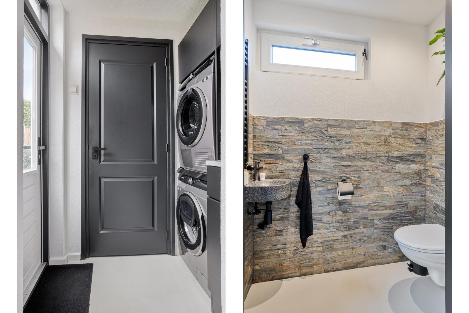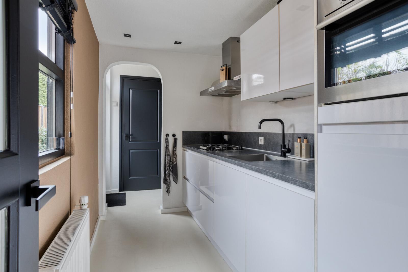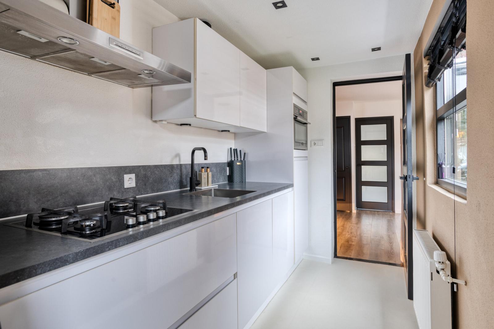 De keuken beschikt over veel kastruimte, grote lades, een gaskookplaat, afzuigkap, combimagnetron, vaatwasser en koelkast. Door de grote raampartij is er veel daglicht. Aansluitend ligt de bijkeuken met achterdeur, vaste kast en witgoedaansluitingen.