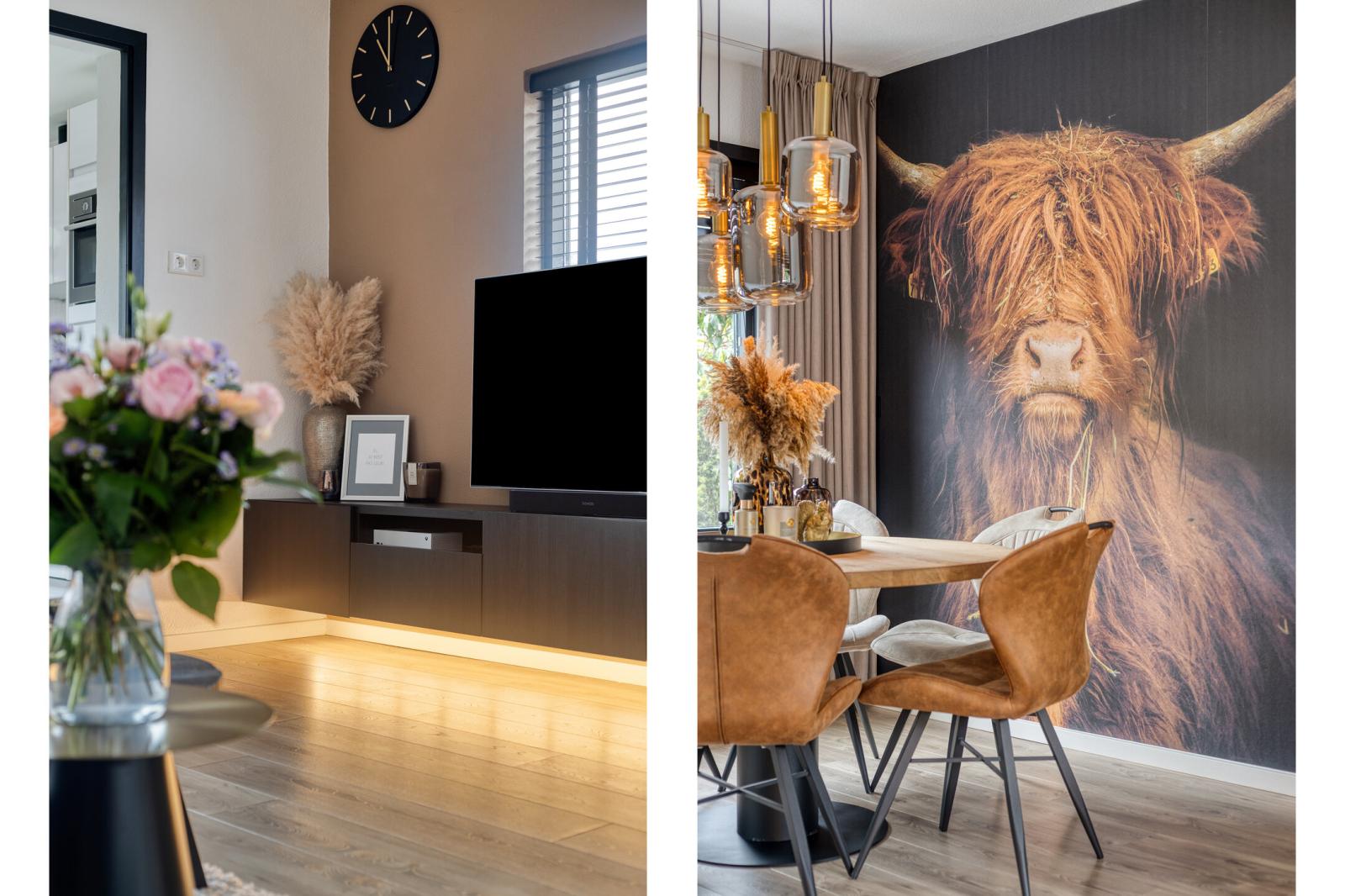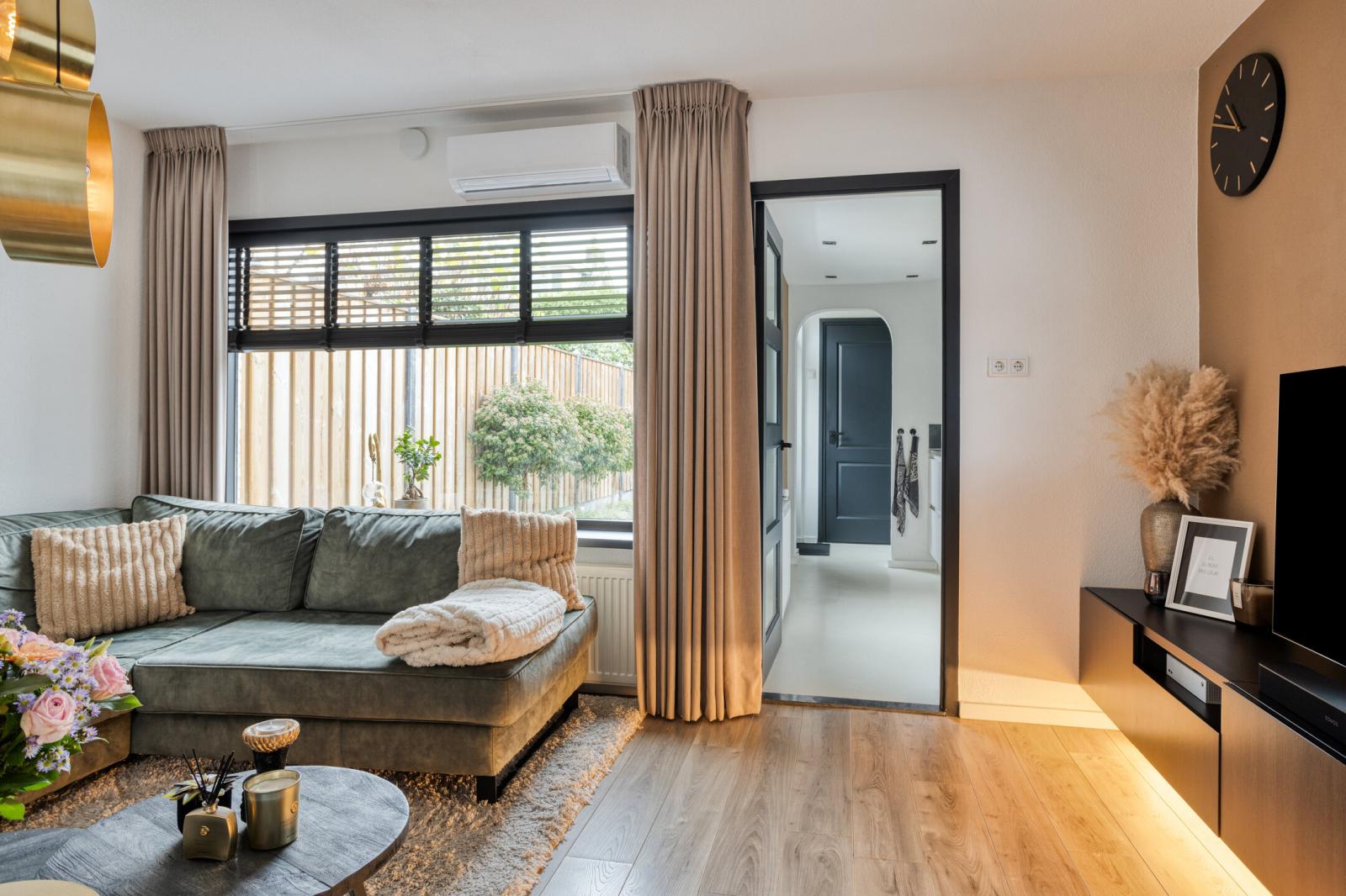 De entree bevindt zich aan de zijkant van de woning. In de hal zijn de meterkast, trapkast en trapopgang gesitueerd. De L-vormige woonkamer is zeer sfeervol, met donkere kozijnen, strakke wanden en plafonds en een lichte laminaatvloer. De aanwezige airco kan zowel koelen als verwarmen. In de uitbouw aan de achterzijde bevinden zich de keuken, bijkeuken en het toilet.