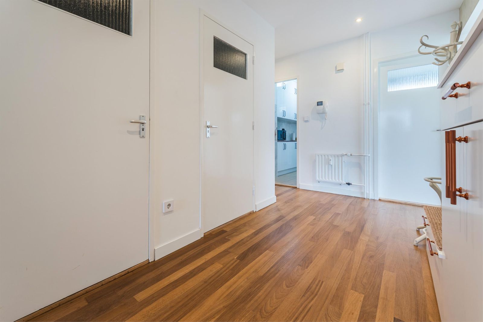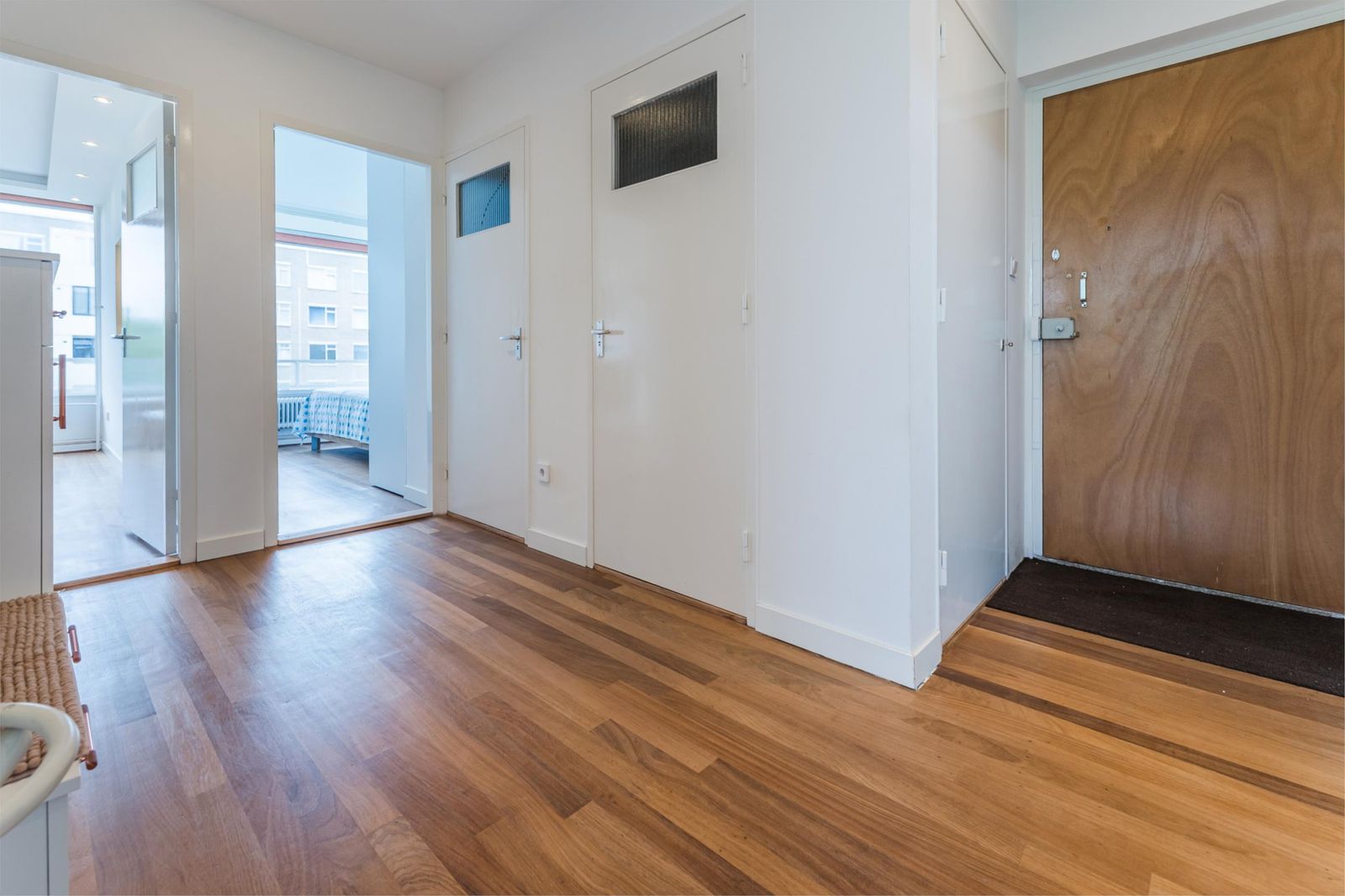 Entree appartement, ruime hal, toilet, zeer lichte en ruime woonkamer. De woning heeft een prachtige houten vloer. Moderne witte keuken met apparatuur, aangrenzend een klein balkon. Balkon kan dicht gemaakt worden (vergunning is aanwezig) wat direct een ruimere keuken oplevert.