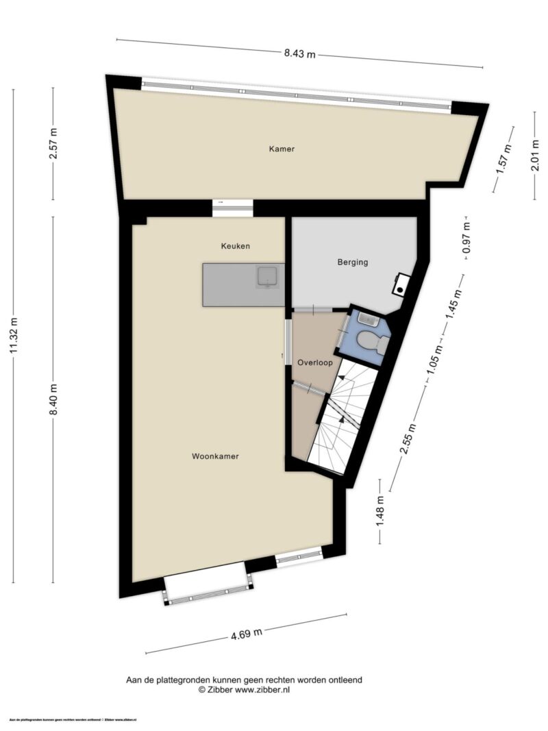 Onder de woonruimte bevindt zich een commerciële ruimte van ca. 60 m² met een eigen entree aan de straatzijde. Deze ruimte wordt eveneens te koop aangeboden en biedt de mogelijkheid deze samen te voegen met de bovenwoning. Heeft u ook interesse in de benedenruimte? Vraag dan naar de verkoopbrochure bij de makelaar.