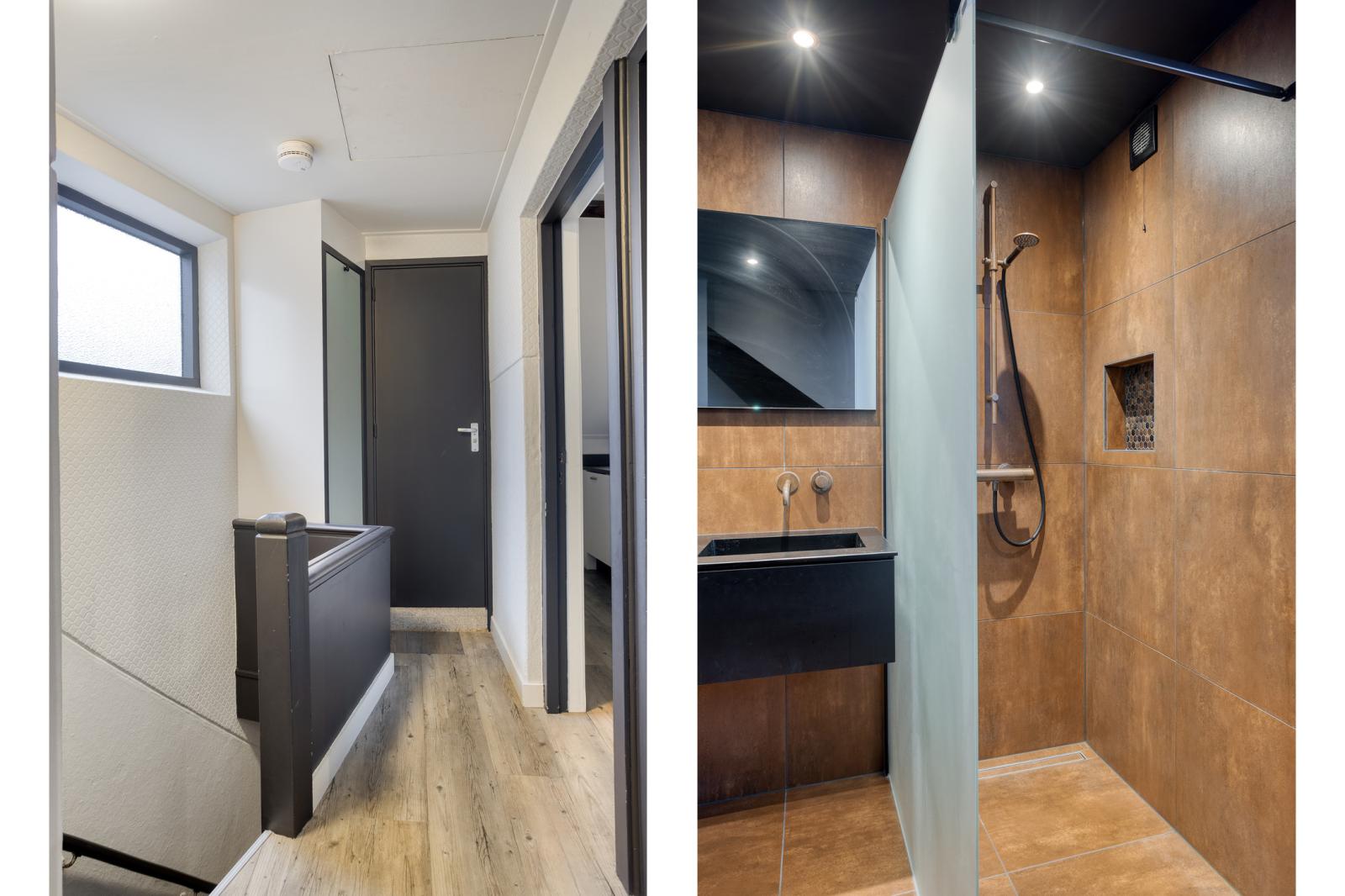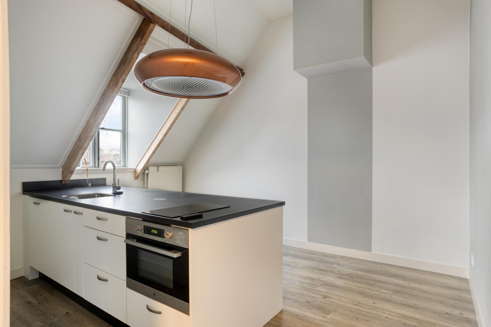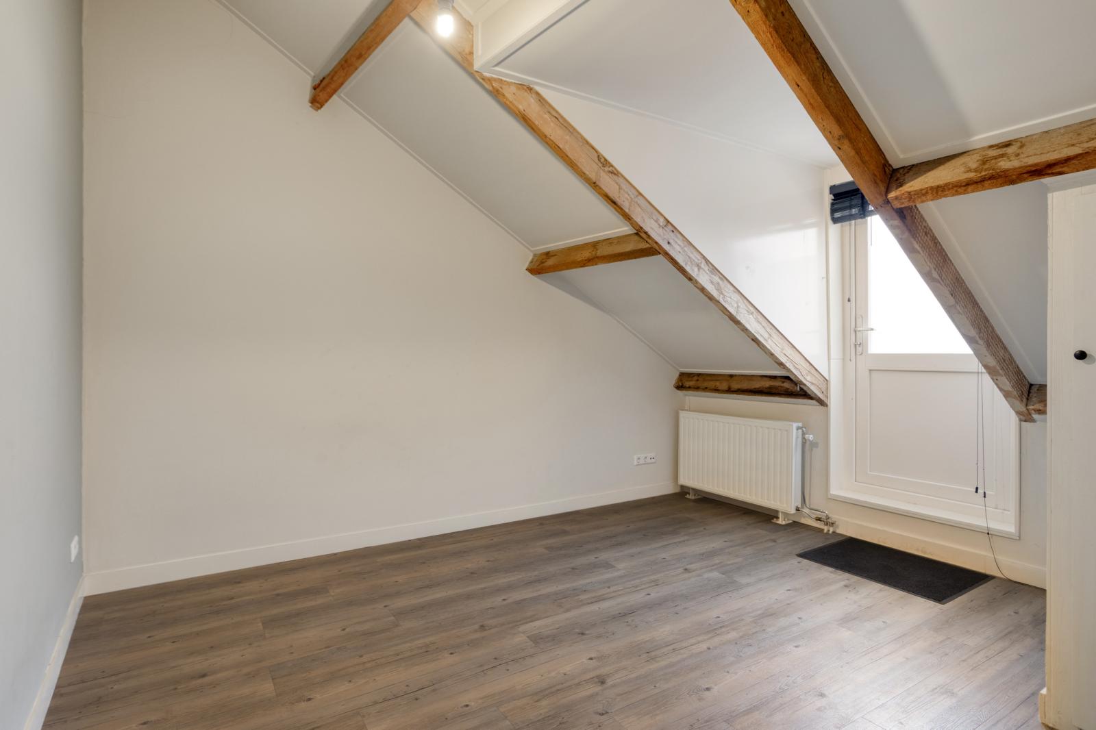 De tweede verdieping beschikt over een comfortabele slaapkamer met toegang tot het dakterras en een nette badkamer in goede staat. Daarnaast is er een tweede kamer die eveneens is voorzien van een keukenopstelling. Deze ruimte biedt diverse gebruiksmogelijkheden, bijvoorbeeld als extra woonruimte, studio, werkplek of logeerkamer. De zichtbare balken en de kapconstructie geven deze verdieping extra karakter.
