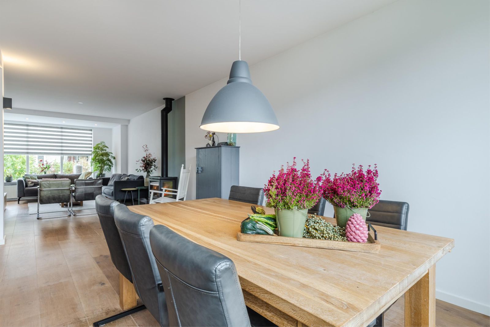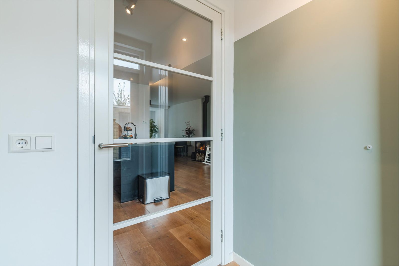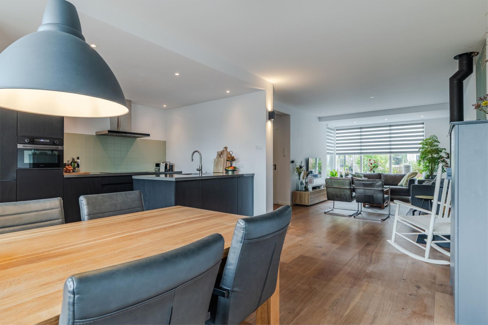 Hal met modern toilet, ruime en lichte woonkamer voorzien van eiken houten vloer, met grote raampartijen en extra ruimte dankzij de uitbouw aan voor- en achterzijde. De houtkachel (2022) in de woonkamer zorgt voor extra warmte en sfeer. De open keuken (2022) is voorzien van hoogwaardige inbouwapparatuur, vanuit de keuken komt u in een praktische bijkeuken met toegang tot de tuin.
