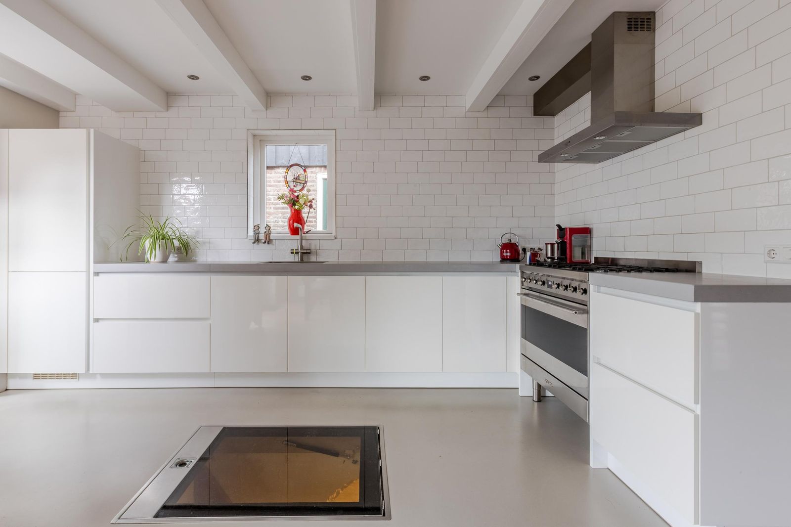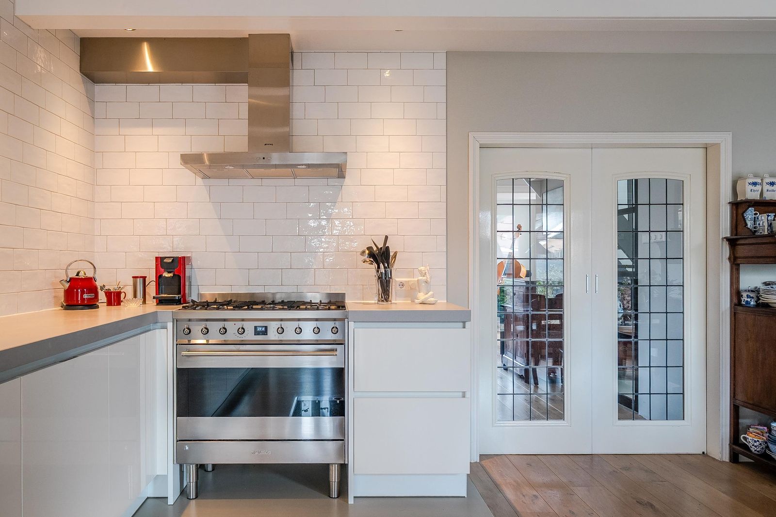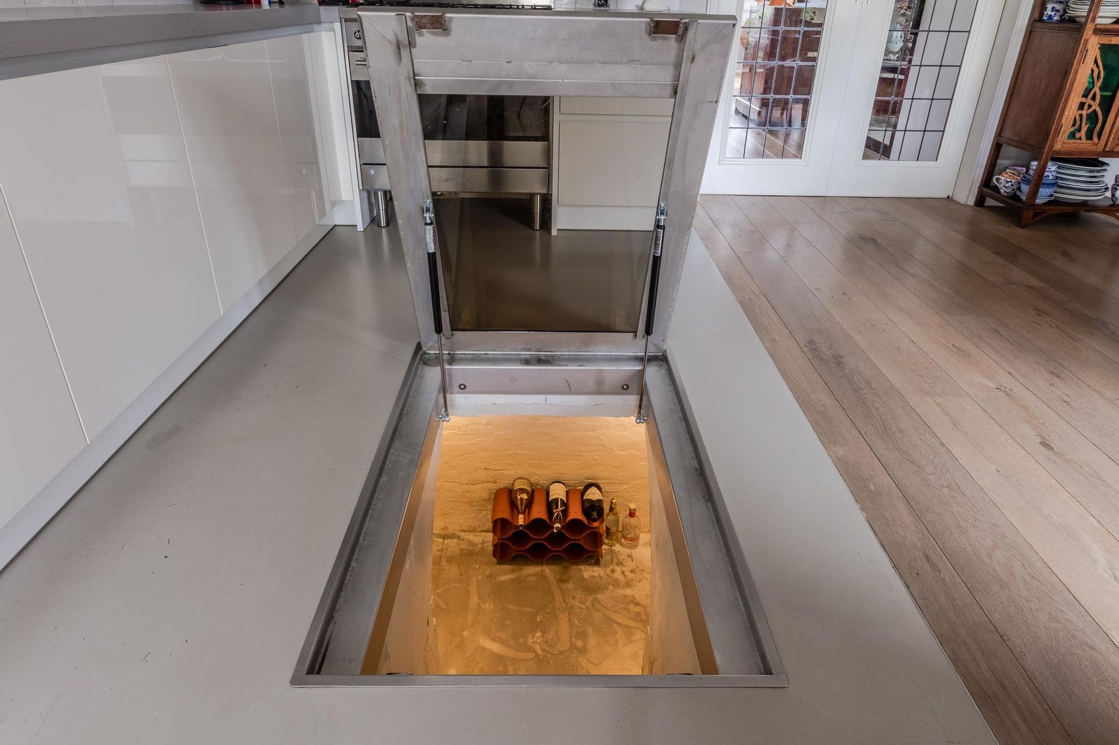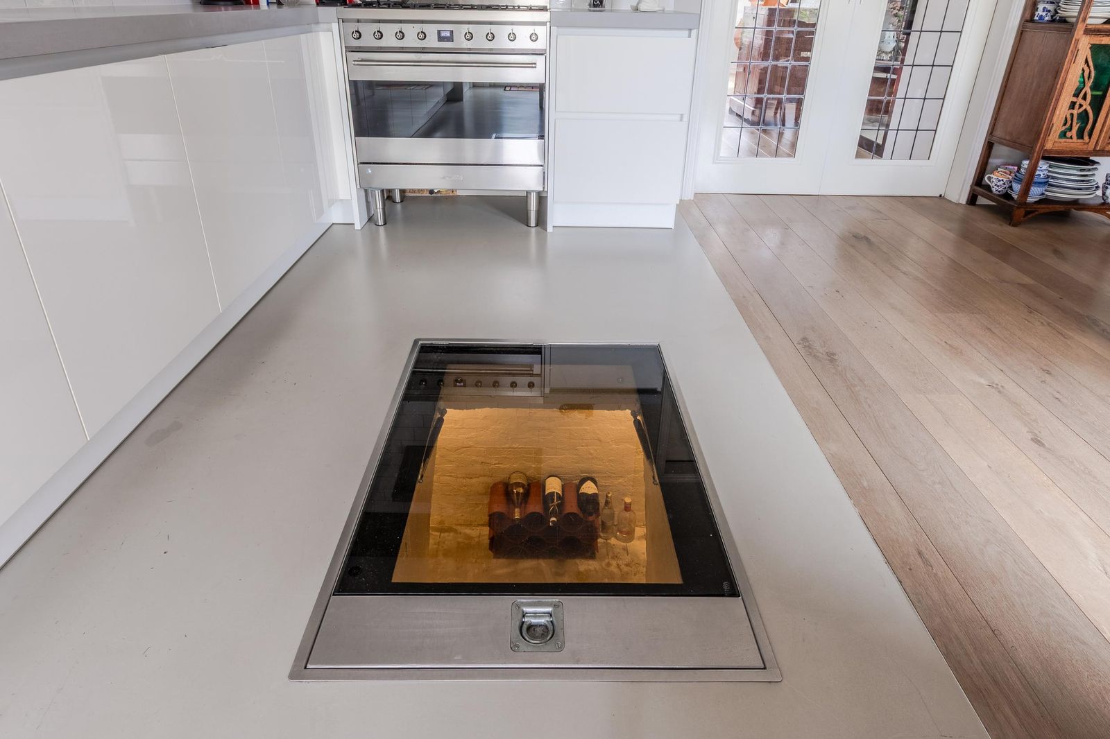 De moderne keuken in L-opstelling is voorzien van diverse inbouwapparatuur, waaronder een koelkast, een vrieskast, vaatwasmachine, kookplaat, afzuigkap, brede oven, quooker en veel opbergruimte. In de keukenvloer biedt een glazen RVS-deksel toegang tot een bescheiden (wijn-)kelder.