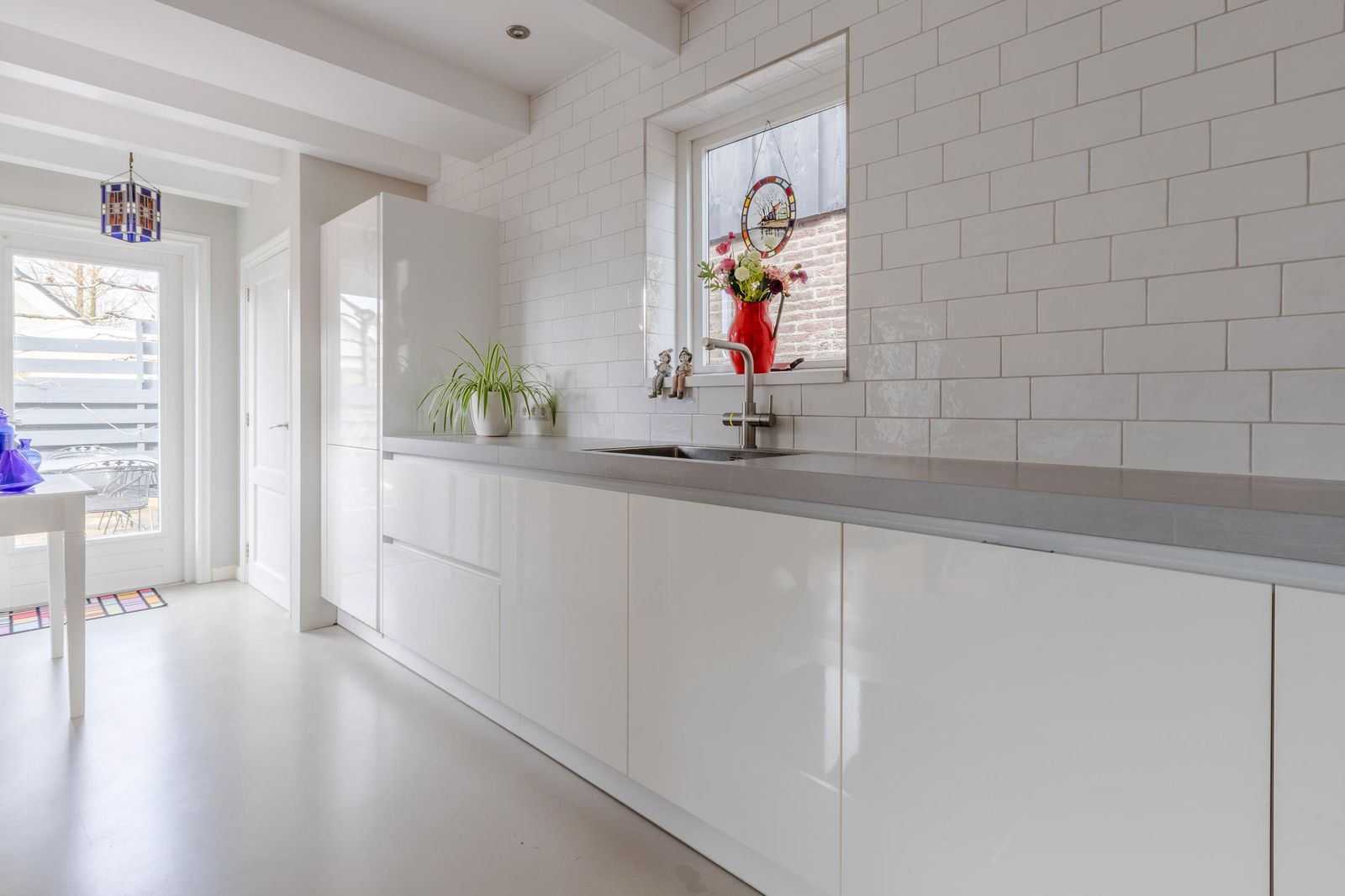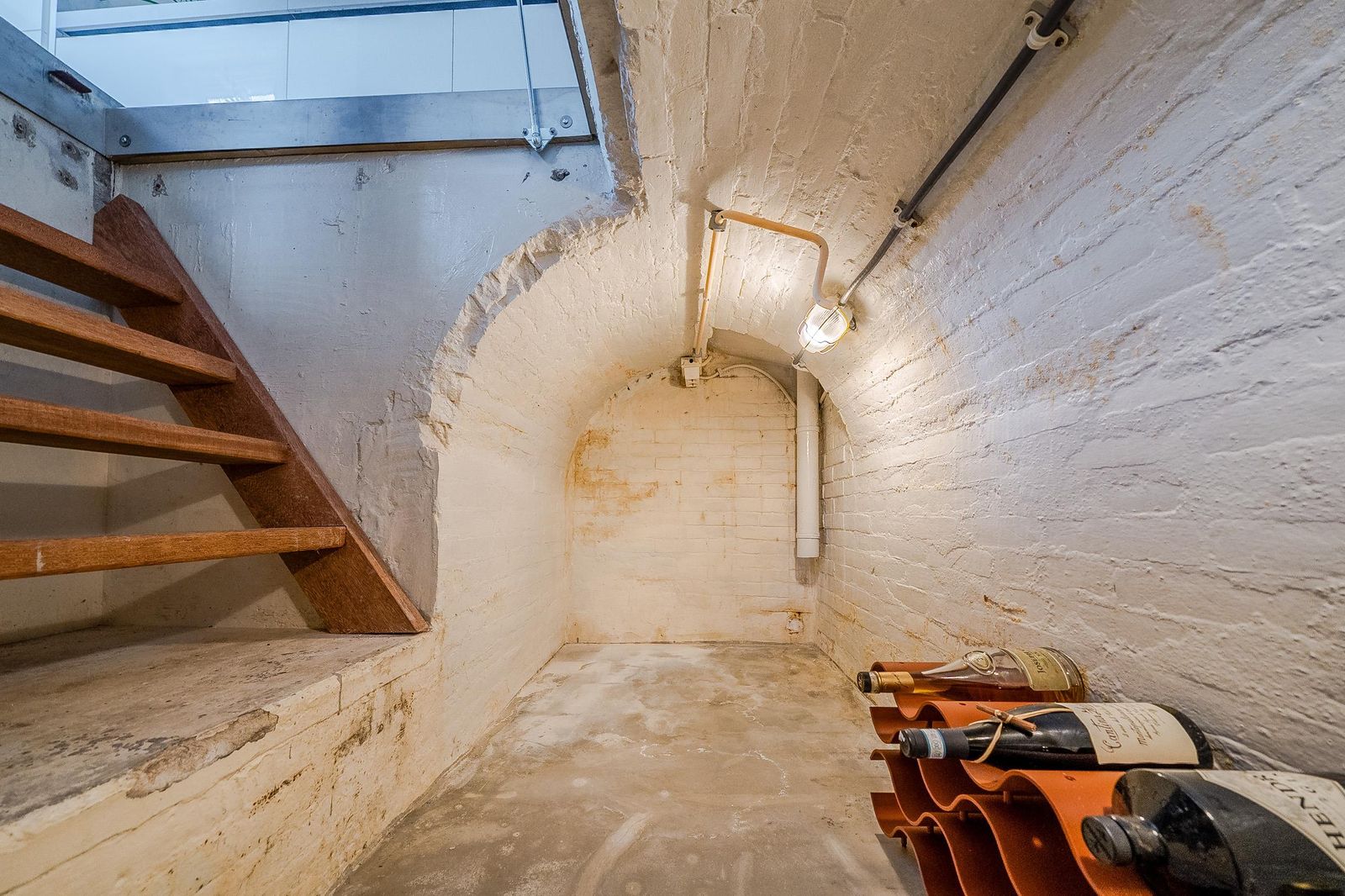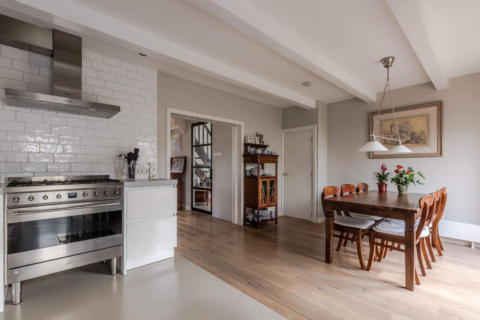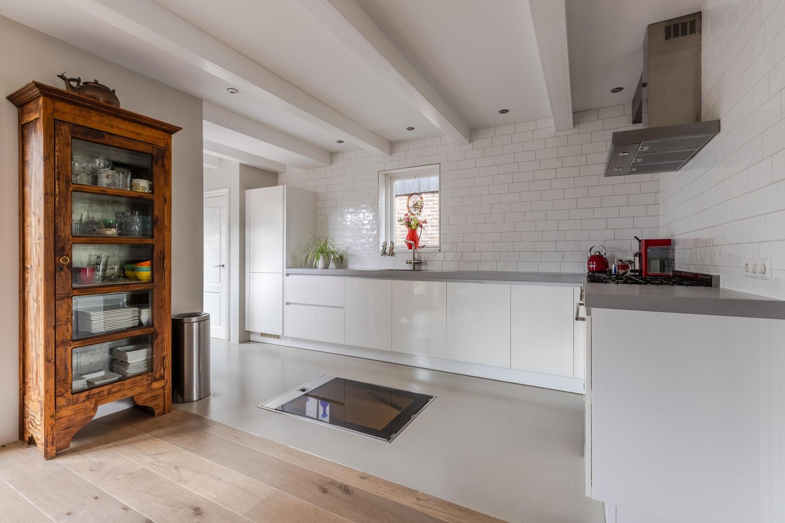 De moderne keuken in L-opstelling is voorzien van diverse inbouwapparatuur, waaronder een koelkast, een vrieskast, vaatwasmachine, kookplaat, afzuigkap, brede oven, quooker en veel opbergruimte. In de keukenvloer biedt een glazen RVS-deksel toegang tot een bescheiden (wijn-)kelder.