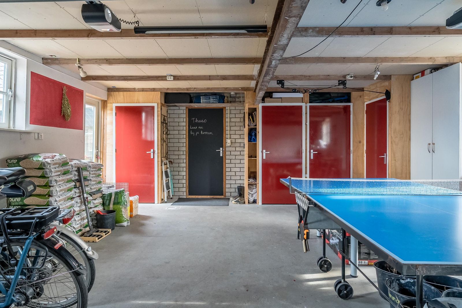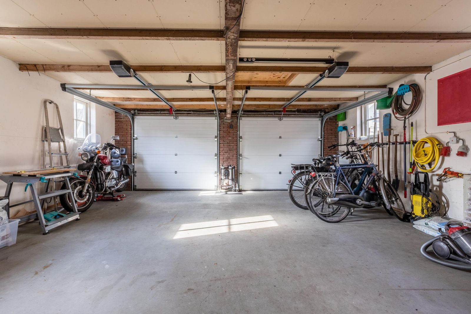 De dubbele garage heeft een oppervlakte van ca. 45 m2, is voorzien van vijf vaste kasten en heeft een inpandige deur, twee elektrische garagedeuren met afstandsbediening, een zijdeur naar de achtertuin, radiator, krachtstroom en een praktische wasbak.