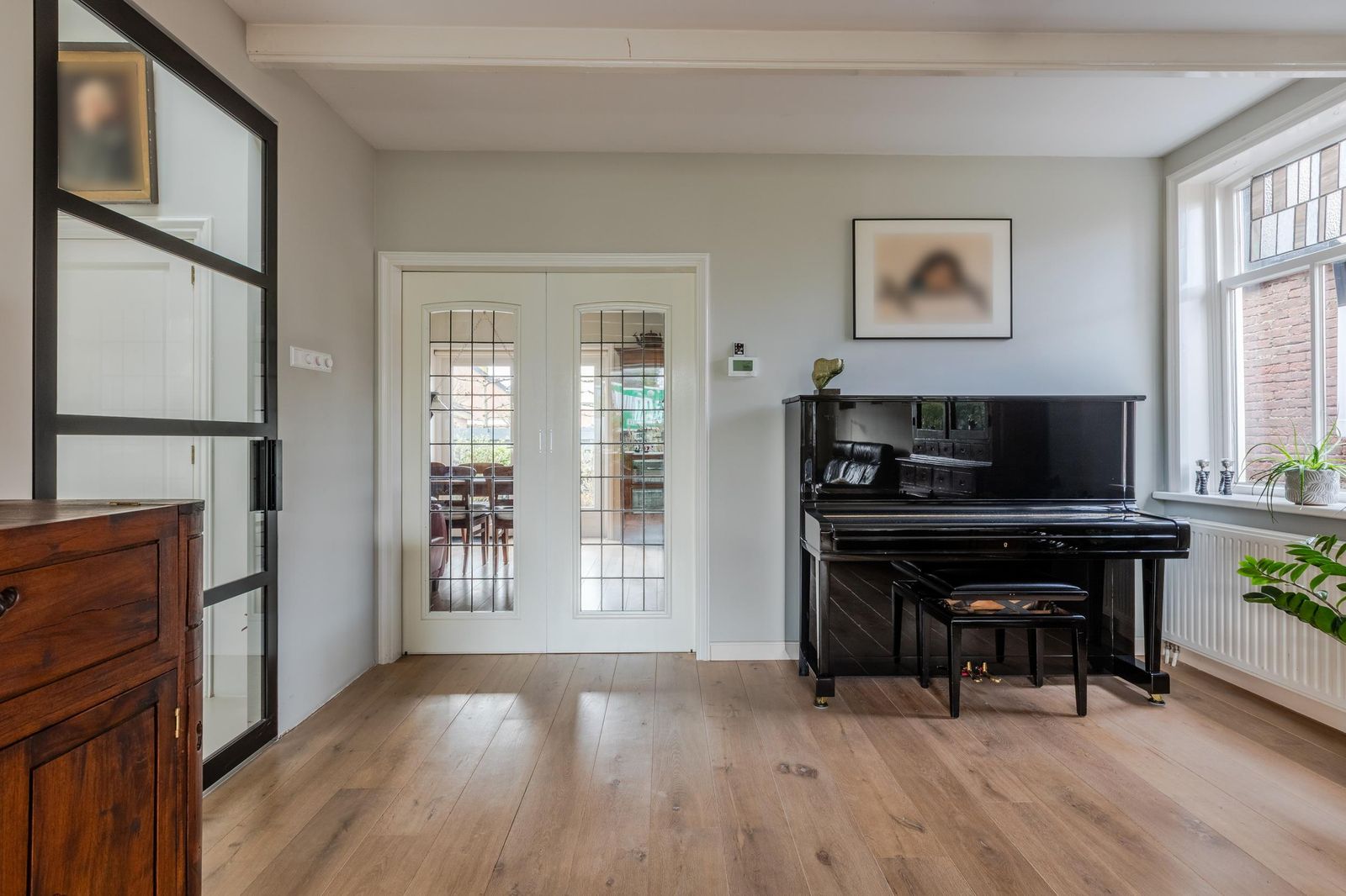 De woonkamer en eetkeuken kunnen van elkaar gescheiden worden door twee glas-in-lood schuifdeuren.