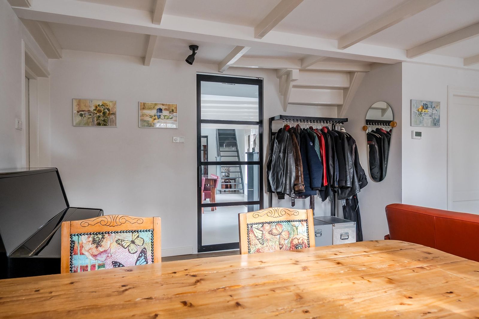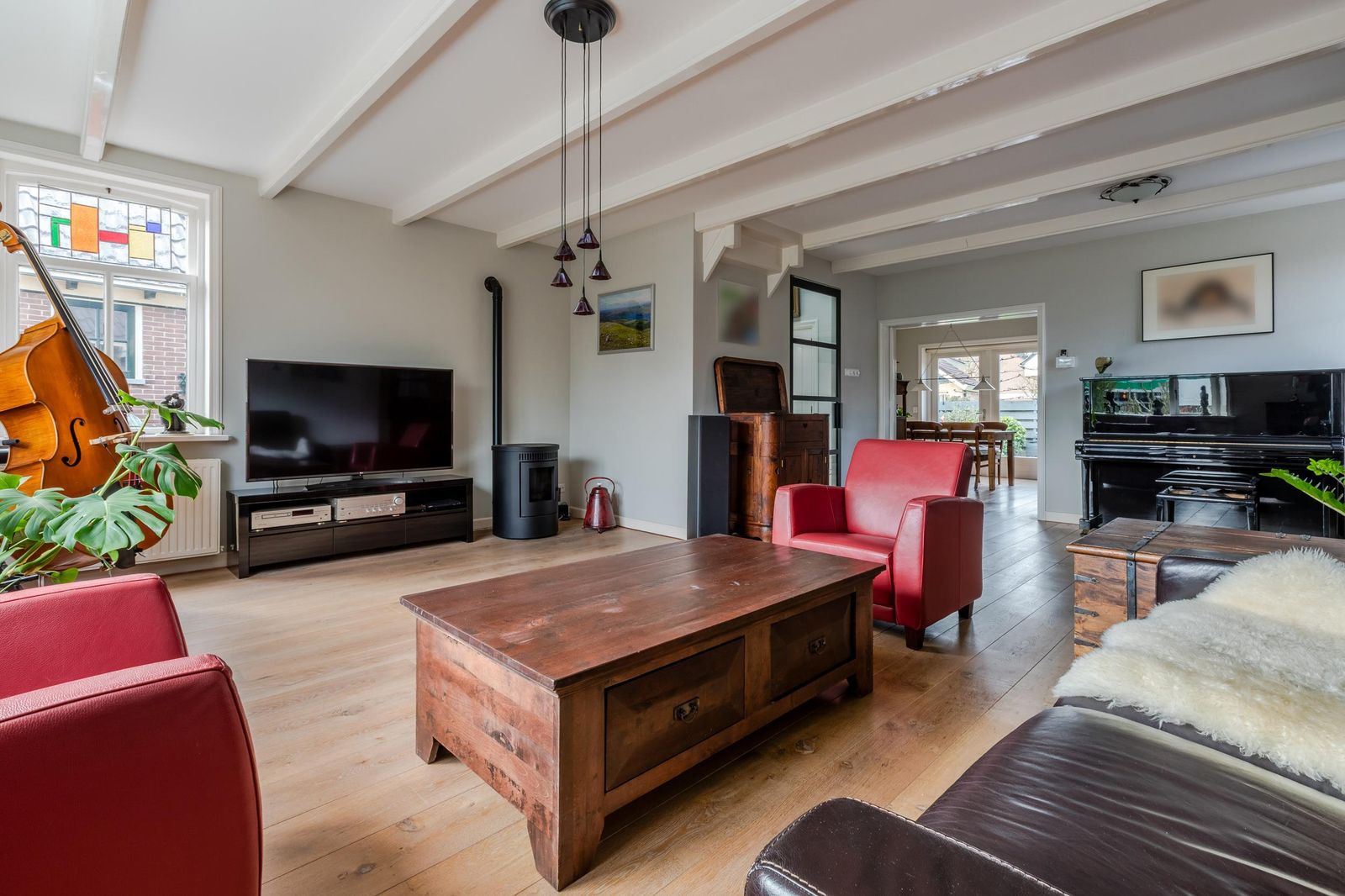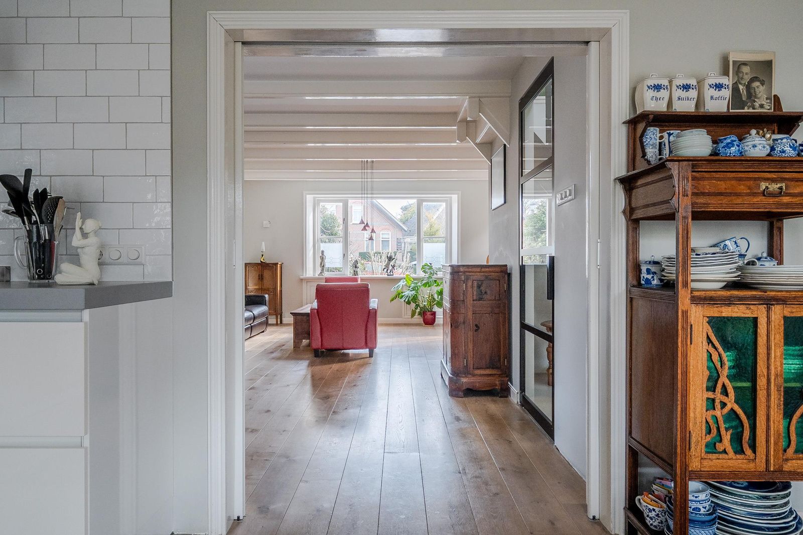 Op de begane grond van het rechterhuis is de ruime woonkamer voorzien van een houten vloer met vloerverwarming en radiatoren, een sfeervolle pelletkachel en praktische opbergkasten onder het voorraam. De houten vloer loopt door tot in de ruime eetkeuken.