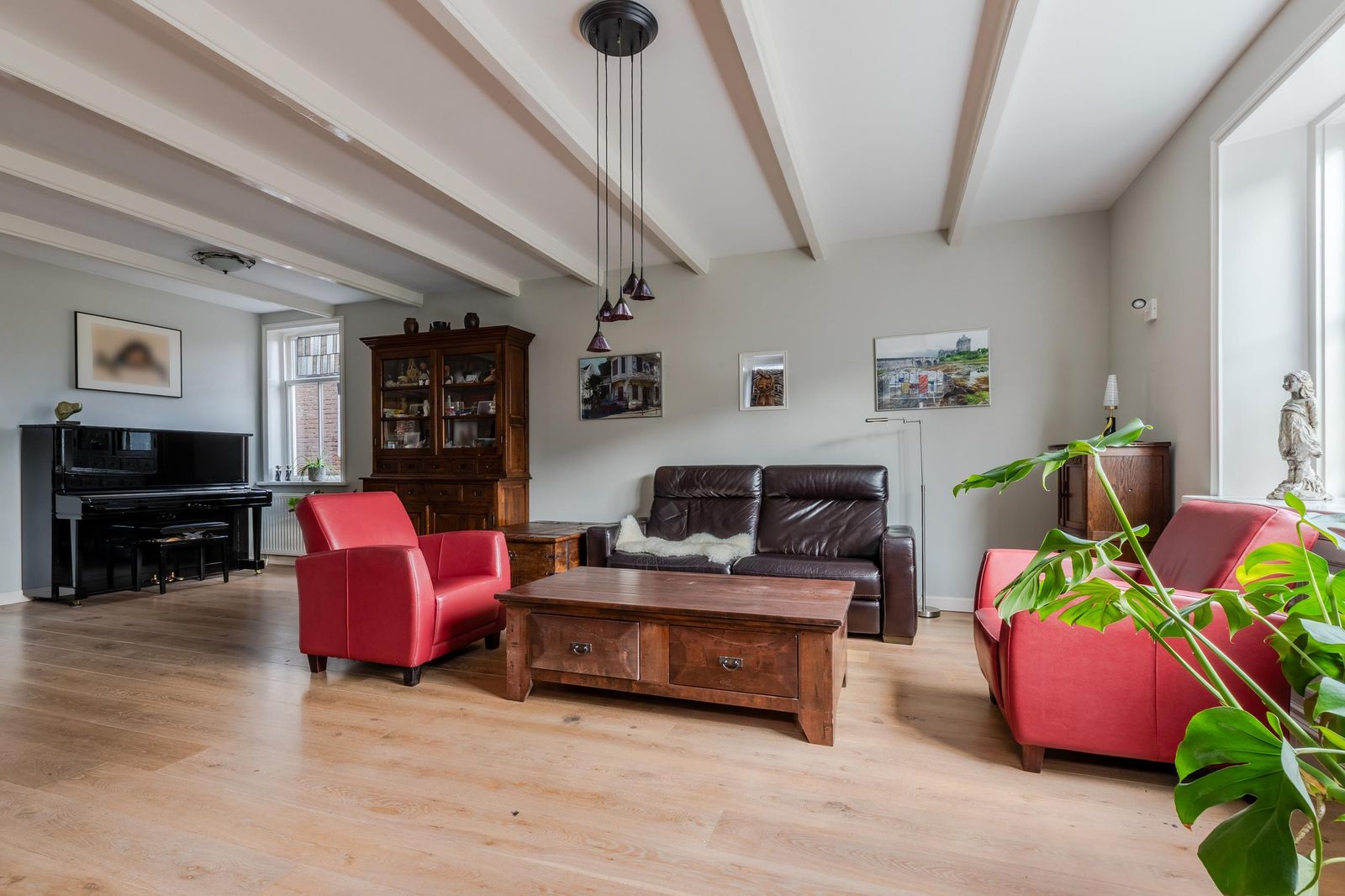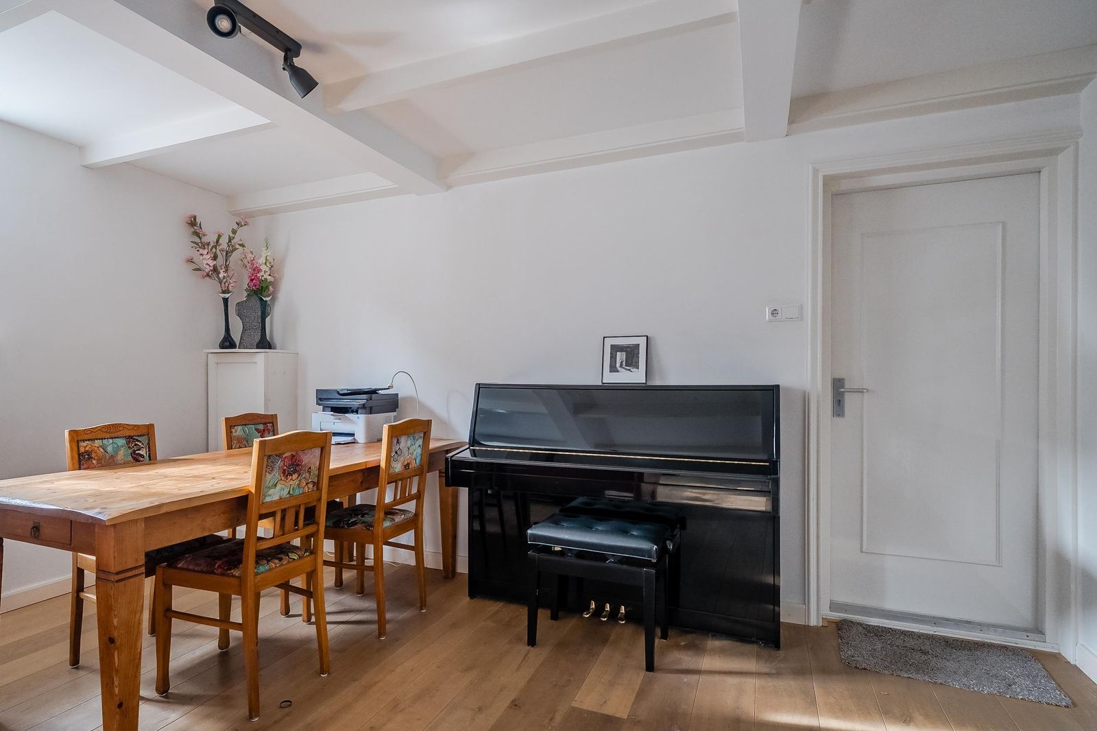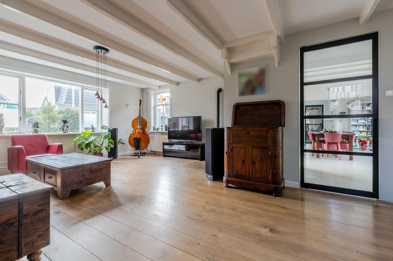 Op de begane grond van het rechterhuis is de ruime woonkamer voorzien van een houten vloer met vloerverwarming en radiatoren, een sfeervolle pelletkachel en praktische opbergkasten onder het voorraam. De houten vloer loopt door tot in de ruime eetkeuken.