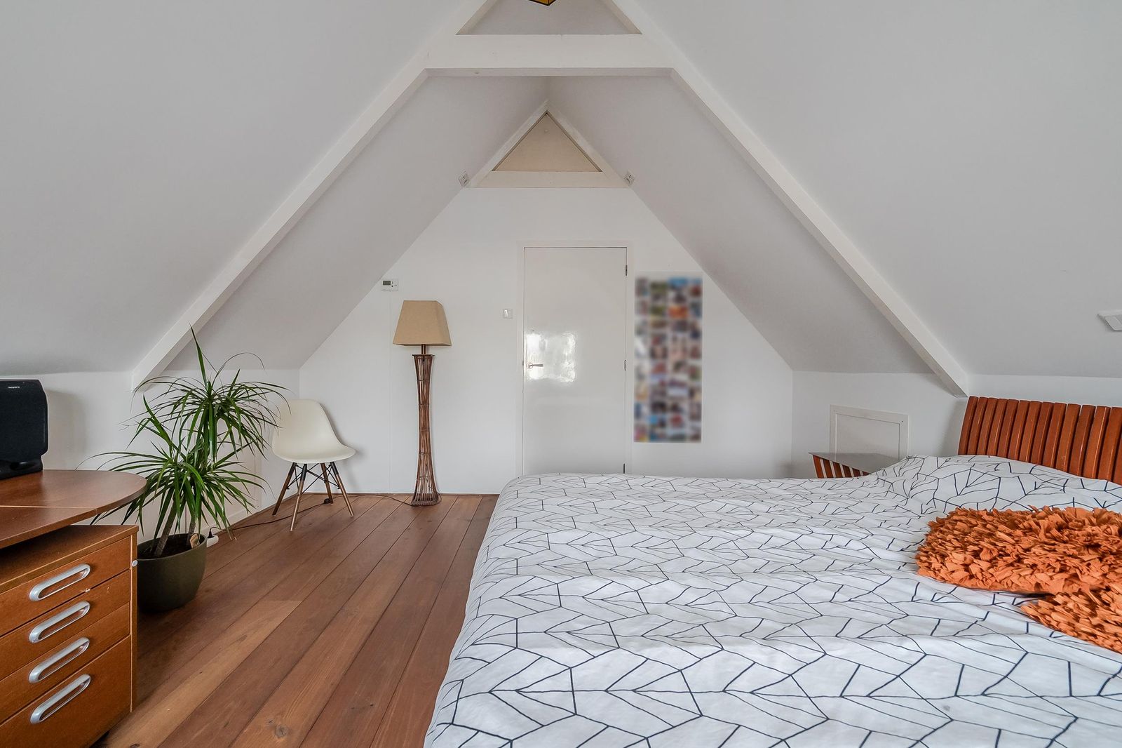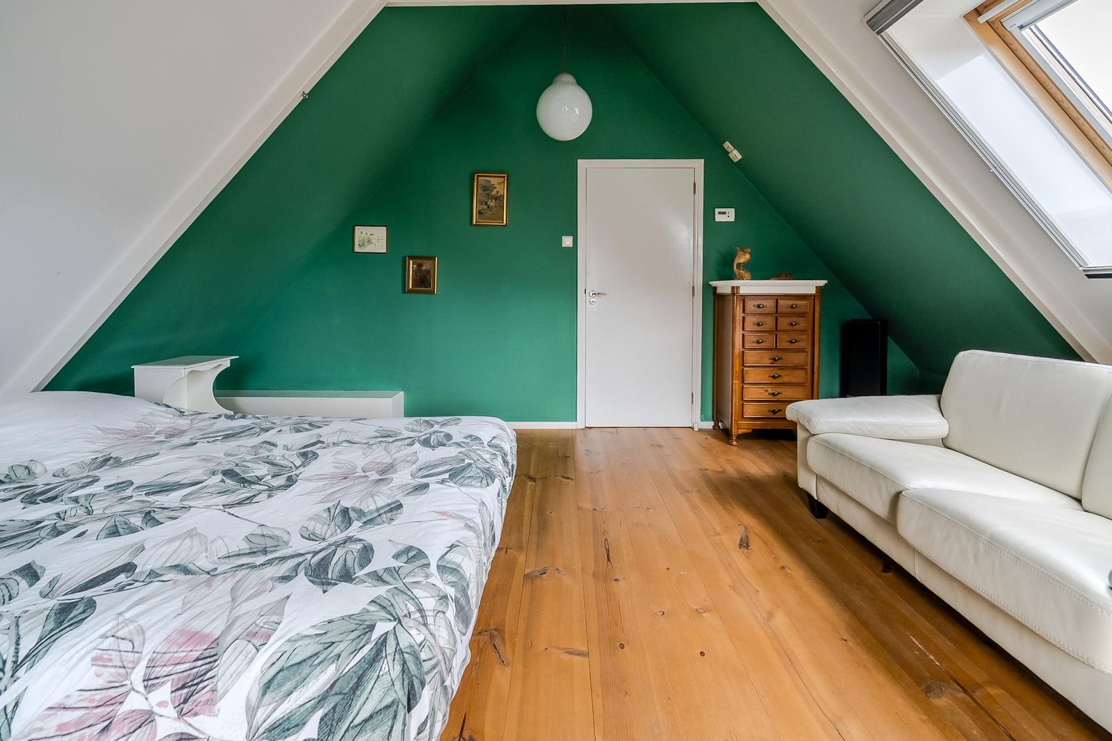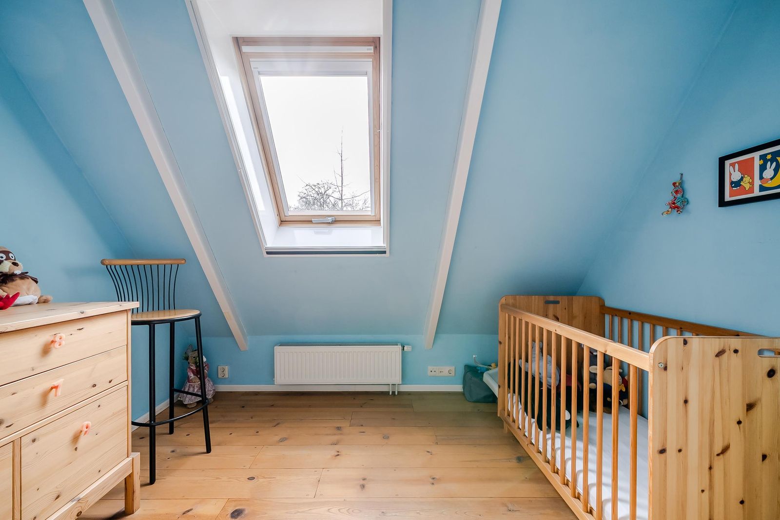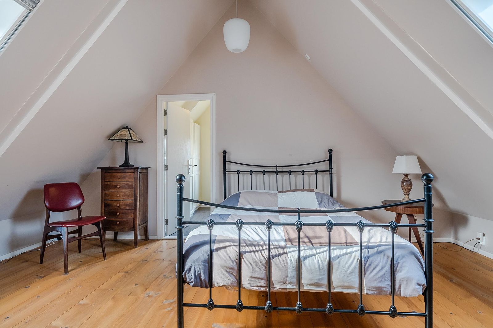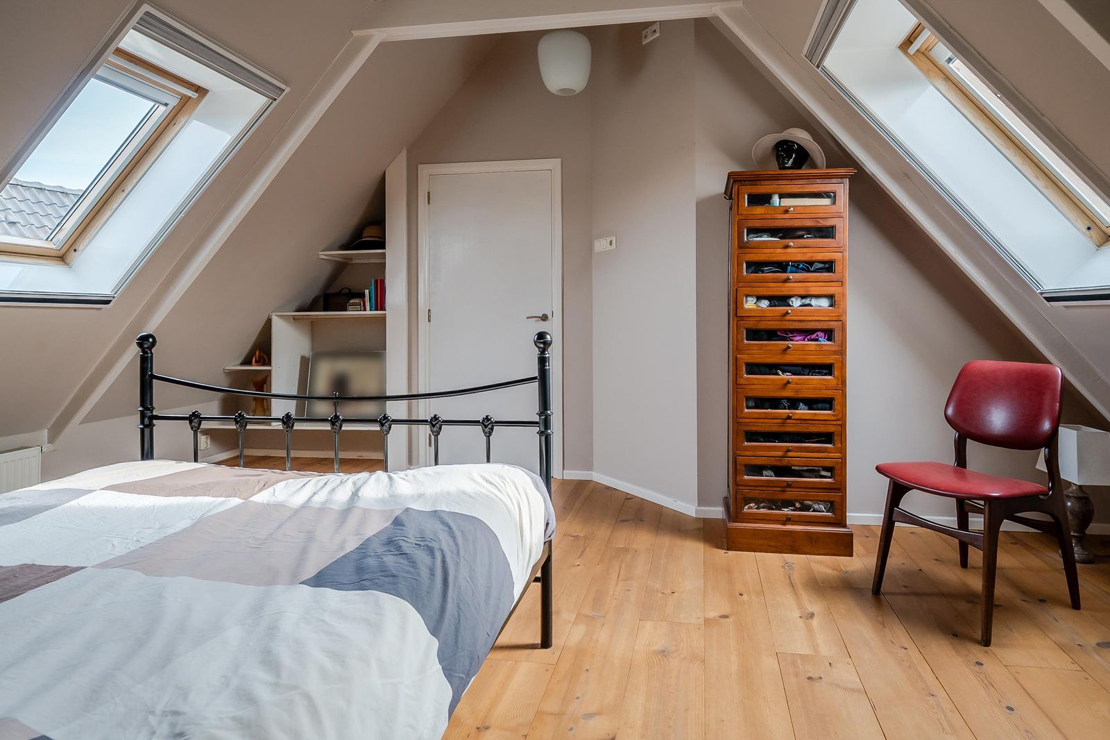 De trap naar de eerste verdieping van het rechterhuis komt uit op de overloop, die toegang geeft tot een badkamer, twee ruime slaapkamers (4 bij 4 meter) en een charmante kleine vide. De slaapkamers zijn aan beide zijdes voorzien van praktische bergruimte achter de knieschotten en radiatoren stofvrij verborgen achter een ombouw. De badkamer is voorzien van douche, ligbad, wc en wastafel.