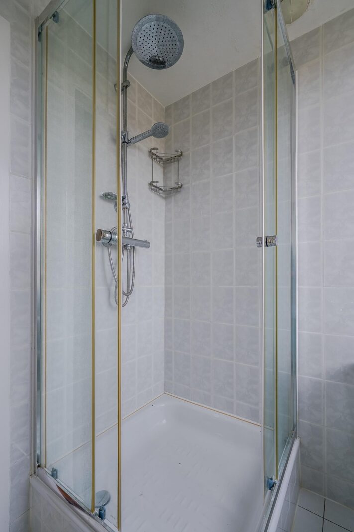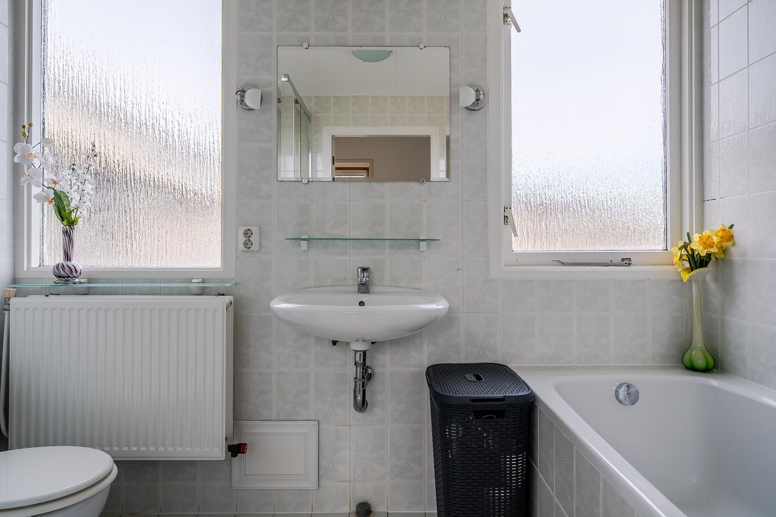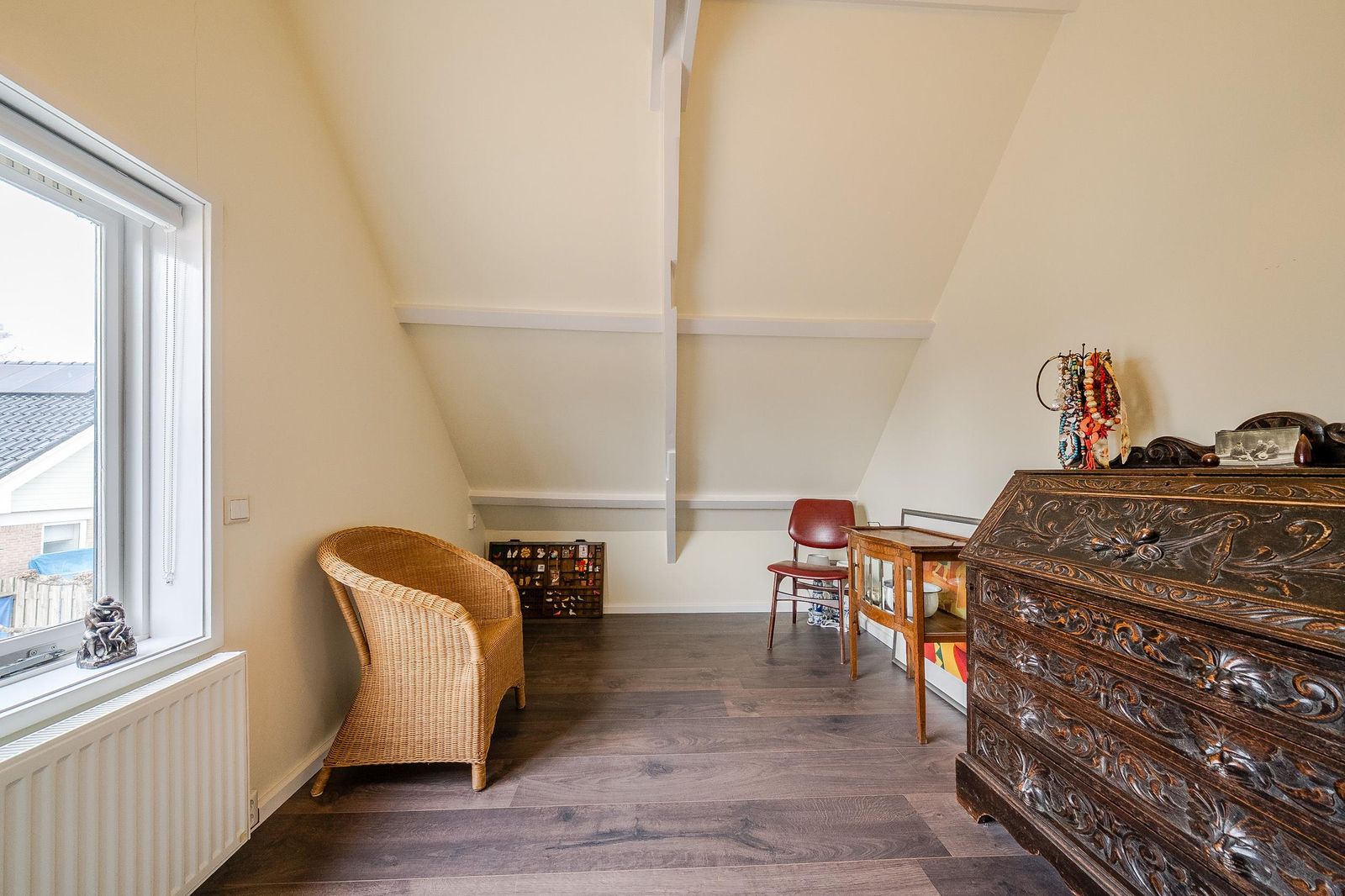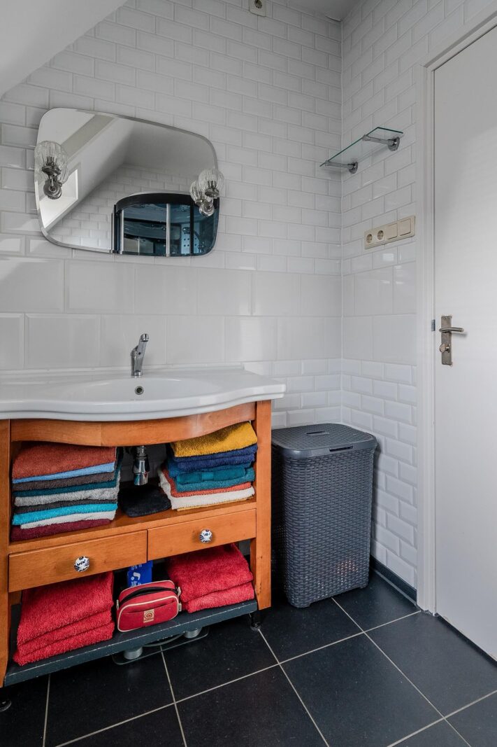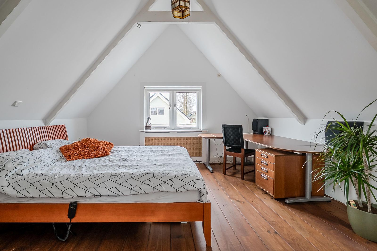 De trap naar de eerste verdieping van het rechterhuis komt uit op de overloop, die toegang geeft tot een badkamer, twee ruime slaapkamers (4 bij 4 meter) en een charmante kleine vide. De slaapkamers zijn aan beide zijdes voorzien van praktische bergruimte achter de knieschotten en radiatoren stofvrij verborgen achter een ombouw. De badkamer is voorzien van douche, ligbad, wc en wastafel.