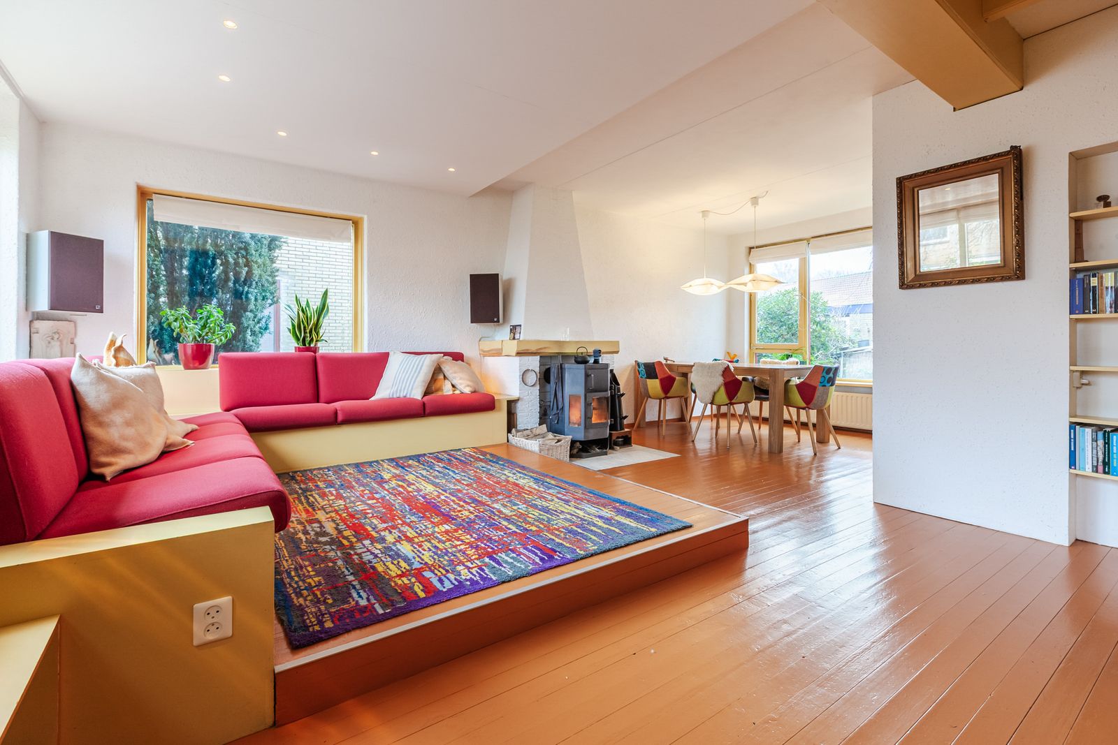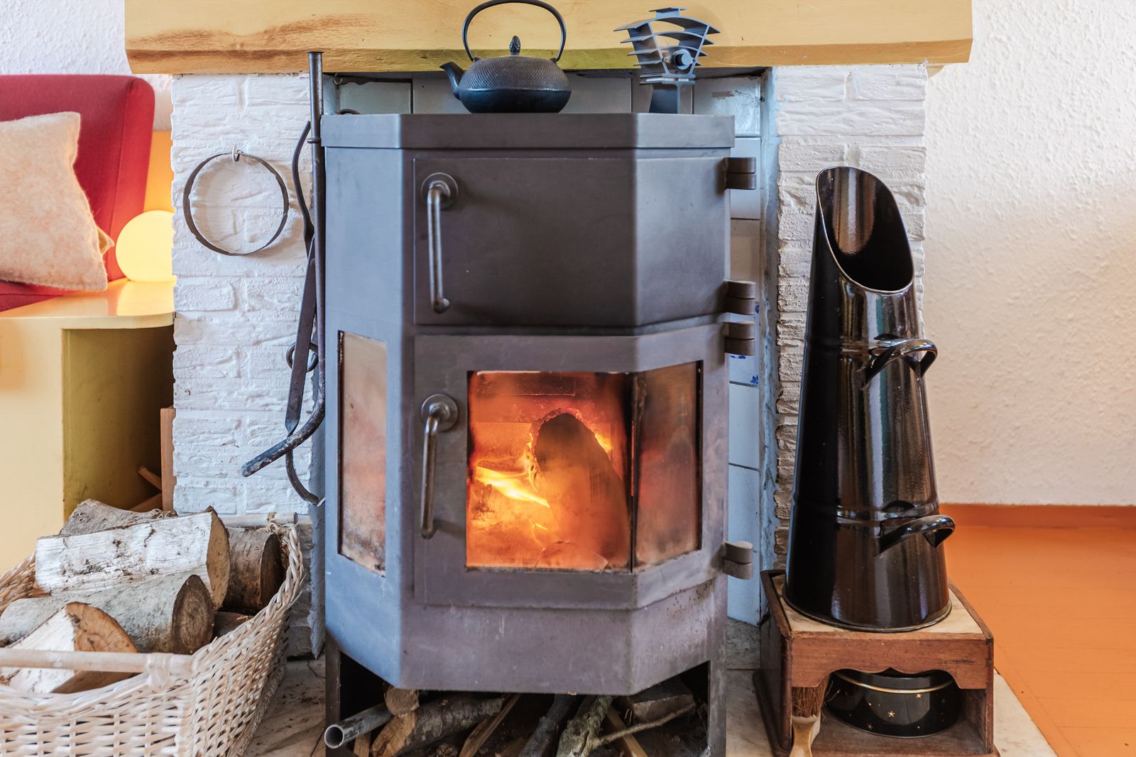 De houten vloer en de houtkachel zorgen voor een warme uitstraling.
