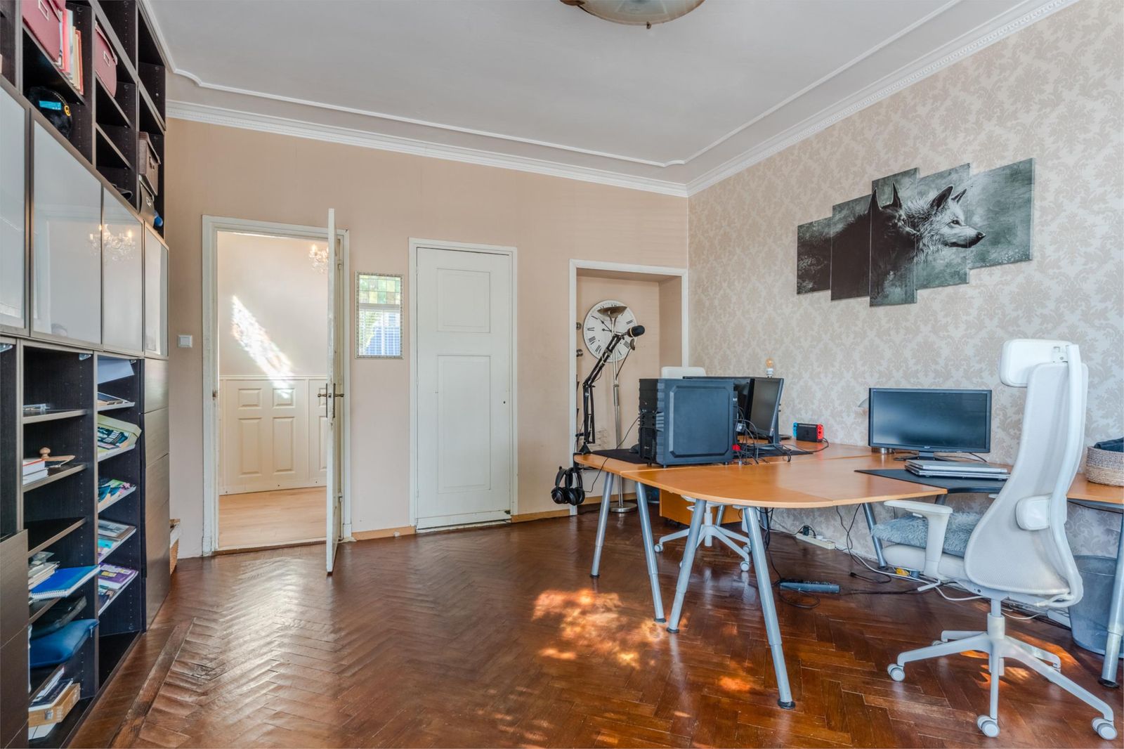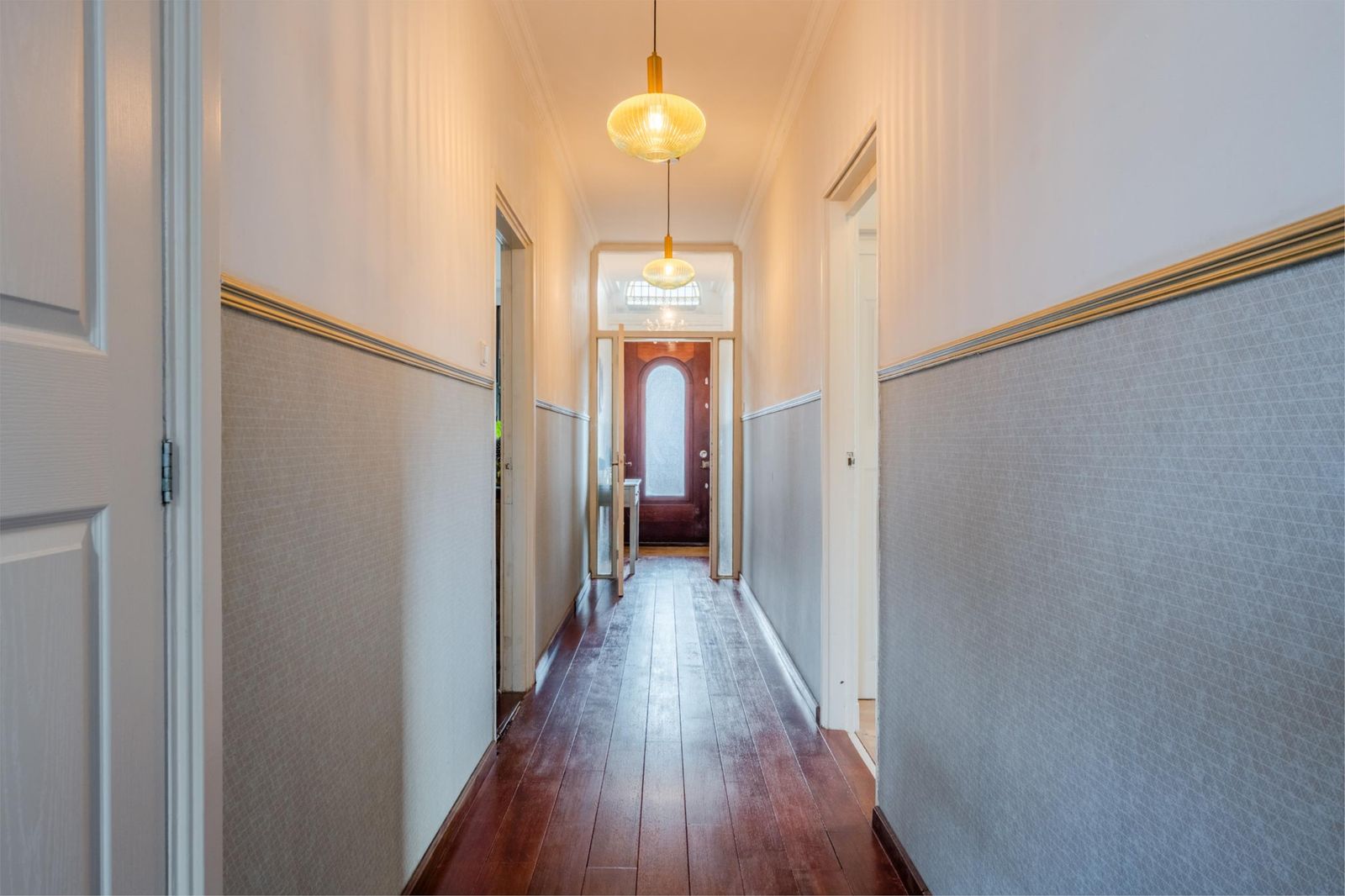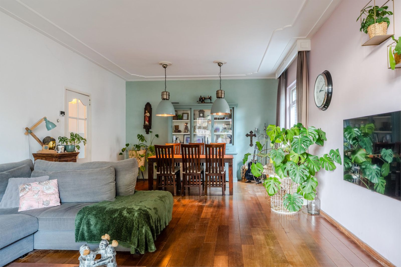 U wordt verwelkomd in een stijlvolle entree met hoge plafonds en klassieke details. De woonkamer is licht, ruim en sfeervol, met glas-in-loodramen, houten vloeren en plafondlijsten die direct de grandeur van begin vorige eeuw oproepen.