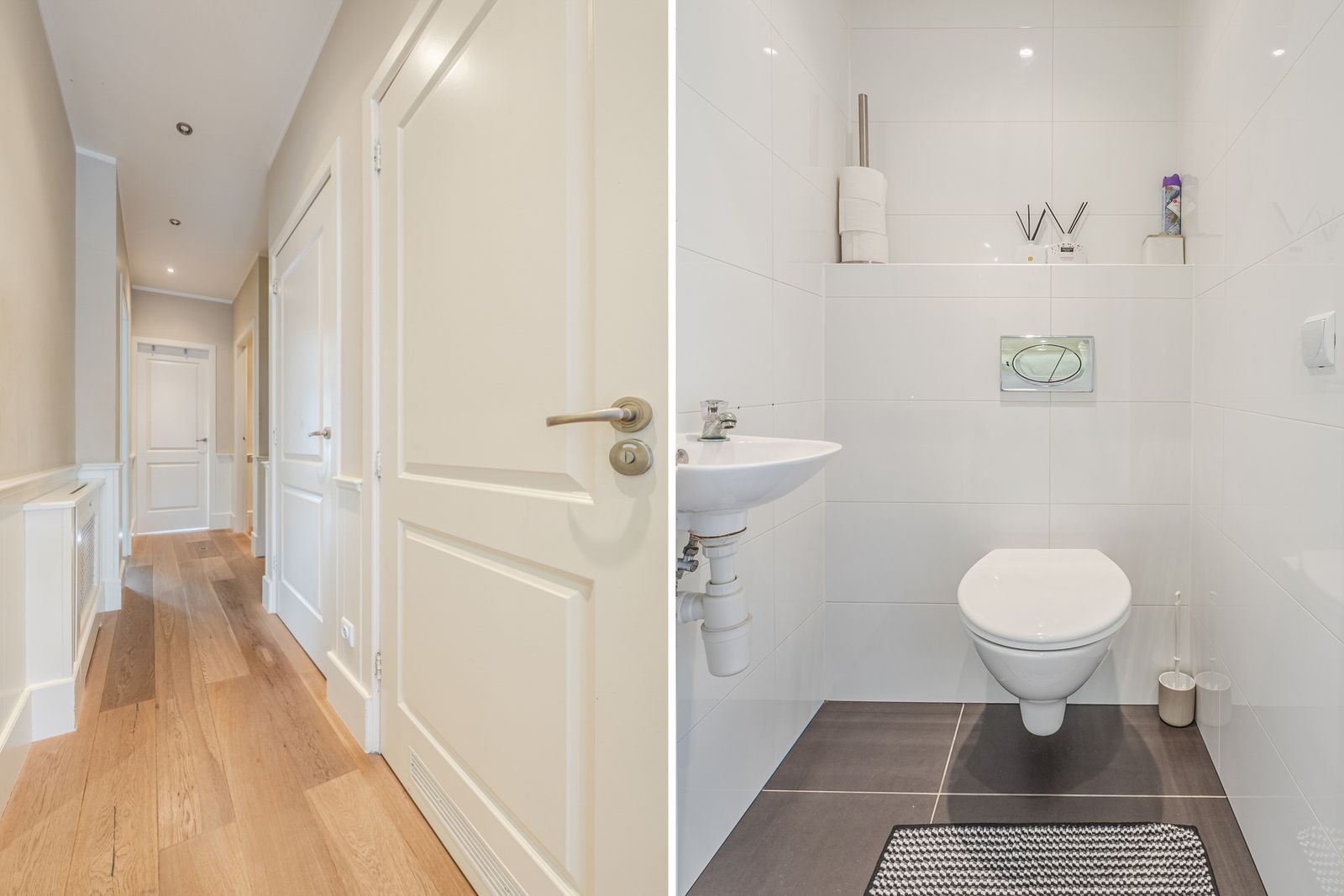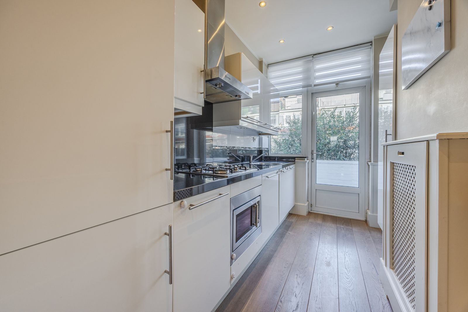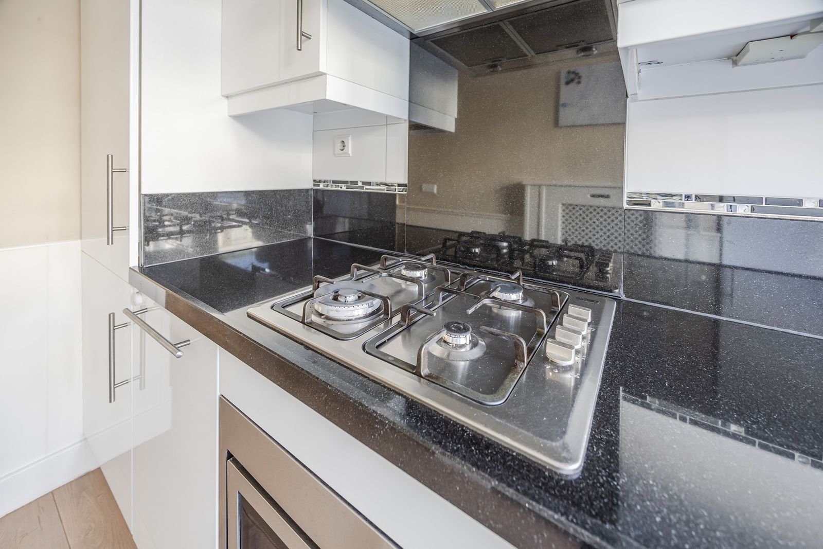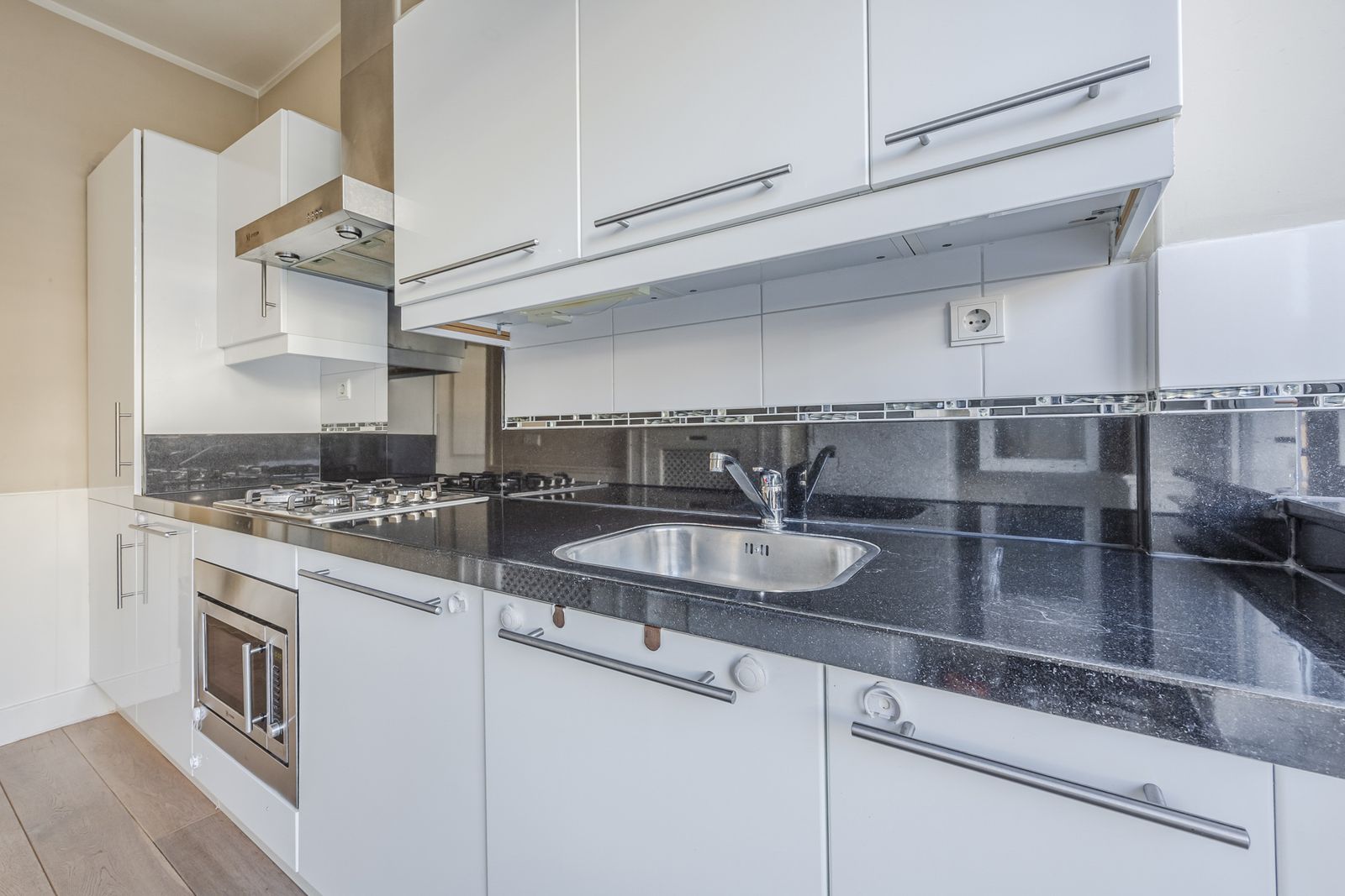Entree via afgesloten portiek, tochtportaal, gang met bergkast en modern toilet (wandcloset) met fontein. Ruime en lichte woonkamer (ca. 6.10 x 3.50) met erker en fraai vrij uitzicht aan de voorzijde. Luxe semi-open rechte keuken (ca. 3.85 x 1.70) met natuurstenen werkblad, 4-pits kookplaat, afzuigkap, combi magnetron/oven, koelkast, vriezer en vaatwasser. Kast met opstelplaats cv-ketel (AWB HR, 2013) en toegang tot het balkon.