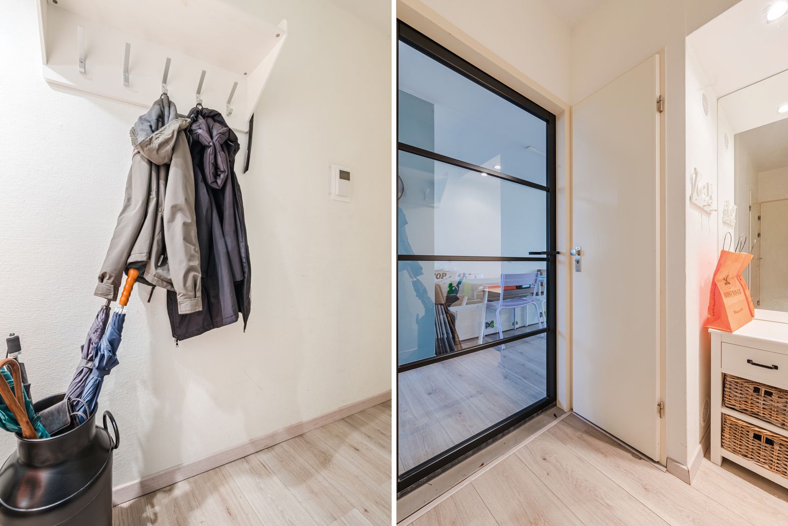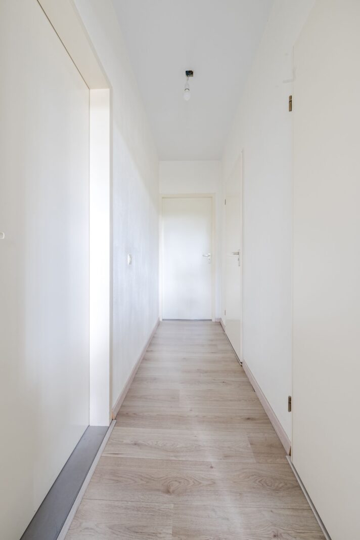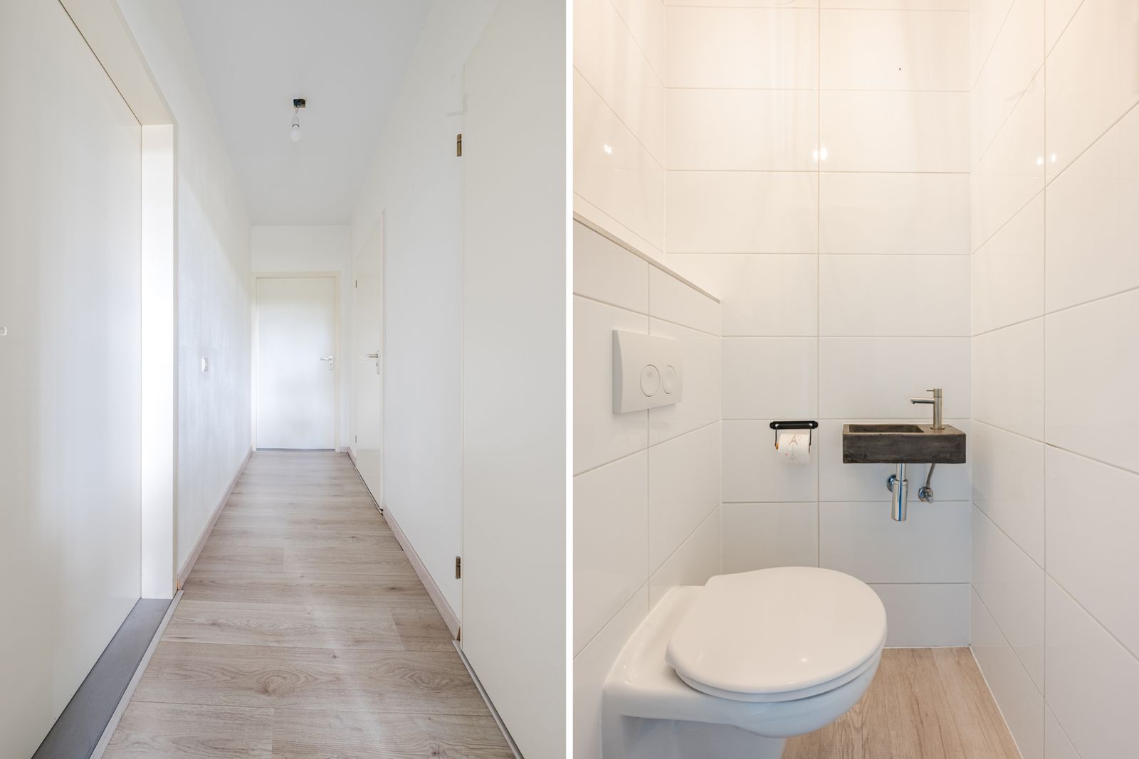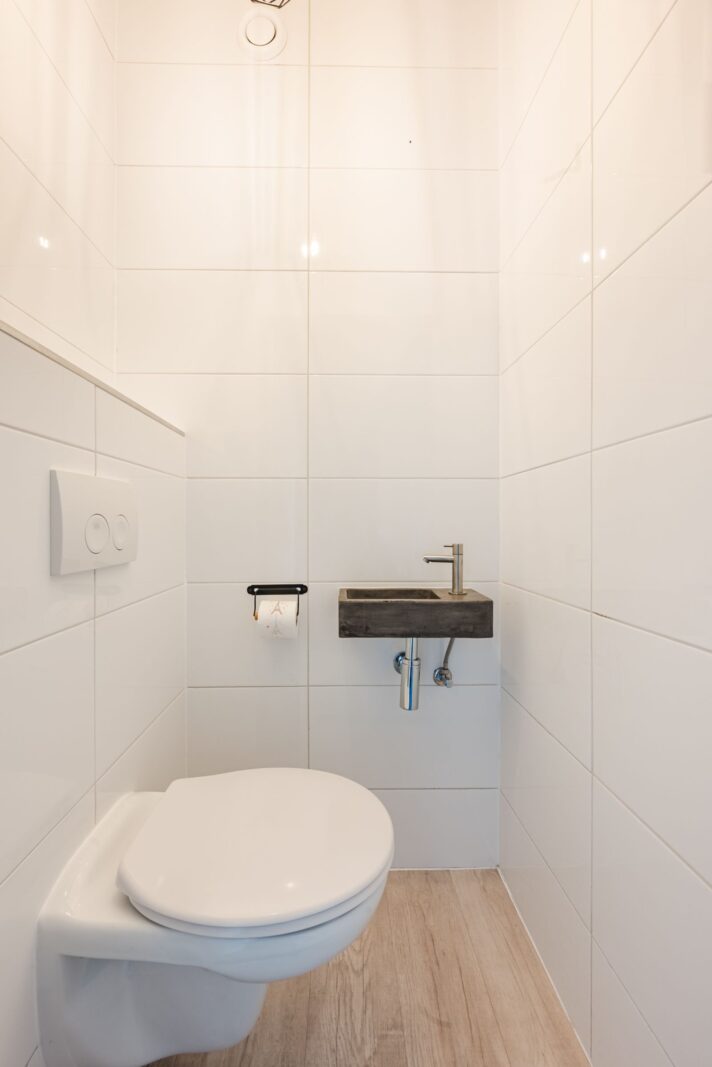 Vanuit de woonkamer is er toegang tot een hal. Hier bevindt zich een separaat toiletruimte met zwevend toilet.