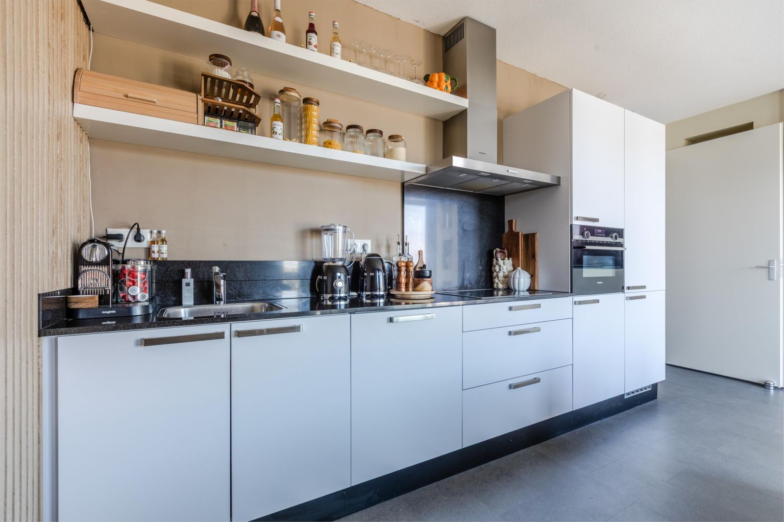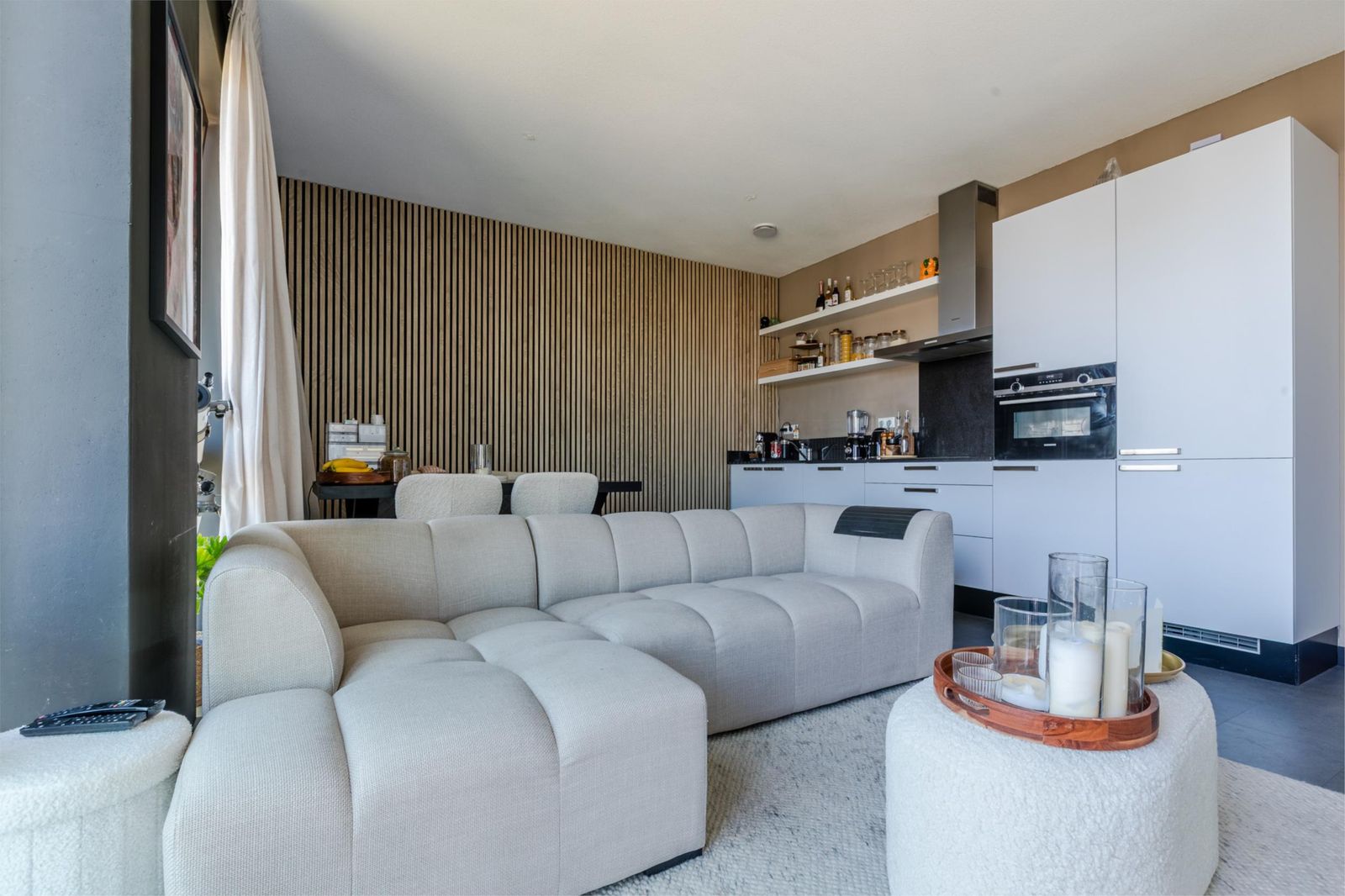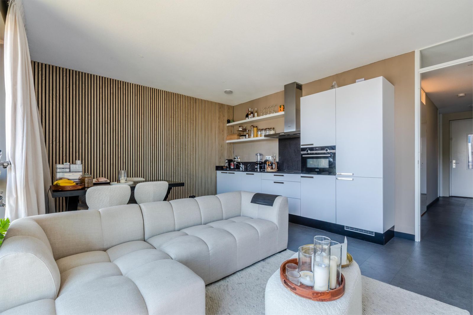 De woonkamer met open keuken strekt zich uit over de volledige breedte van het appartement. Grote raampartijen zorgen voor veel licht en een fantastisch uitzicht. De openslaande deuren leiden , naar een ruim balkon: een heerlijke plek voor je ochtendkoffie of een ontspannen avond.