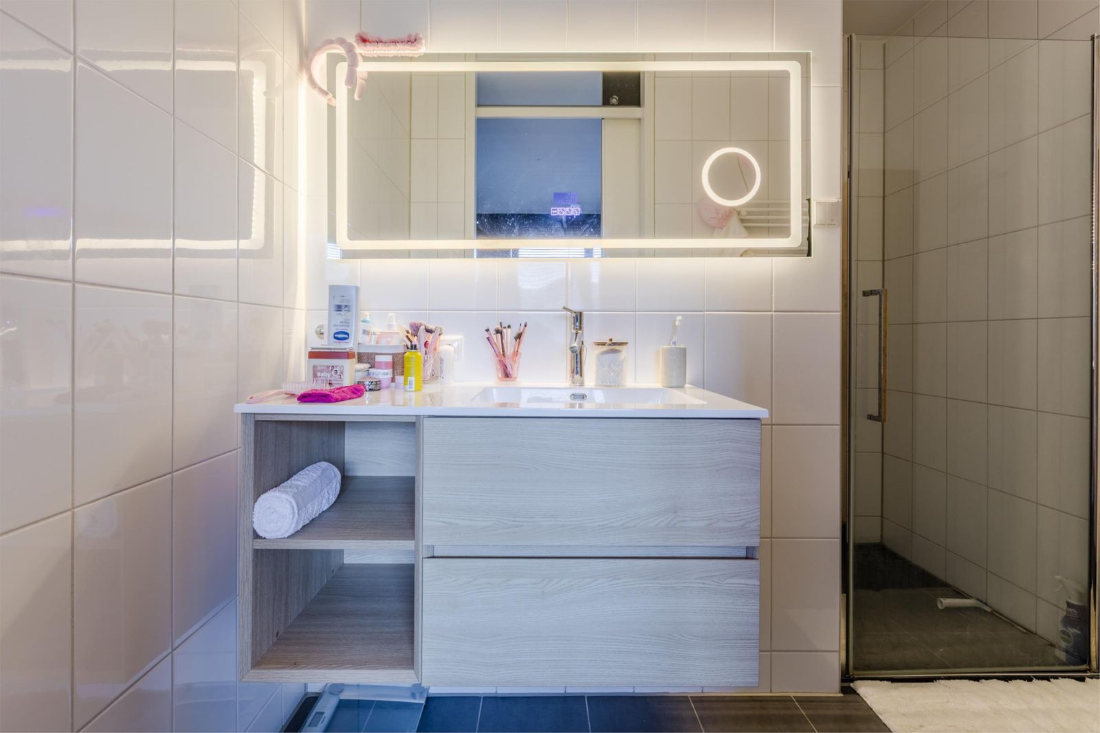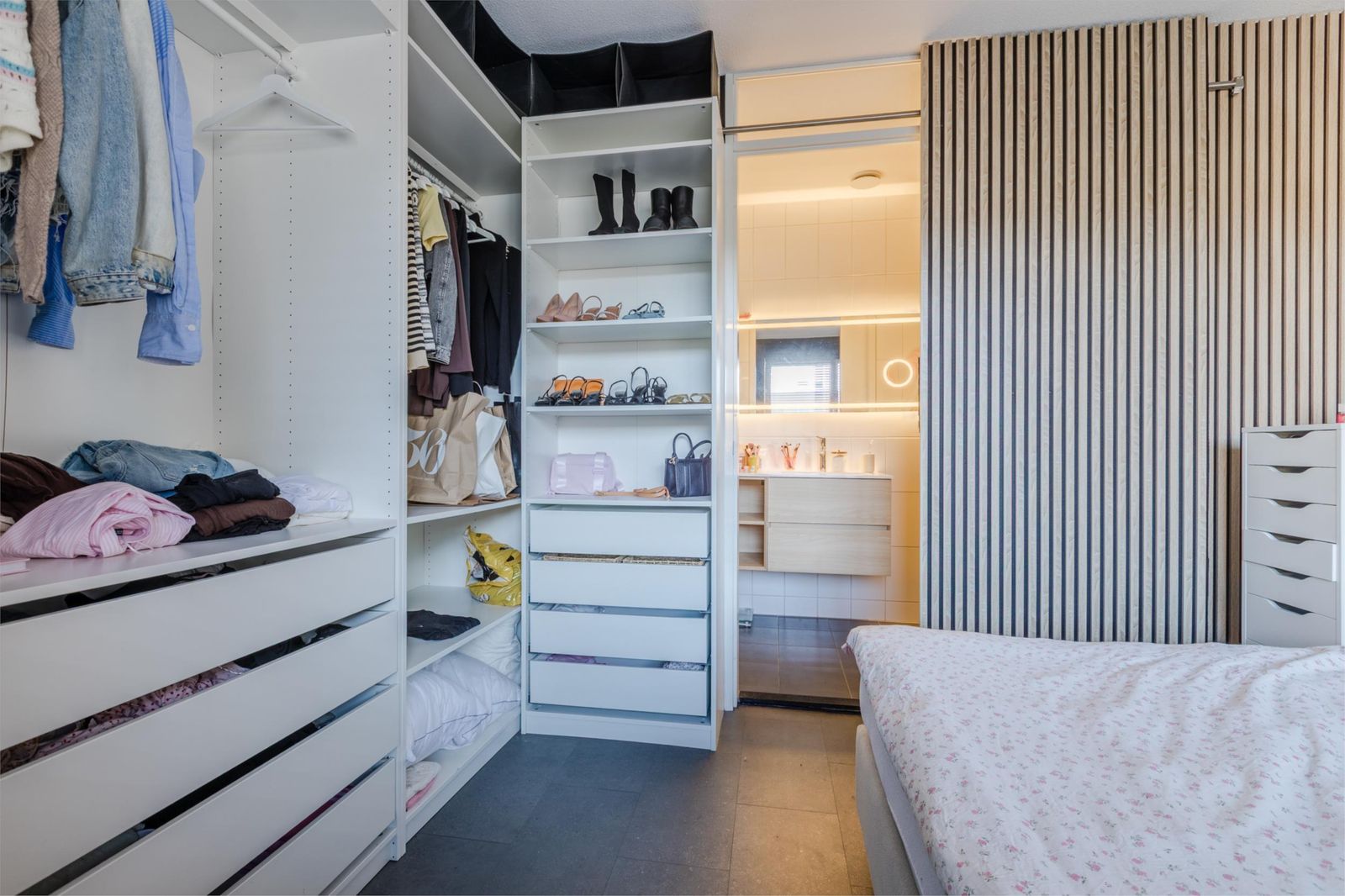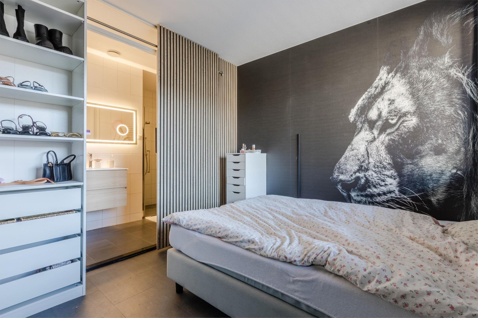 De slaapkamer is ruim genoeg voor een tweepersoonsbed en biedt toegang tot de badkamer, die is uitgerust met een moderne wastafel en een inloopdouche.