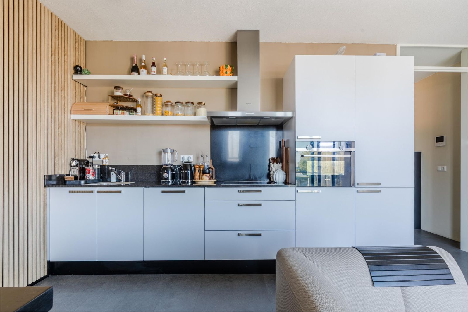 De keuken heeft een rechte opstelling en is voorzien van moderne inbouwapparatuur, waaronder inductiekookplaat, afzuigkap, combi-oven, koel-vriescombinatie en vaatwasser. Er is voldoende ruimte voor een royale eettafel.