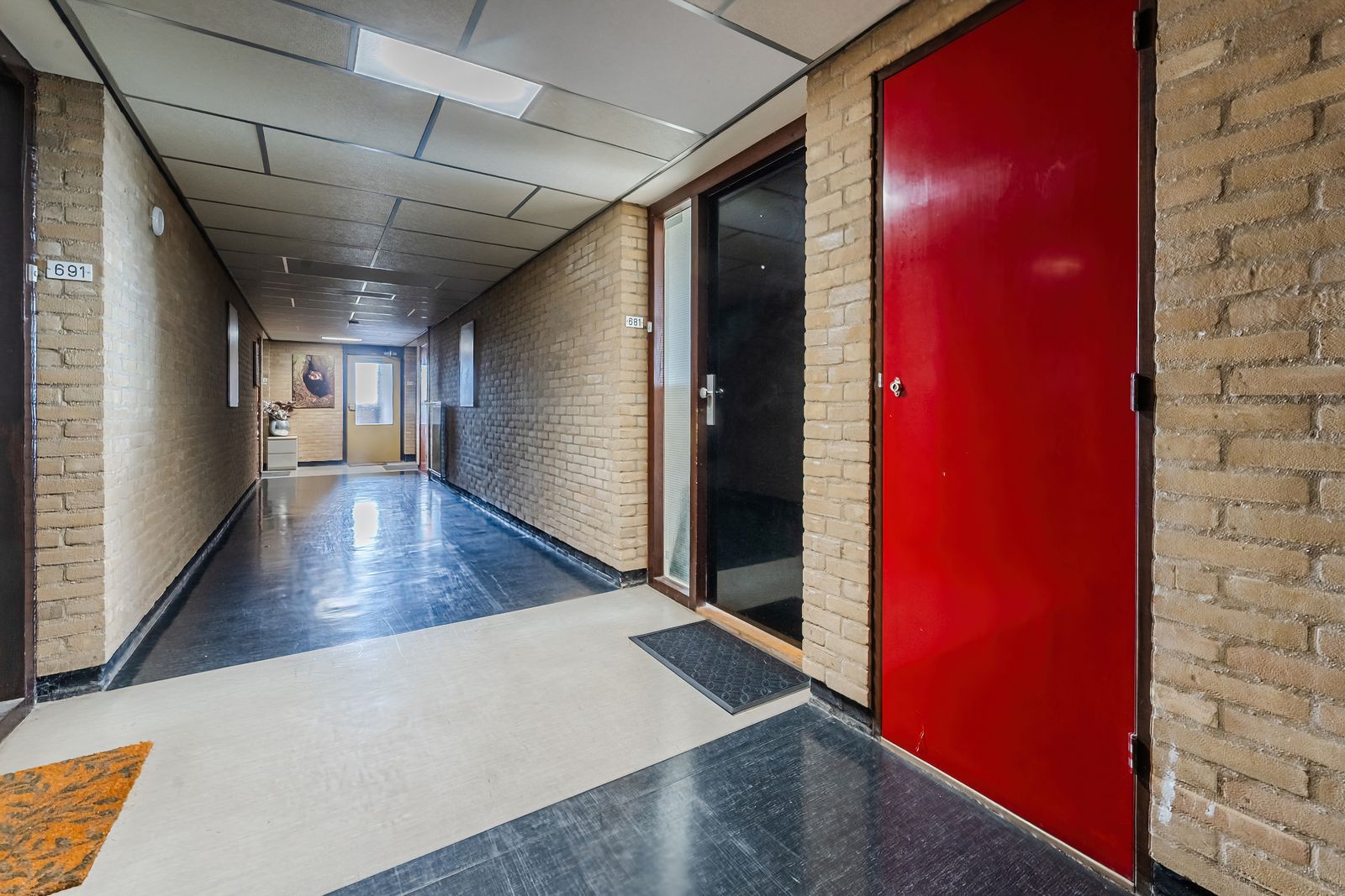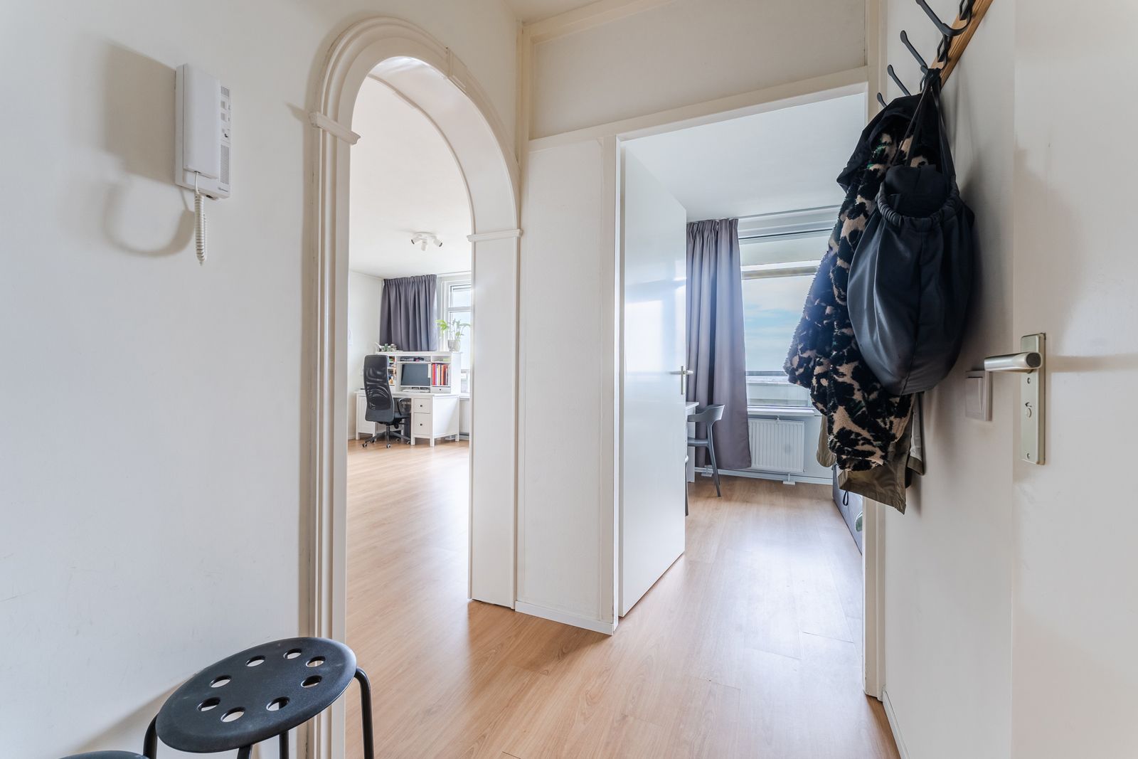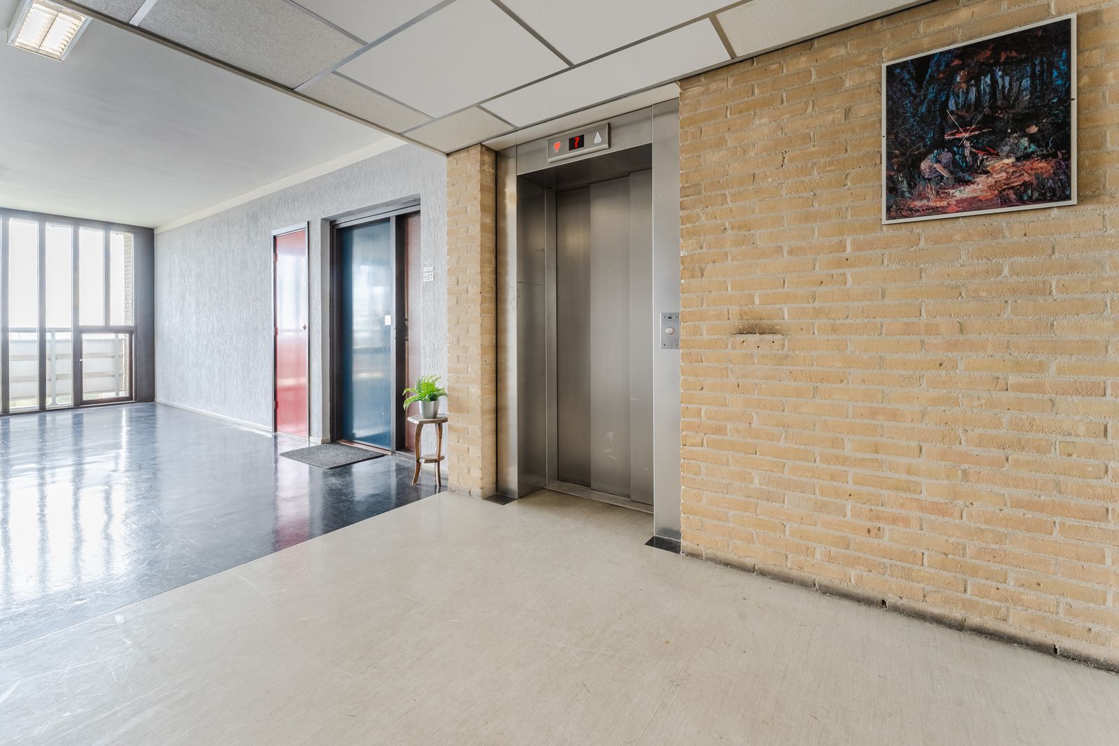 Mooie laminaatvloer en strakke stucwanden. Nette entree op begane grond en brede gemeenschappelijke binnengang op de 9e etage, waaraan het appartement ligt.