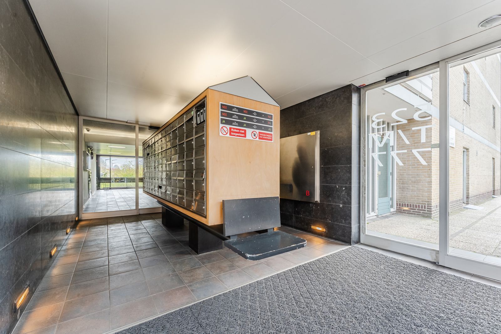 Parterre: openbare parkeerplaats, tevens wat parkeerplekken voor de flat, eigen berging, gemeenschappelijke fietsenberging, entree, bellentableau, brievenbussen, intercom, afgesloten toegang tot de 2 liften (voor even en oneven etages) en trappenhuis.