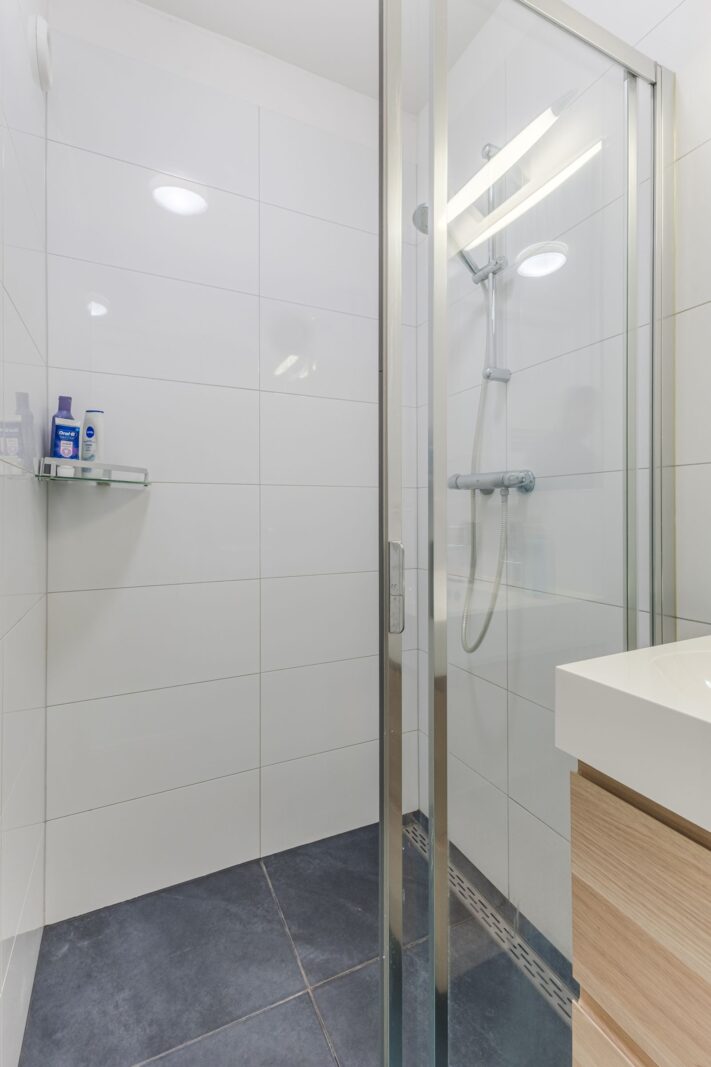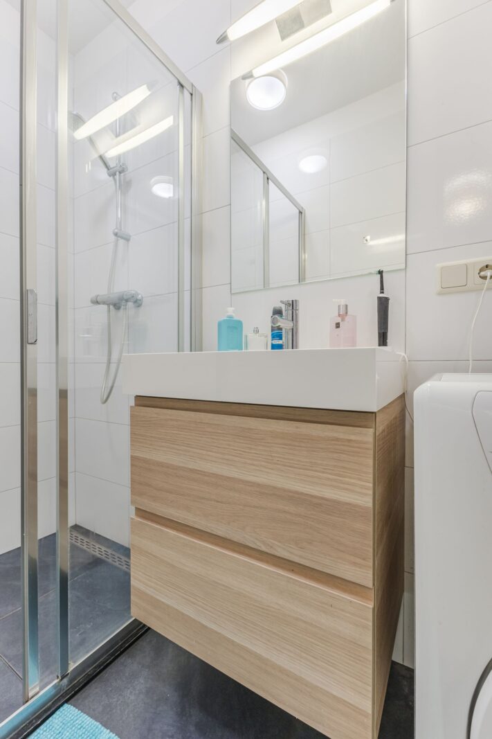 Aan de achterzijde van de woning bevinden zich twee goed bemeten slaapkamers. De moderne badkamer is uitgerust met een inloopdouche met glazen schuifdeur, wastafelmeubel en aansluitingen voor wasmachine en droger. Tevens bevindt zich hier de elektrische boiler (80 liter).