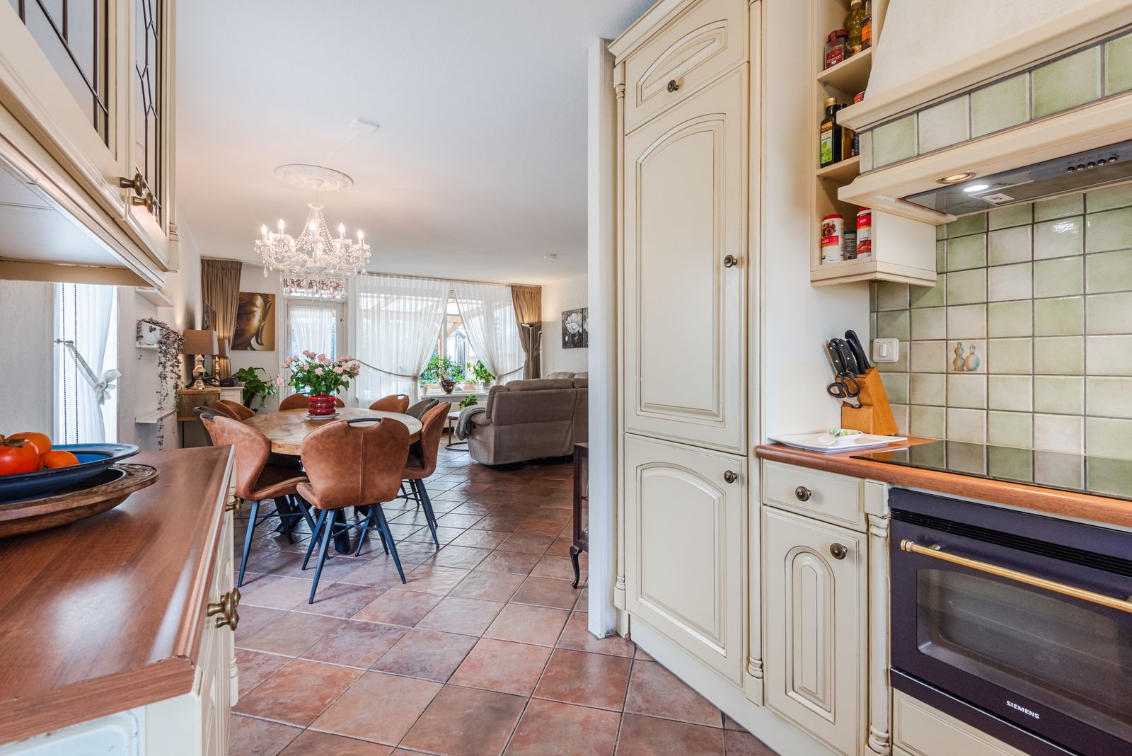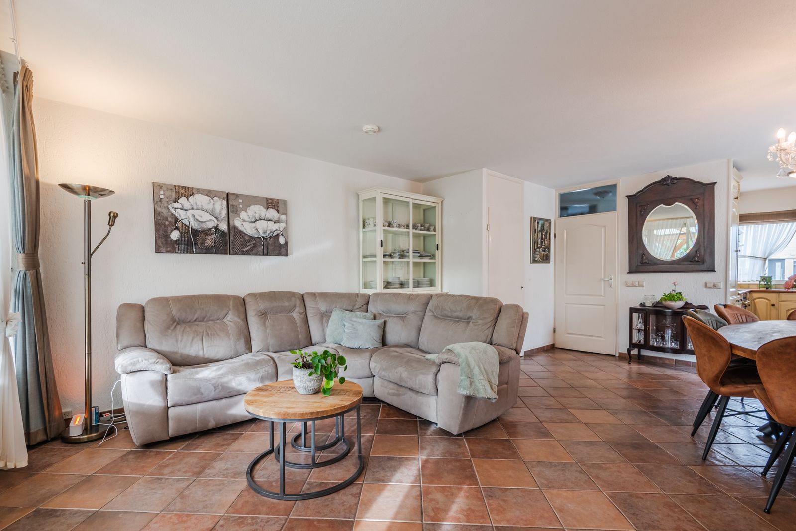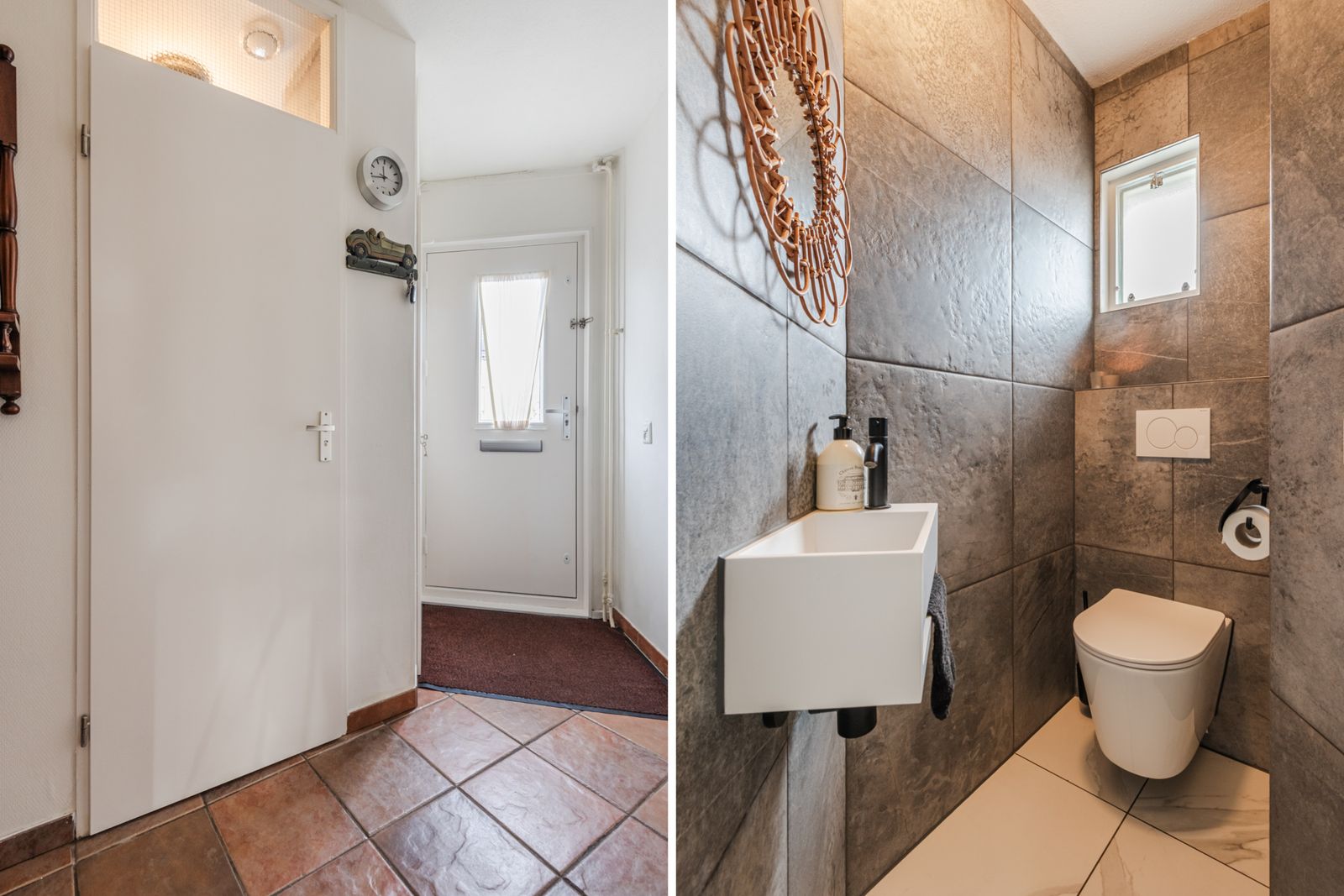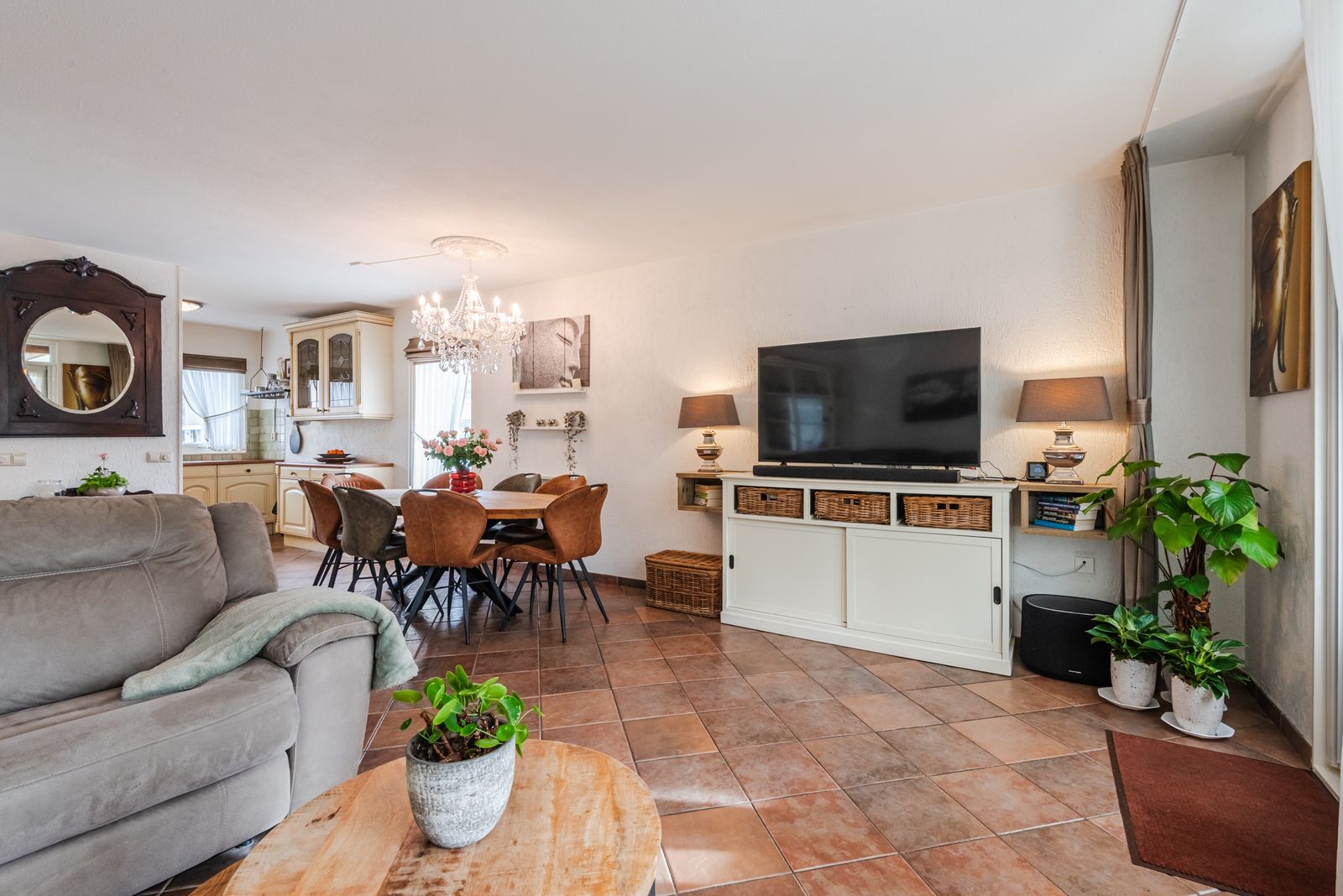 Entree met hal, meterkast en modern vrij hangend toilet. De woonkamer is tuingericht, beschikt over een voorraadkast en een deur naar de zonnige achtertuin. Voorin is de in landelijk gestijlde open keuken gesitueerd, met praktische L-vormige opstelling en voorzien van inductiekookplaat, afzuigkap, vaatwasser (allen uit 2022), combi oven-magnetron, koelkast en vriezer . De begane grond is afgewerkt met een plavuizenvloer (met vloerverwarming) en pleisterwerk op de wanden.