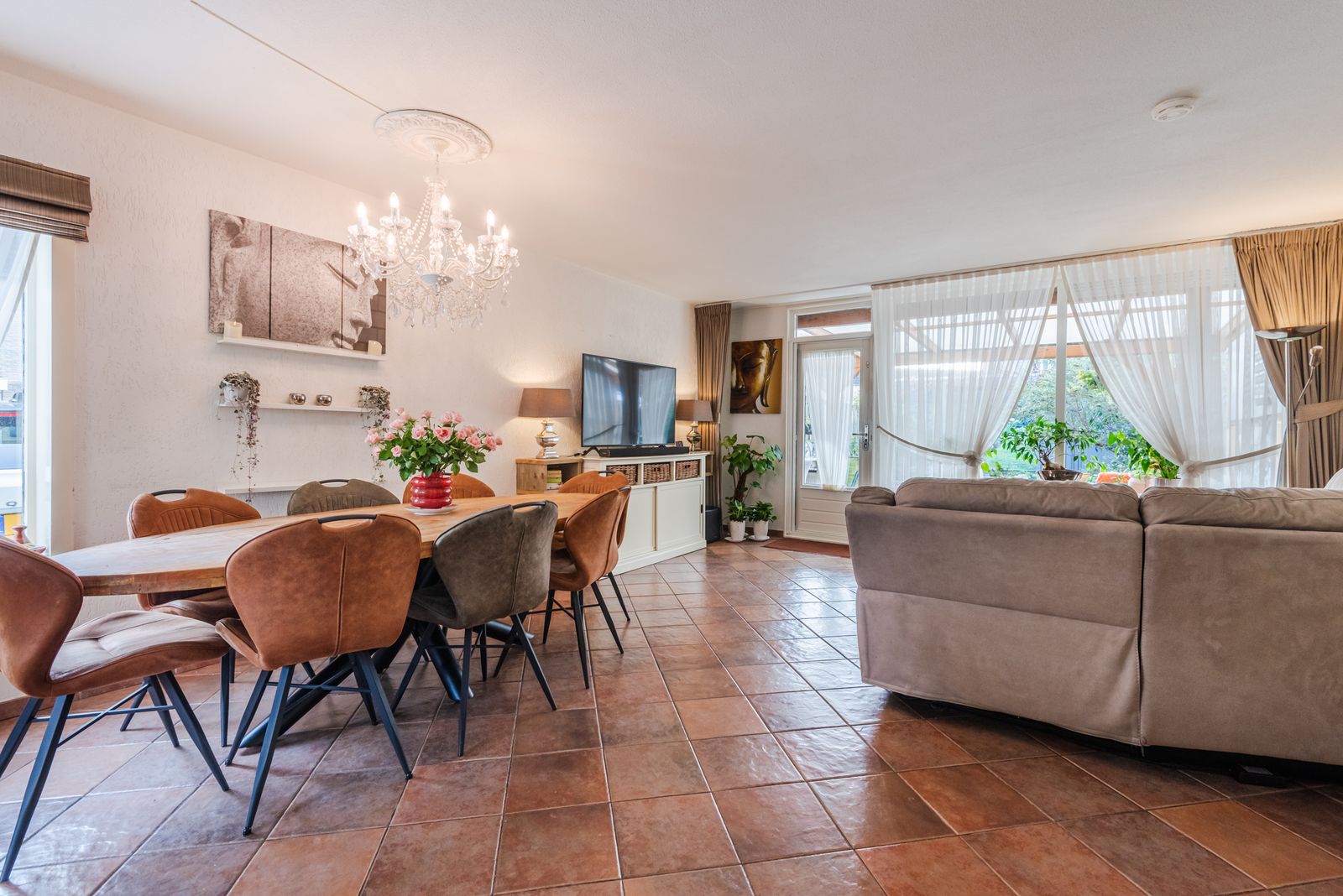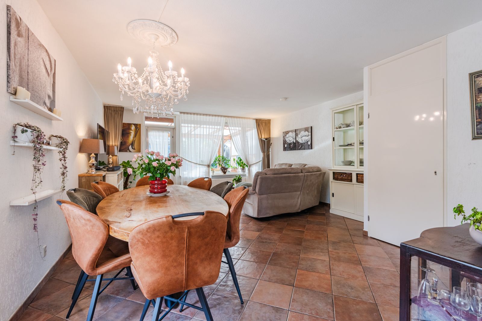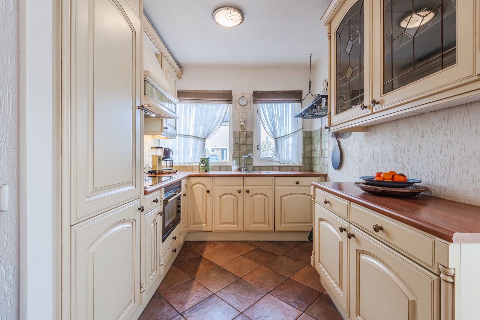 Entree met hal, meterkast en modern vrij hangend toilet. De woonkamer is tuingericht, beschikt over een voorraadkast en een deur naar de zonnige achtertuin. Voorin is de in landelijk gestijlde open keuken gesitueerd, met praktische L-vormige opstelling en voorzien van inductiekookplaat, afzuigkap, vaatwasser (allen uit 2022), combi oven-magnetron, koelkast en vriezer . De begane grond is afgewerkt met een plavuizenvloer (met vloerverwarming) en pleisterwerk op de wanden.