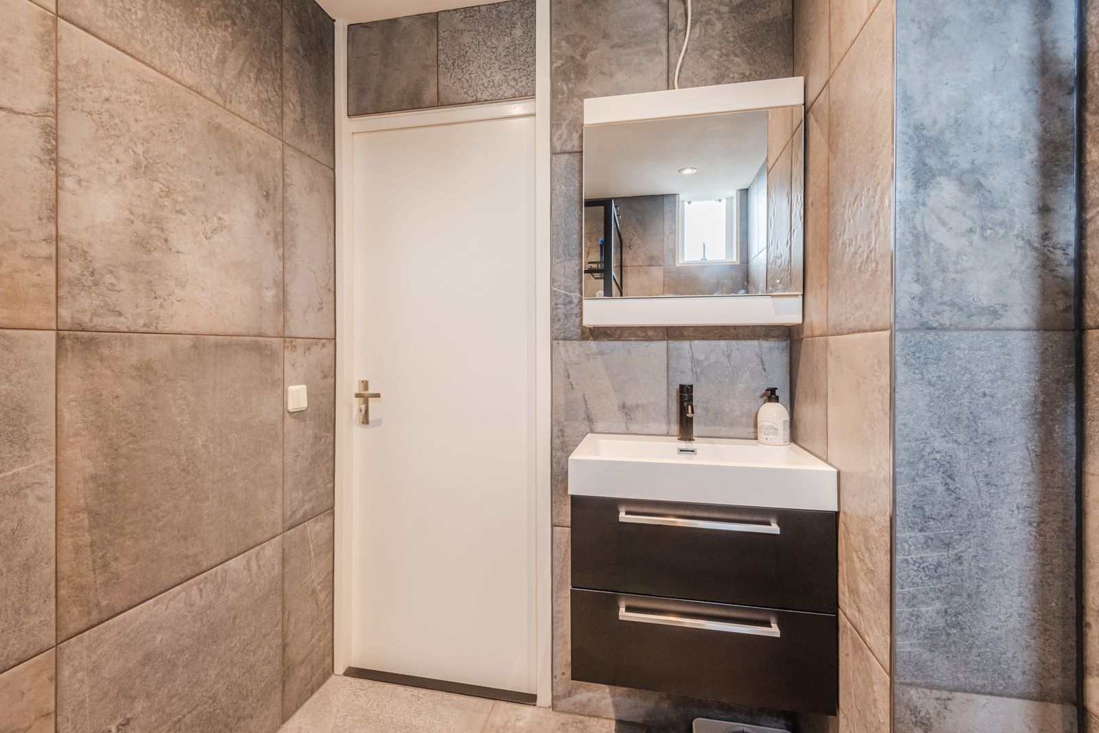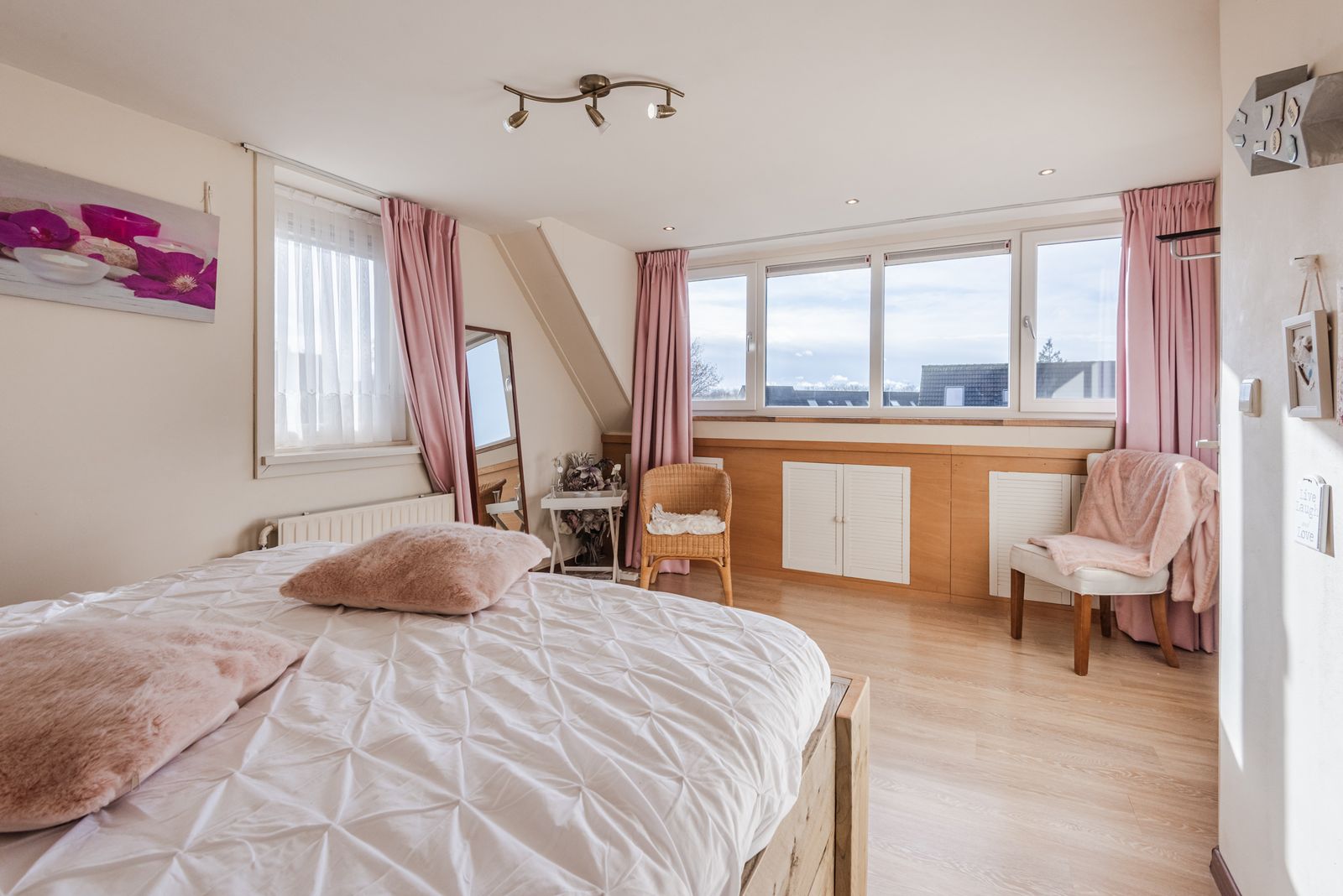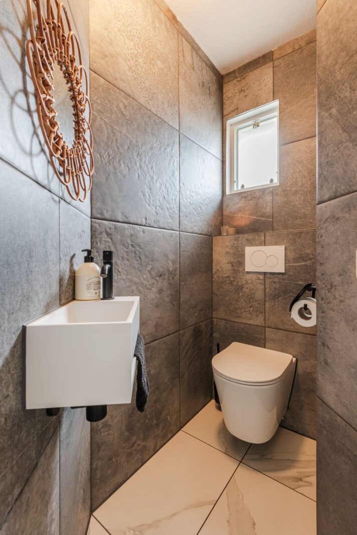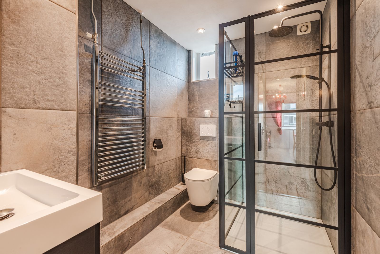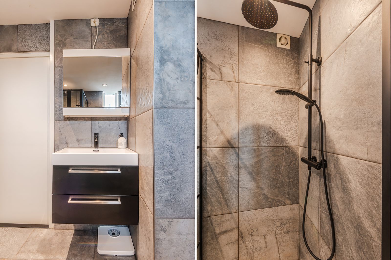 Overloop met toegang tot drie ruime slaapkamers. De badkamer is modern afgewerkt met een inloopdouche, wastafelmeubel met spiegel, vrij hangend toilet en volledig tegelwerk tot plafondhoogte. Ook de verdieping is voorzien van laminaat en strak geschilderde wanden.
