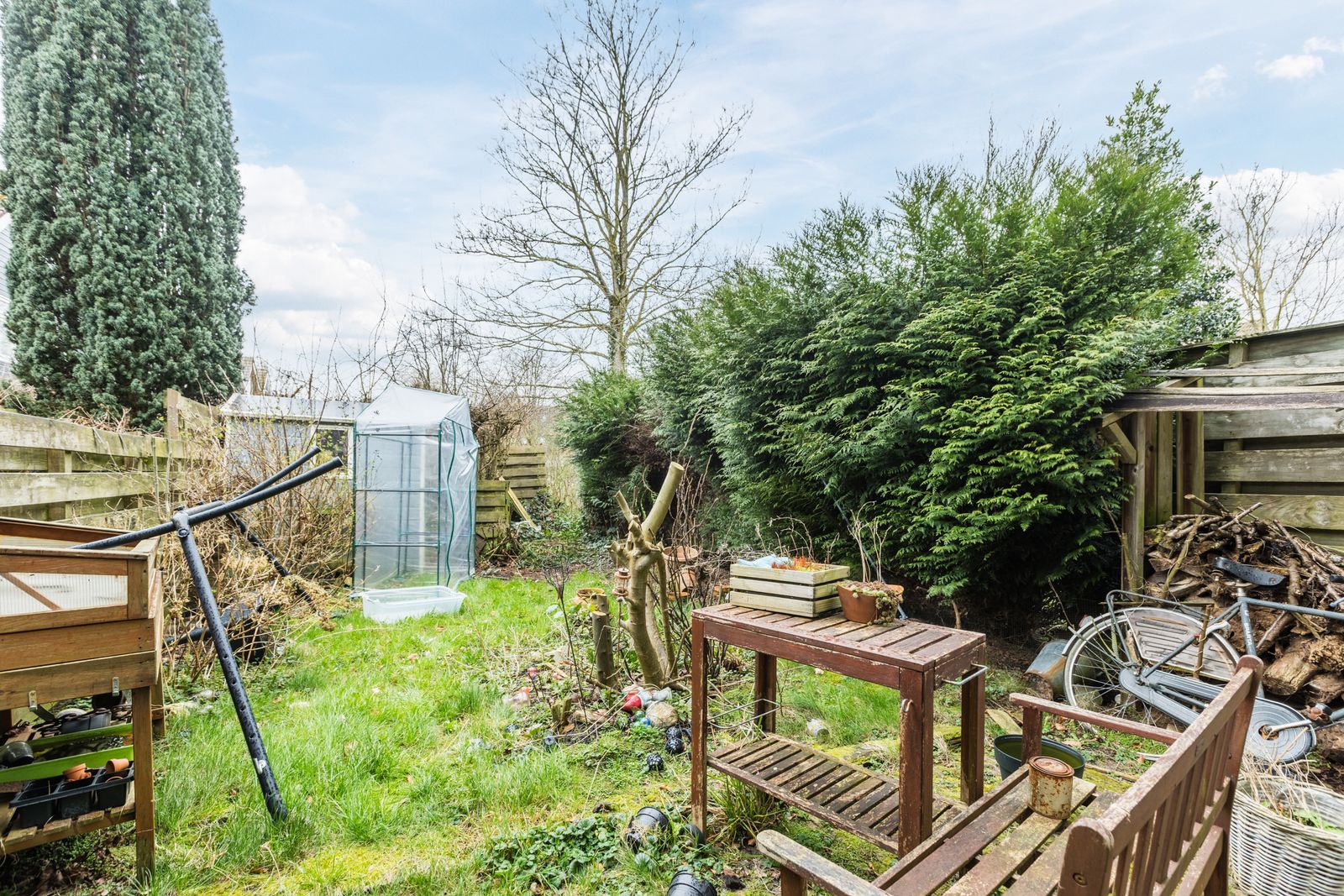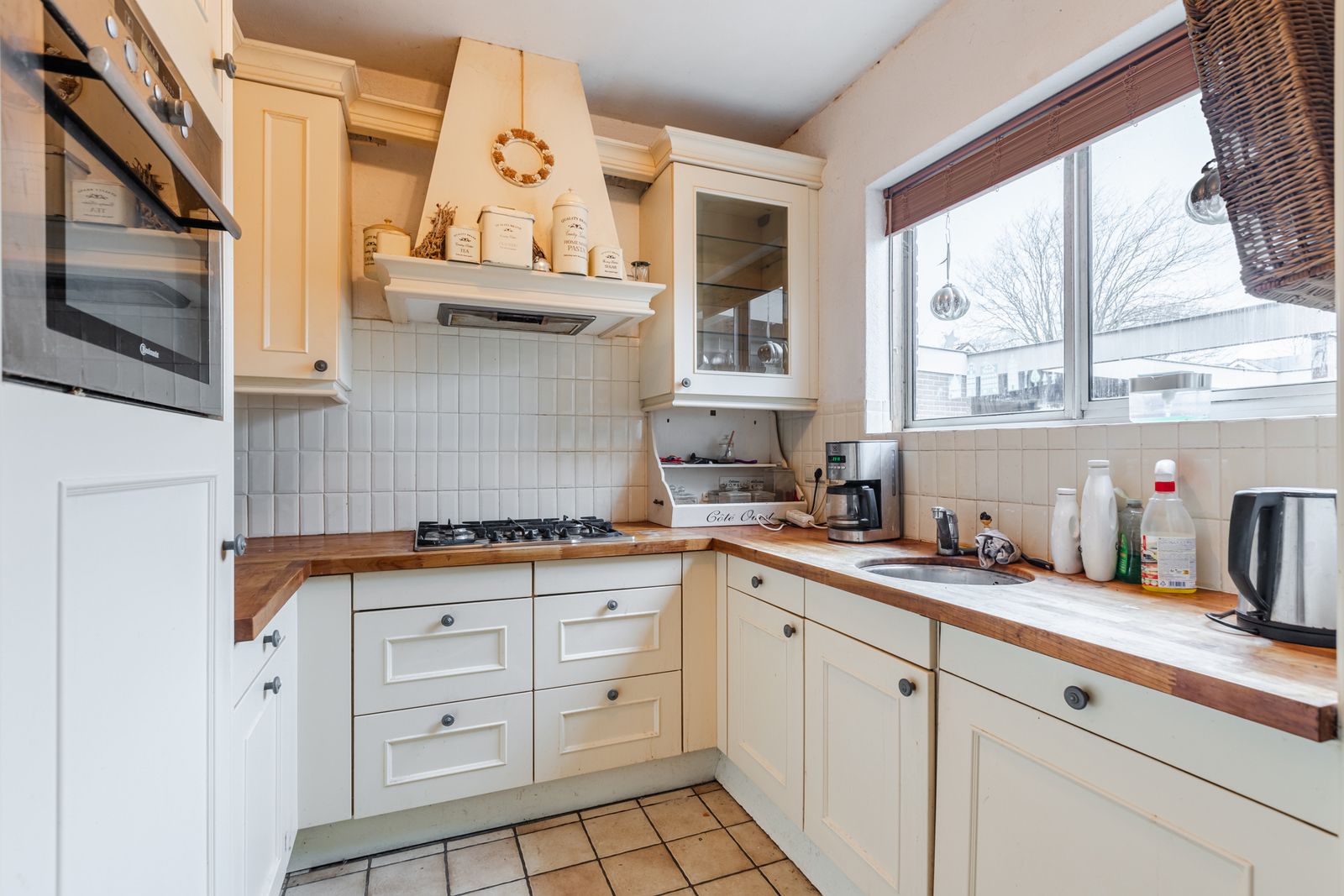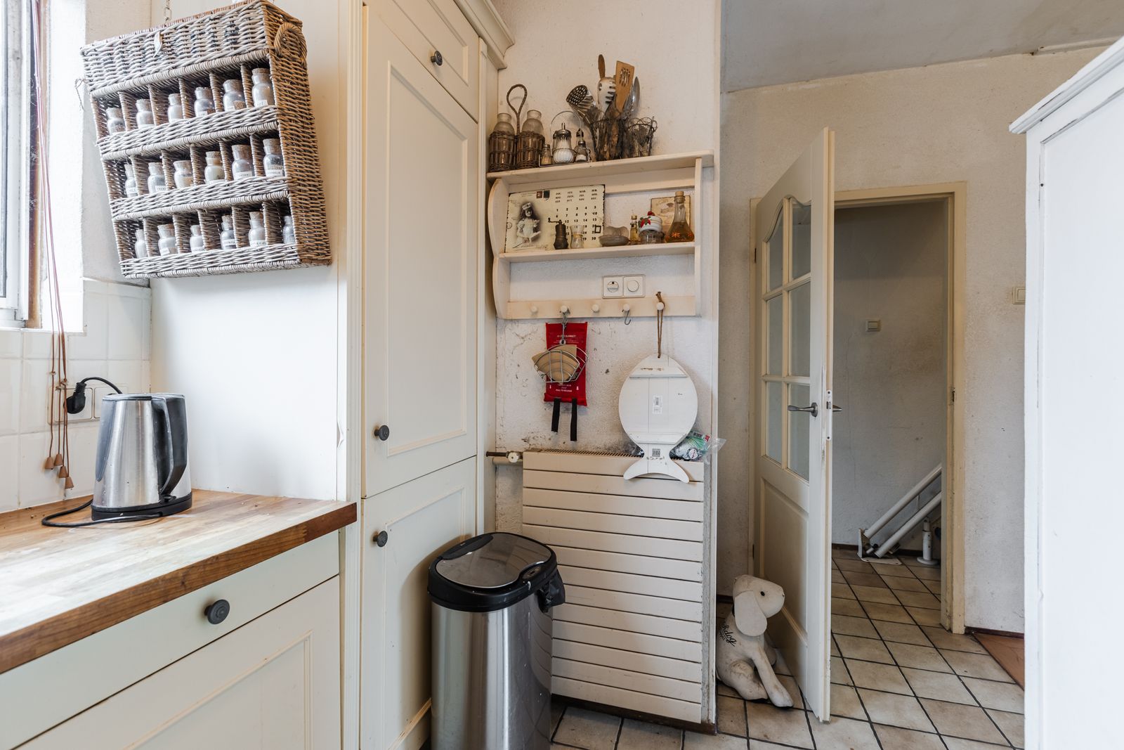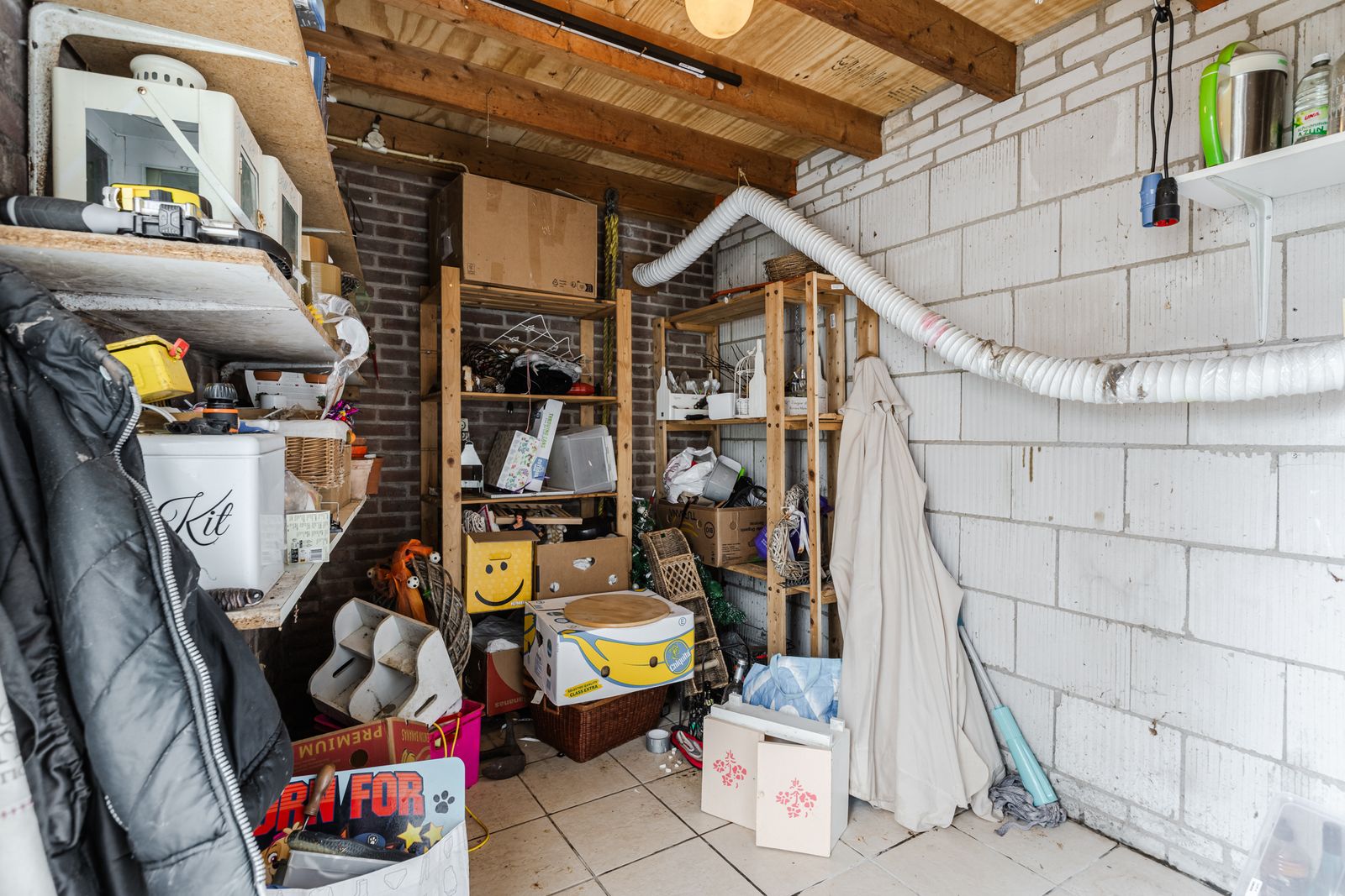 Aan de voorkant vindt u een ruime schuur waarin de meterkast zich bevindt en een aansluiting voor de wasmachine en droger. Daarnaast de hal, een toilet met fontein, ruime woonkamer met open haard en schuifpui die toegang geeft tot de zonnige achtertuin. Aan de voorzijde bevindt zich de halfopen keuken die is onder andere is voorzien van een houten blad, 5 pits kooktoestel, wasemkap, vaatwasser en er is ruimte voor een koelkast.