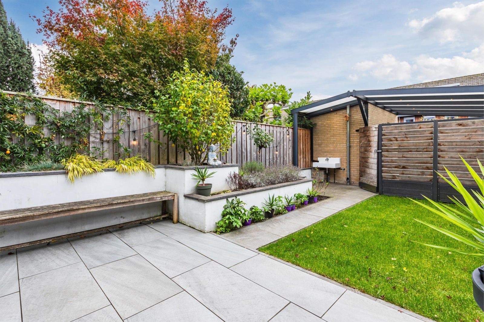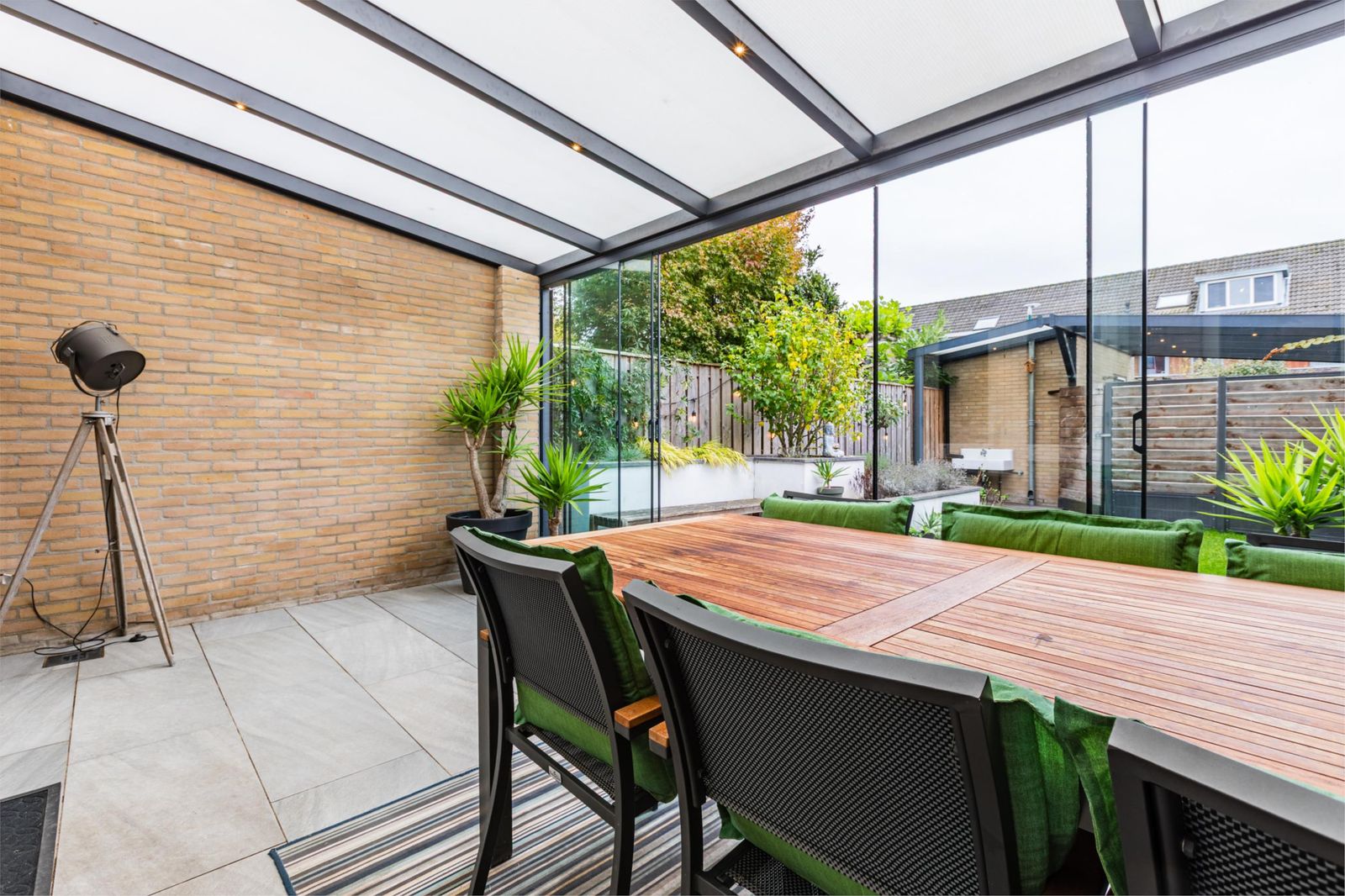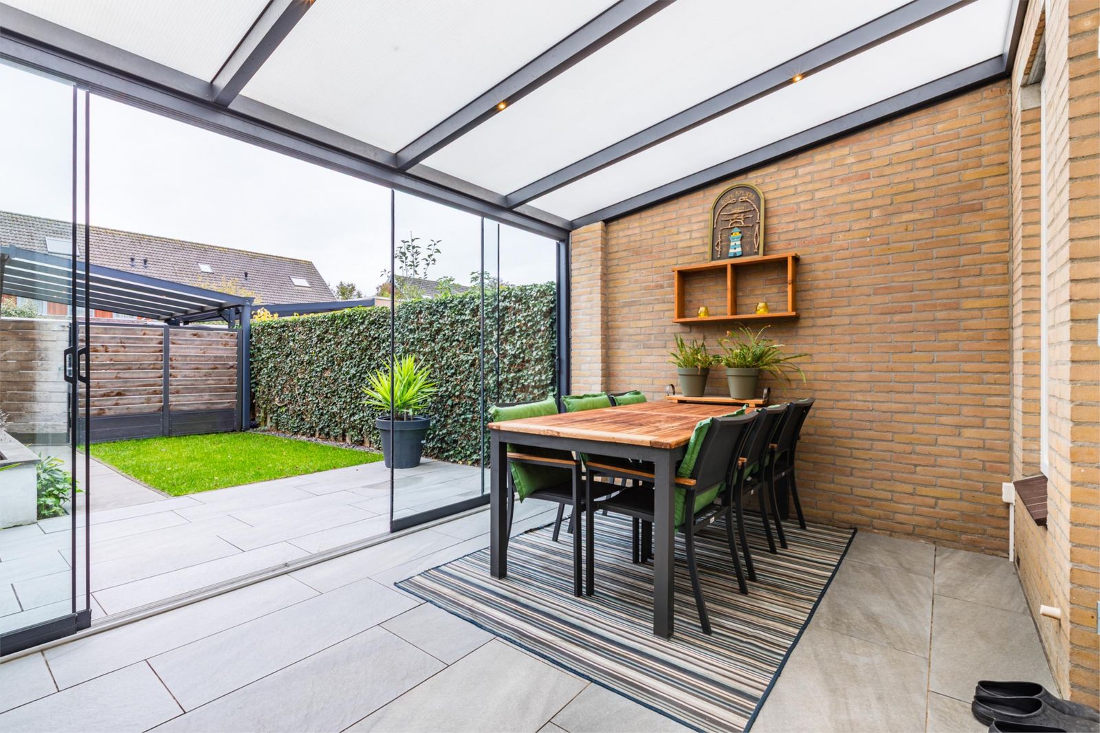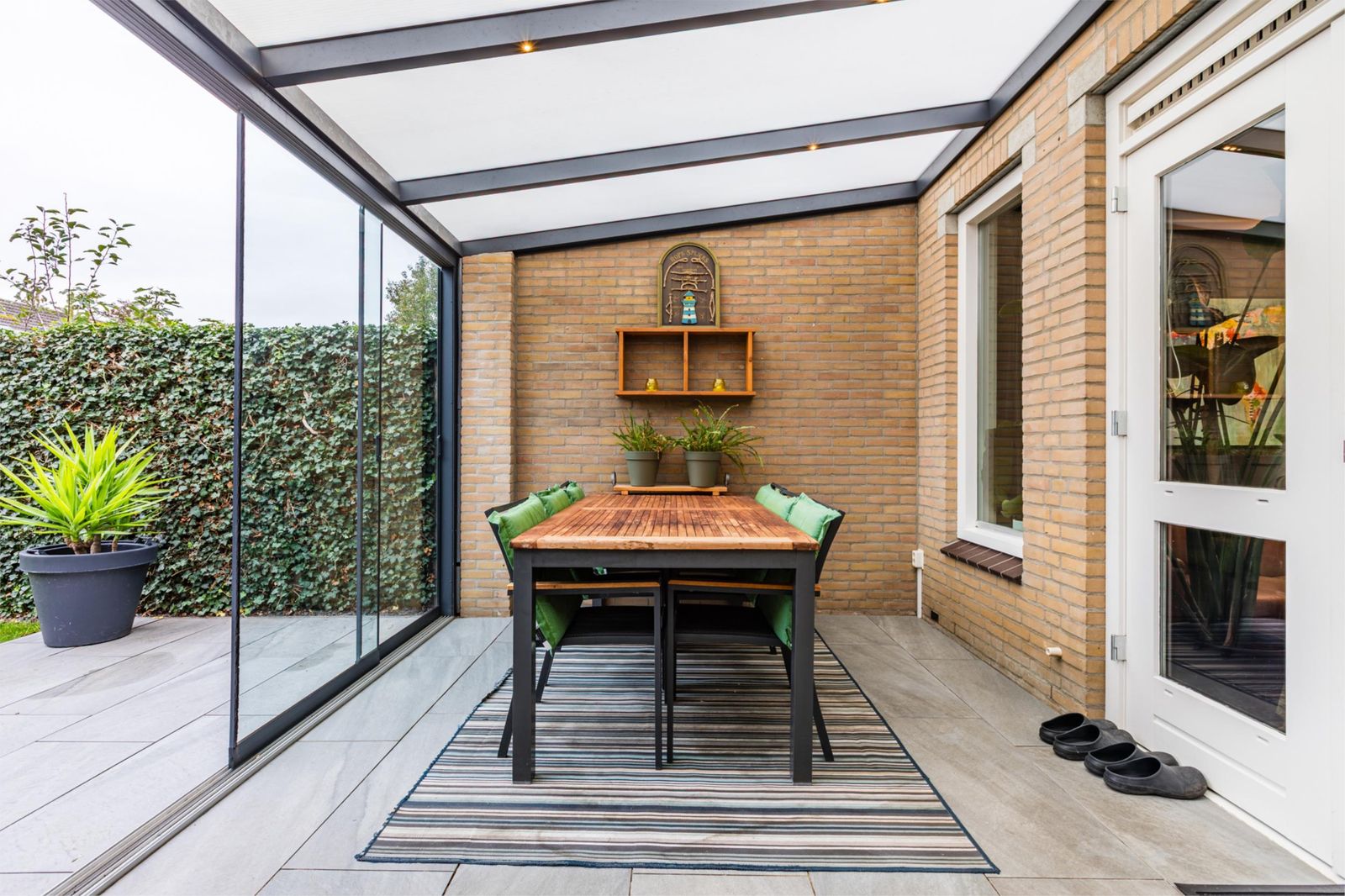 De achtertuin is gelegen op het zuiden en ingericht met een ruim terras en een multifunctionele overkapping/serre van ca. 15 m². Een comfortabele buitenruimte waar je in bijna alle seizoenen heerlijk kunt zitten. De tuin is ook via een achterom bereikbaar.
