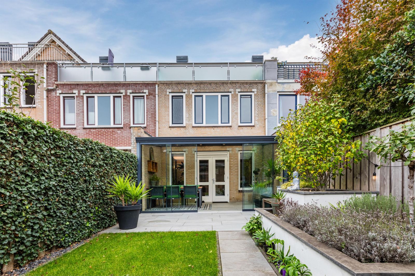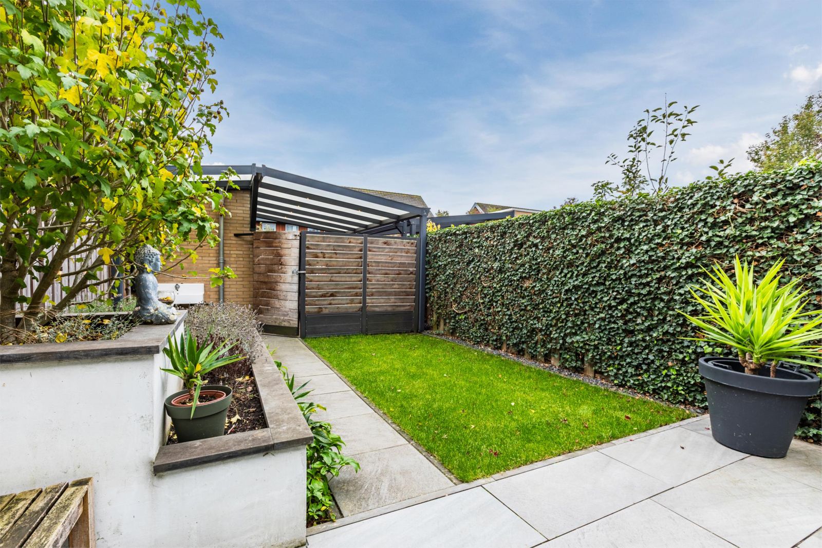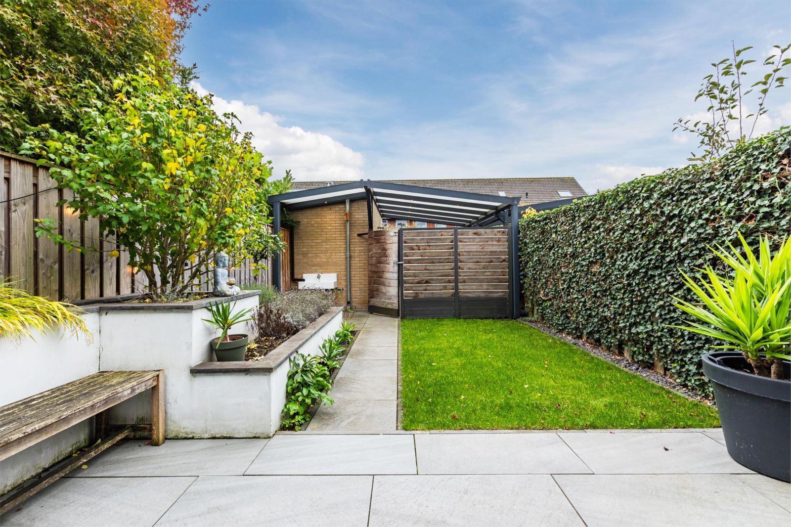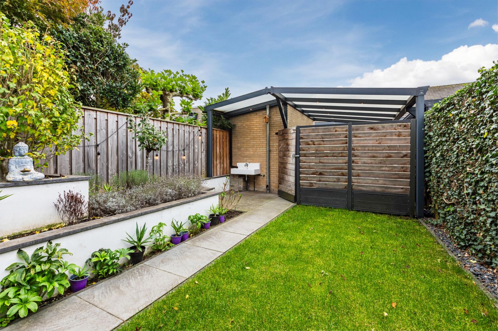 De achtertuin is gelegen op het zuiden en ingericht met een ruim terras en een multifunctionele overkapping/serre van ca. 15 m². Een comfortabele buitenruimte waar je in bijna alle seizoenen heerlijk kunt zitten. De tuin is ook via een achterom bereikbaar.