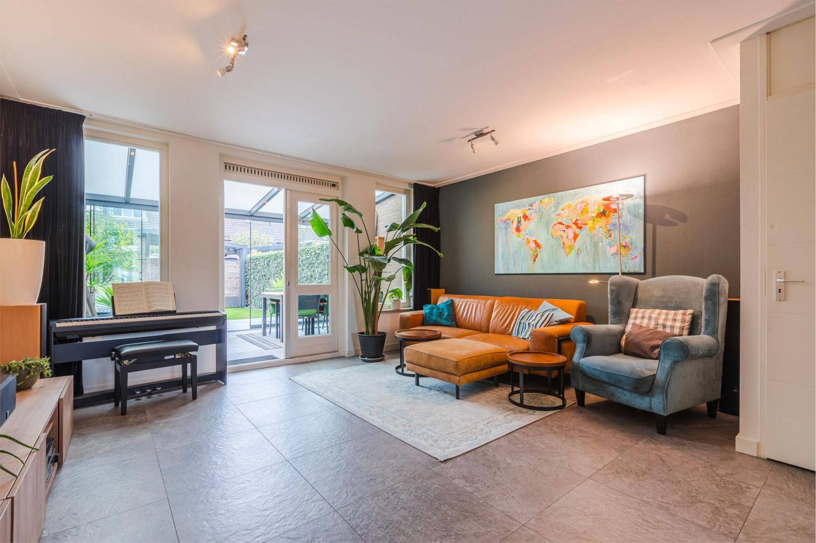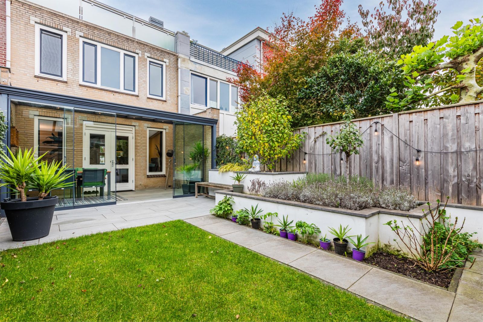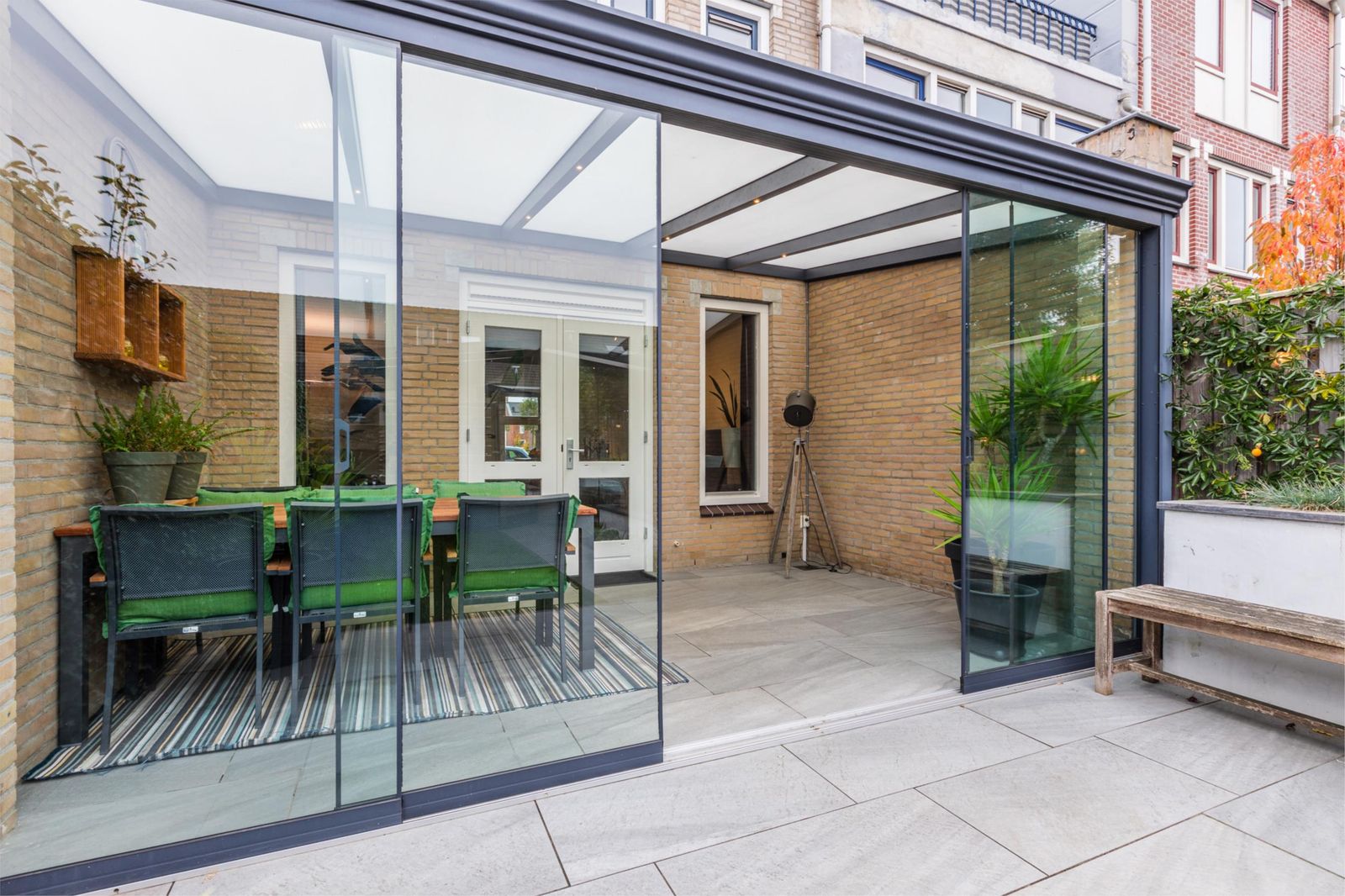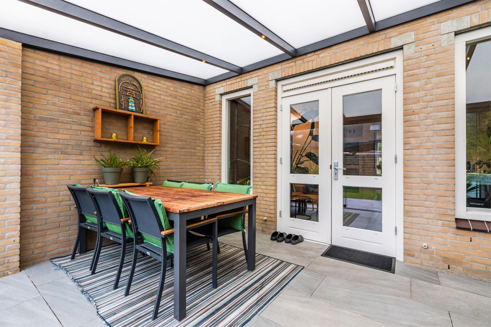De achtertuin is gelegen op het zuiden en ingericht met een ruim terras en een multifunctionele overkapping/serre van ca. 15 m². Een comfortabele buitenruimte waar je in bijna alle seizoenen heerlijk kunt zitten. De tuin is ook via een achterom bereikbaar.