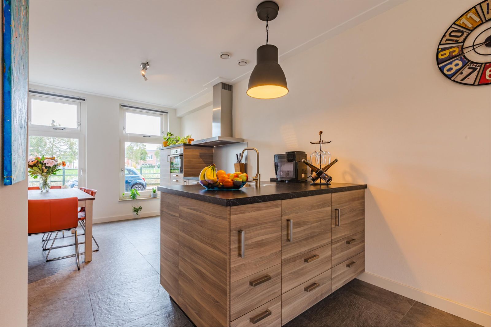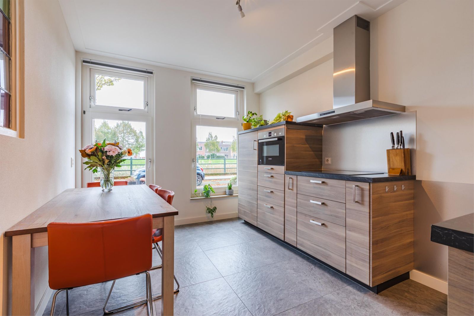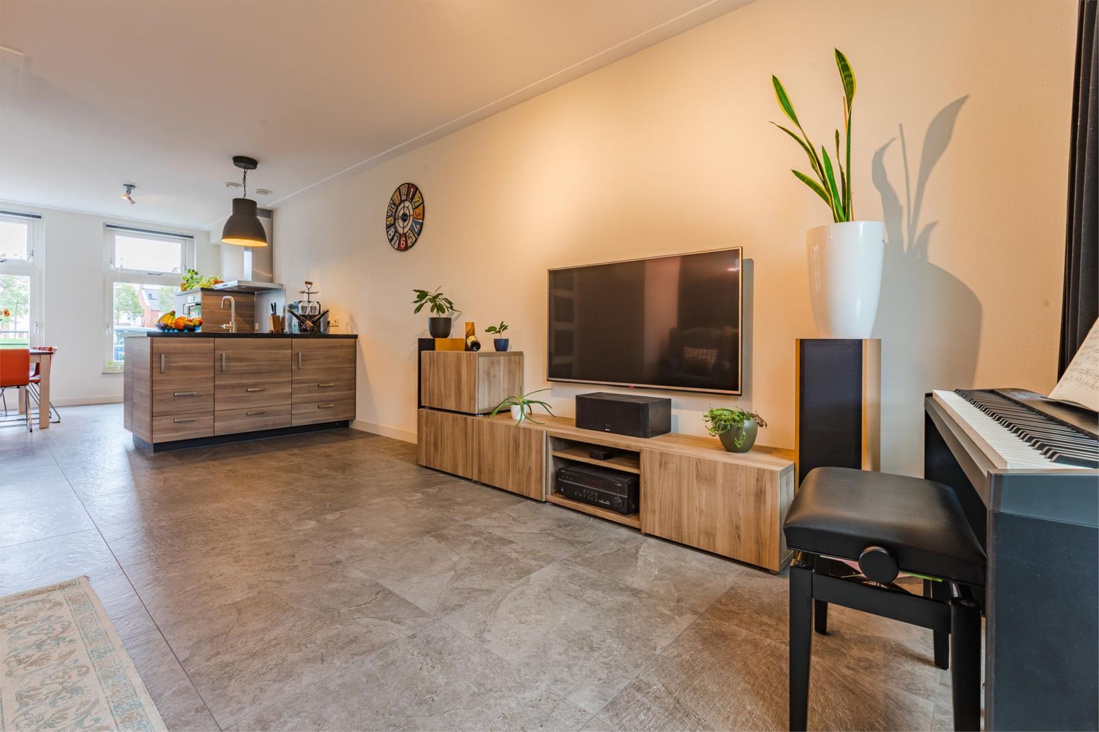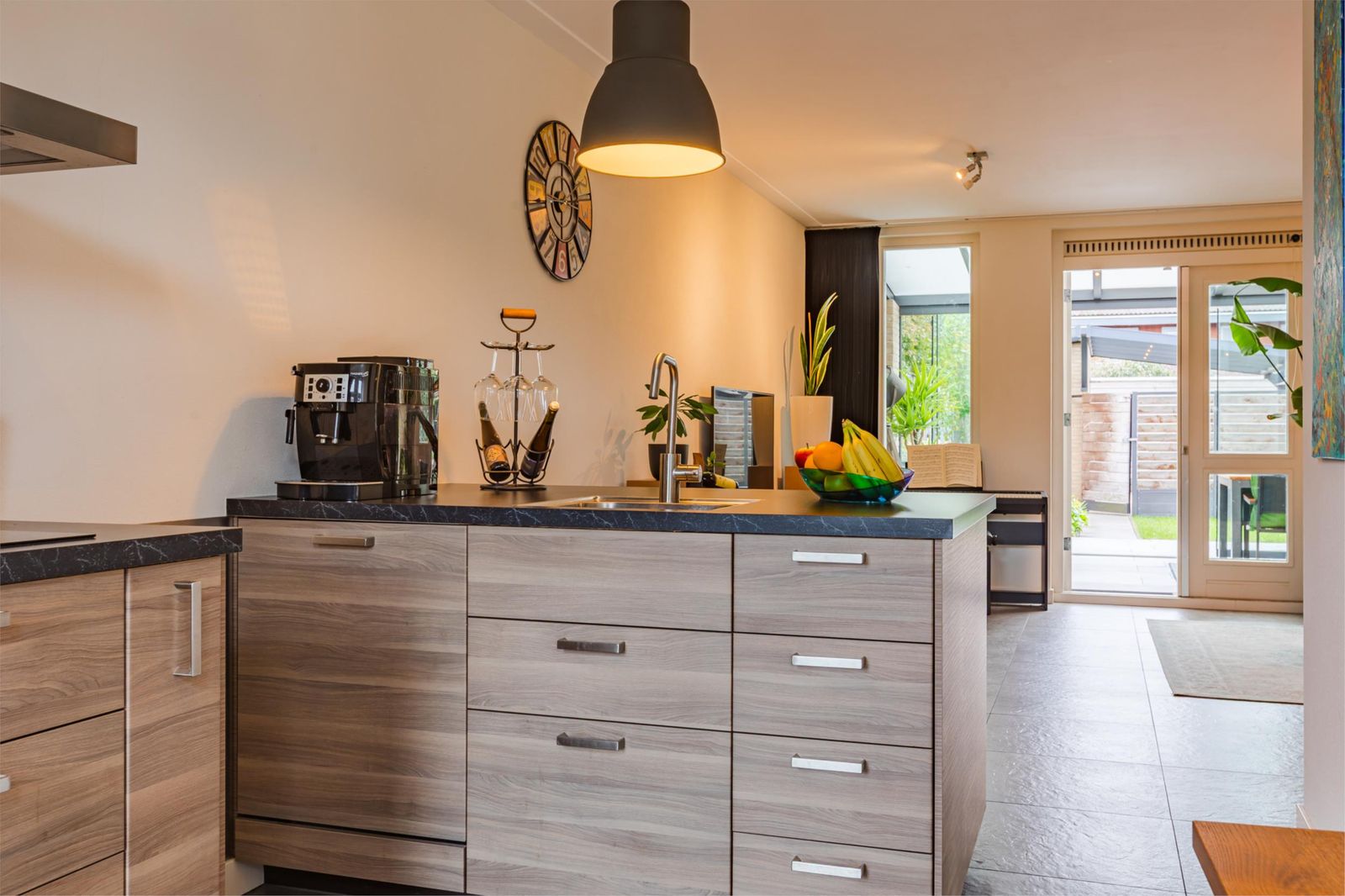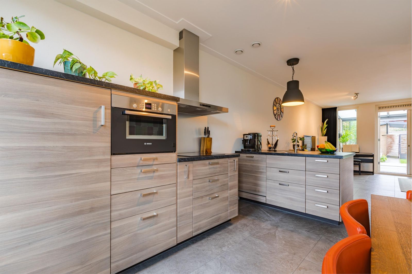 De woonkamer biedt een prettige leefruimte met directe verbinding naar de tuin. De open keuken is uitgerust met een stijlvol keukeneiland en degelijke Bosch-inbouwapparatuur, waaronder een inductiekookplaat, combimagnetron en vaatwasser. De keuken combineert een stijlvolle inrichting met praktisch gebruiksgemak. De gehele benedenverdieping is voorzien van vloerverwarming.