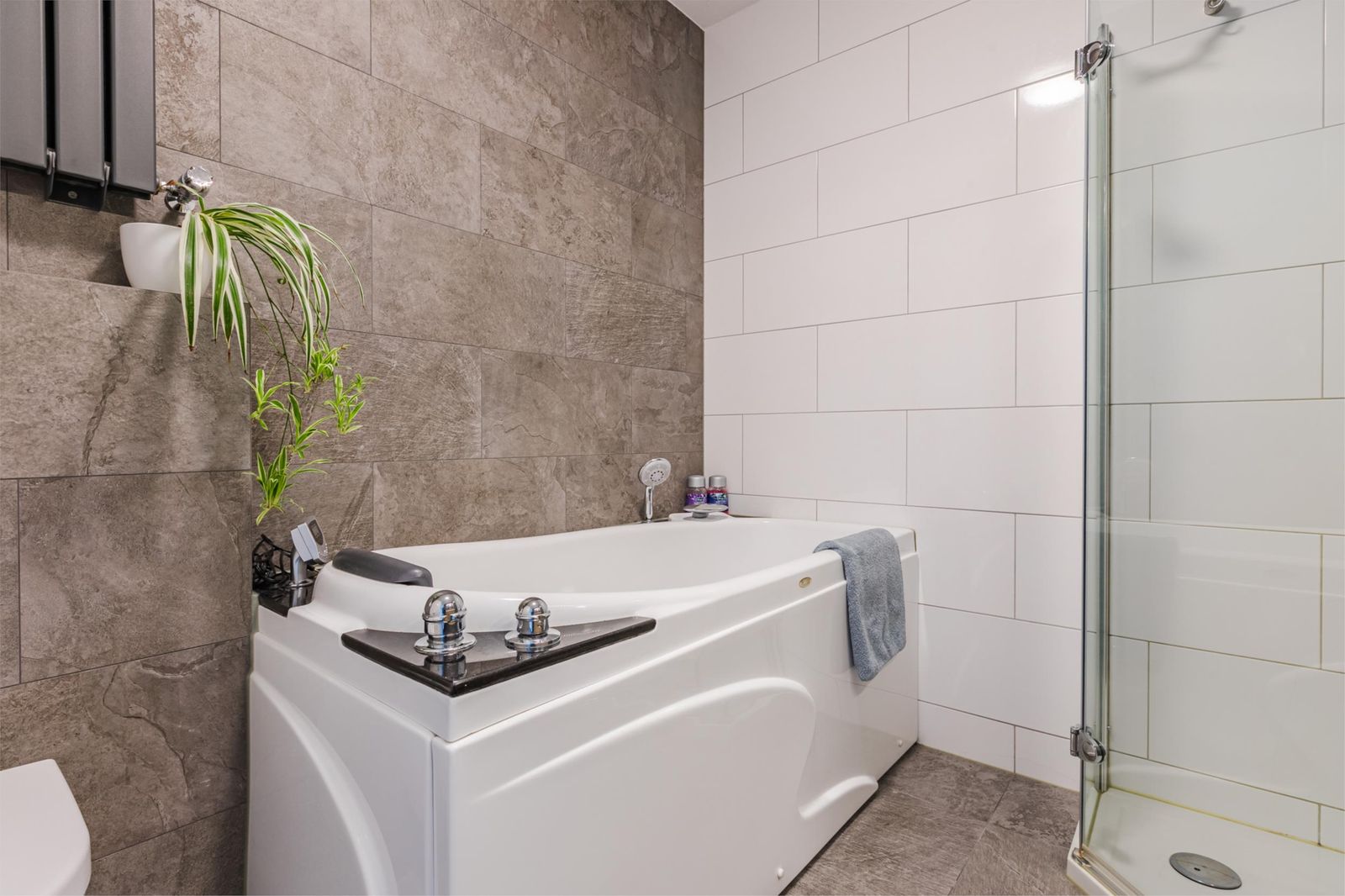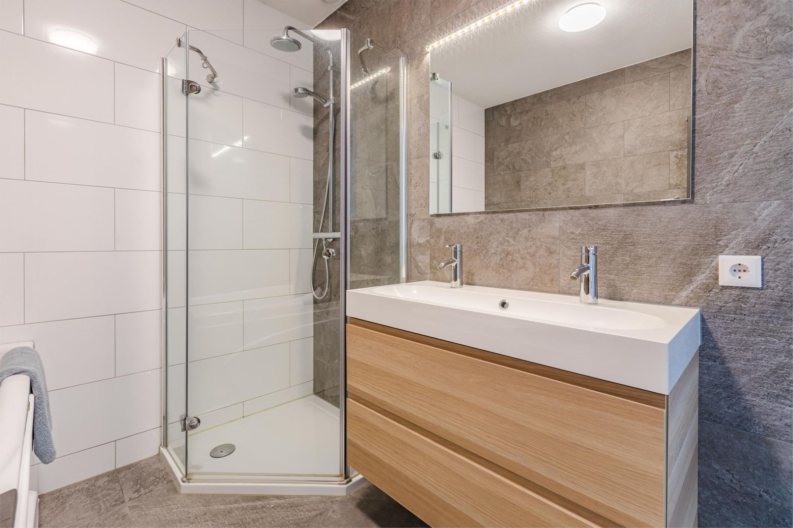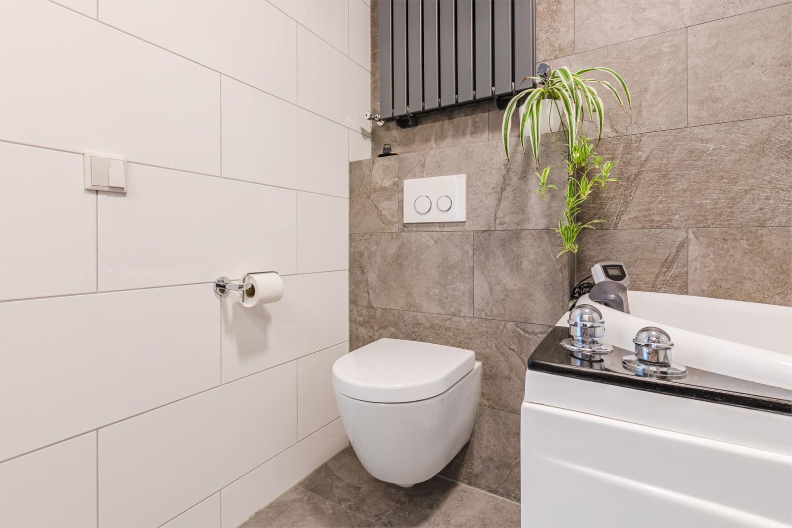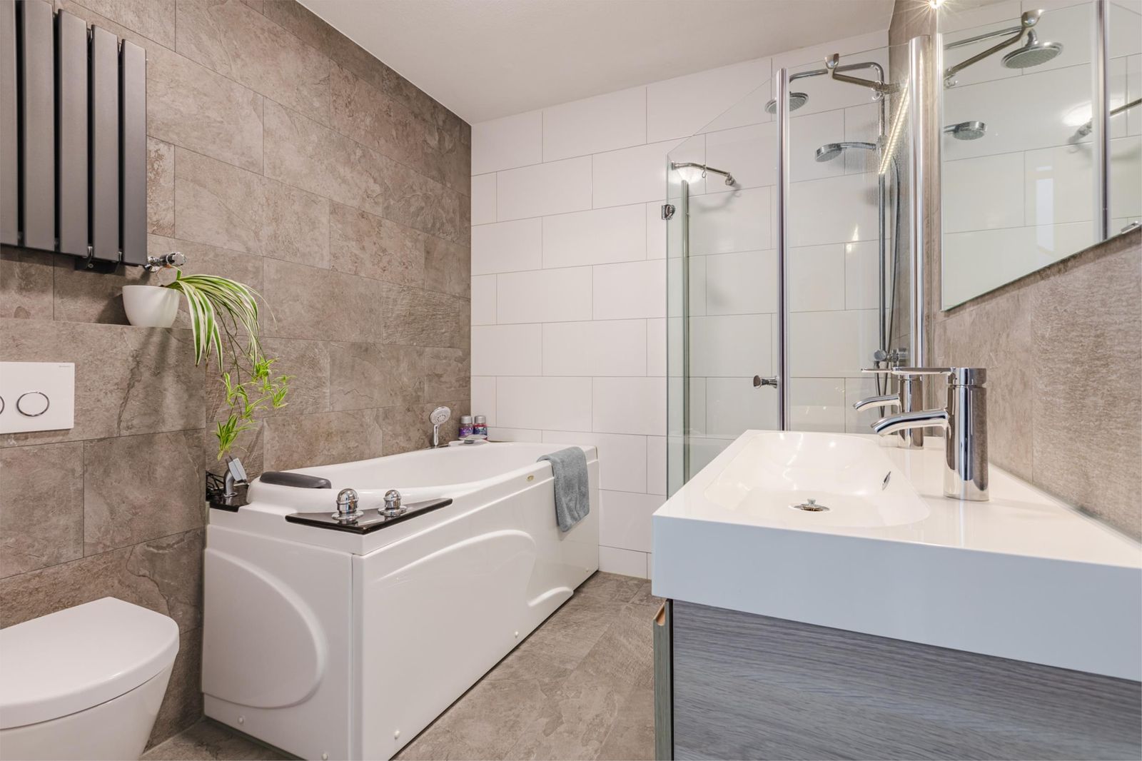 •Moderne badkamer met whirlpool, regendouche, toilet en dubbele wastafel