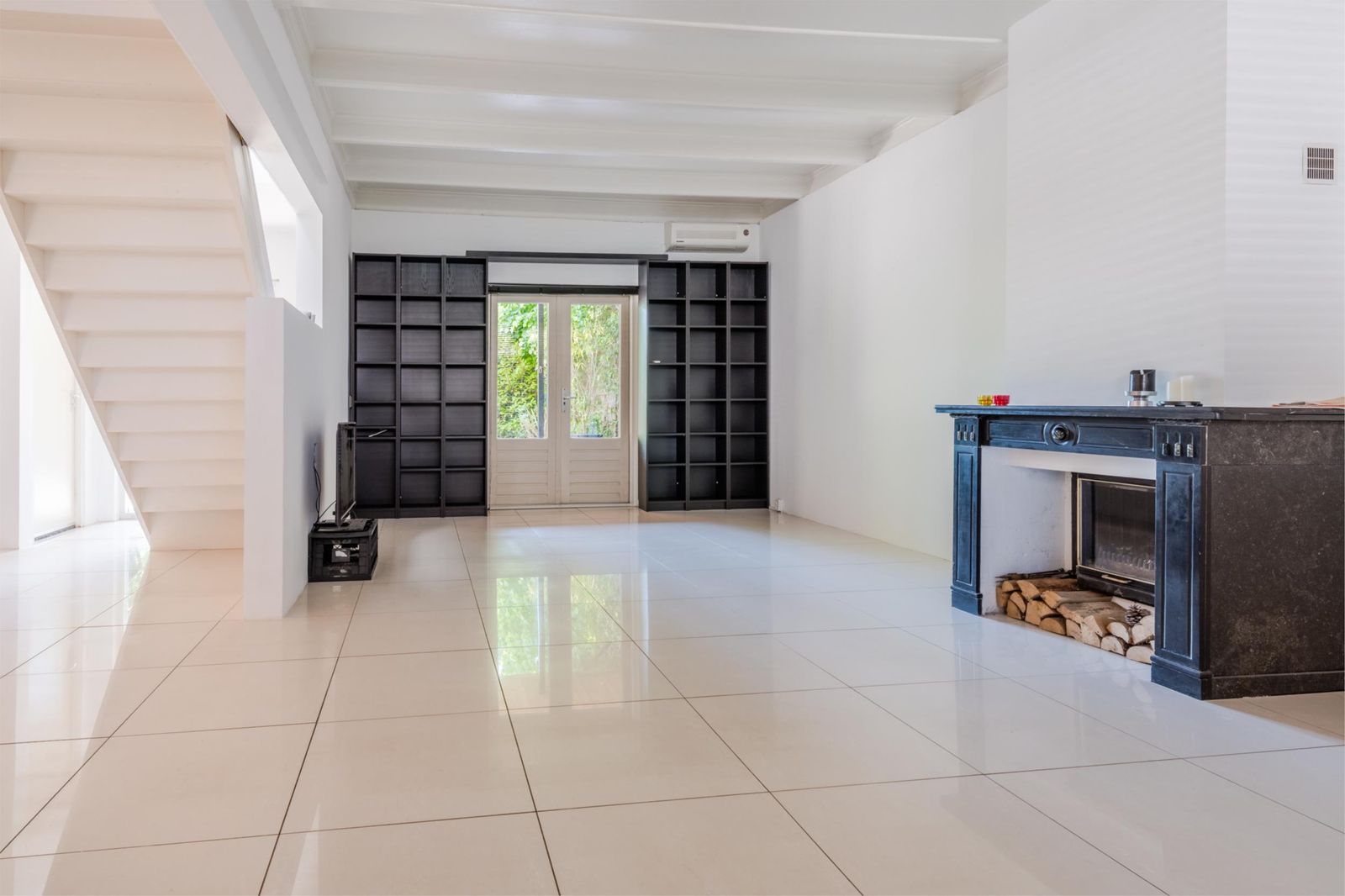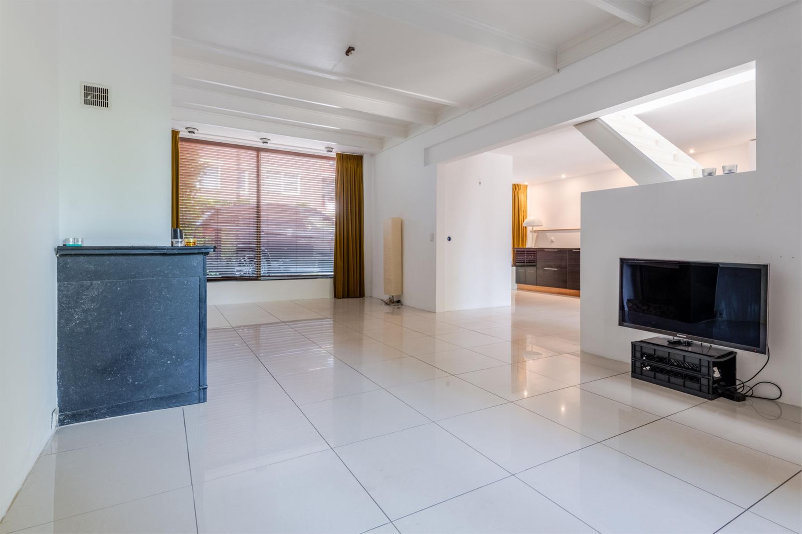Deze woning beschikt over een zeer ruime woonkamer met een open moderne volledig uitgeruste keuken (oven, magnetron, inductie kookplaat en Amerikaanse koelkast), openslaande deuren naar de grote overkapte veranda en groene tuin (30 x 11 meter) en een gezellige inzethaard met zwart marmeren schouw. Tevens zijn er boekenkasten aanwezig en een televisie. De gehele begane grond is voorzien van vloerverwarming.