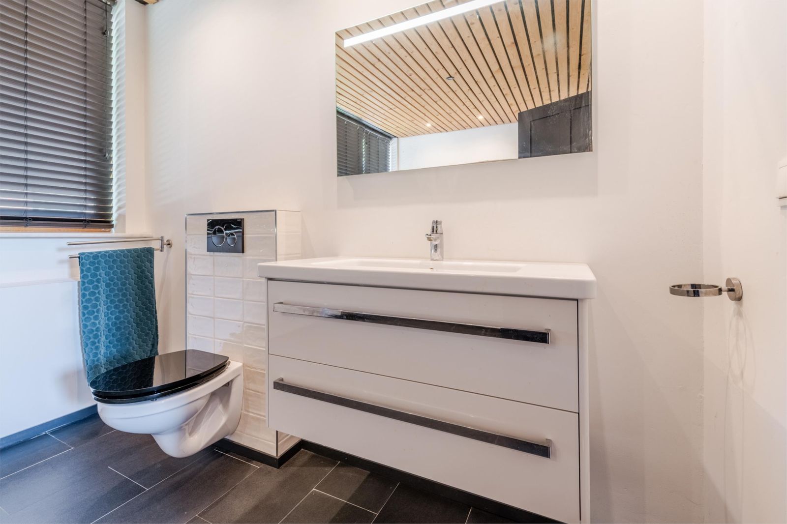 De badkamer is voorzien van een toilet, moderne wastafel met spiegel, Grohe inbouw douche en een grote whirlpool.