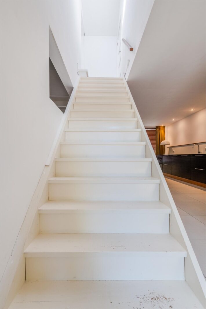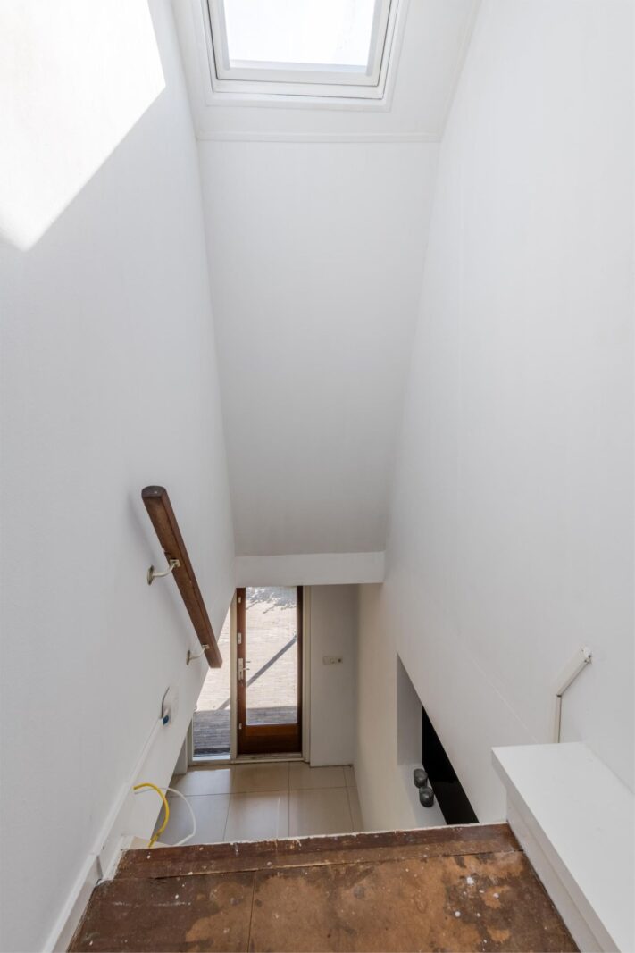 De open trap brengt je naar de bovenverdieping. Hier vind je een mooie kamer met kledingkasten en een karakteristiek gemoderniseerd dak met oude dakspanten.