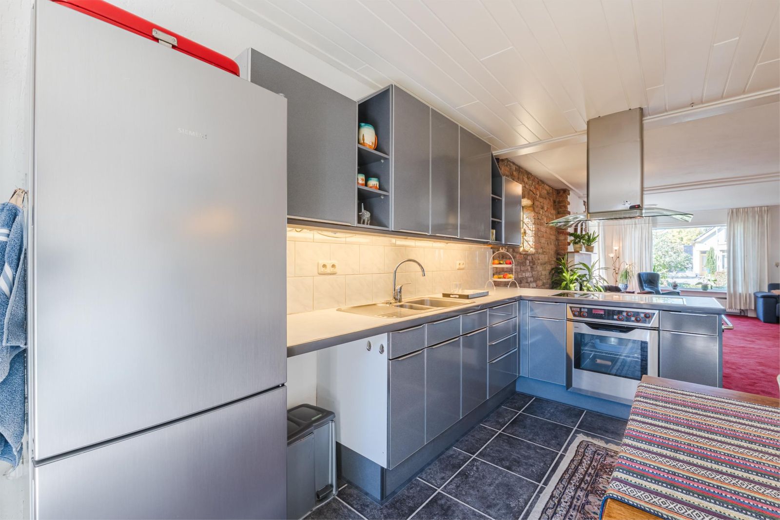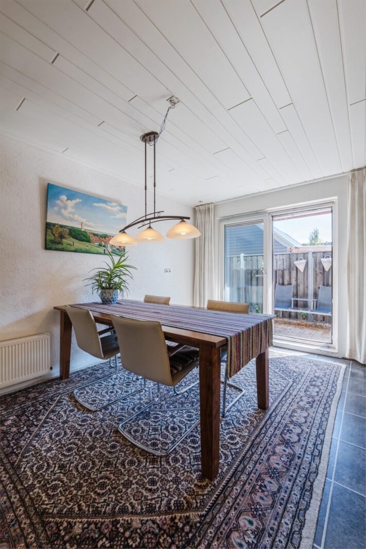 Via de voordeur kom je binnen in een ruime hal met toegang tot het toilet, de bijkeuken en de interne berging. De royale L-vormige woonkamer biedt veel ruimte en lichtinval. De open keuken is uitgerust met een keramische kookplaat, afzuigkap, oven en een 1½ spoelbak. Via de kunststof schuifpui stap je zo het zonnige terras aan de achterzijde op.
