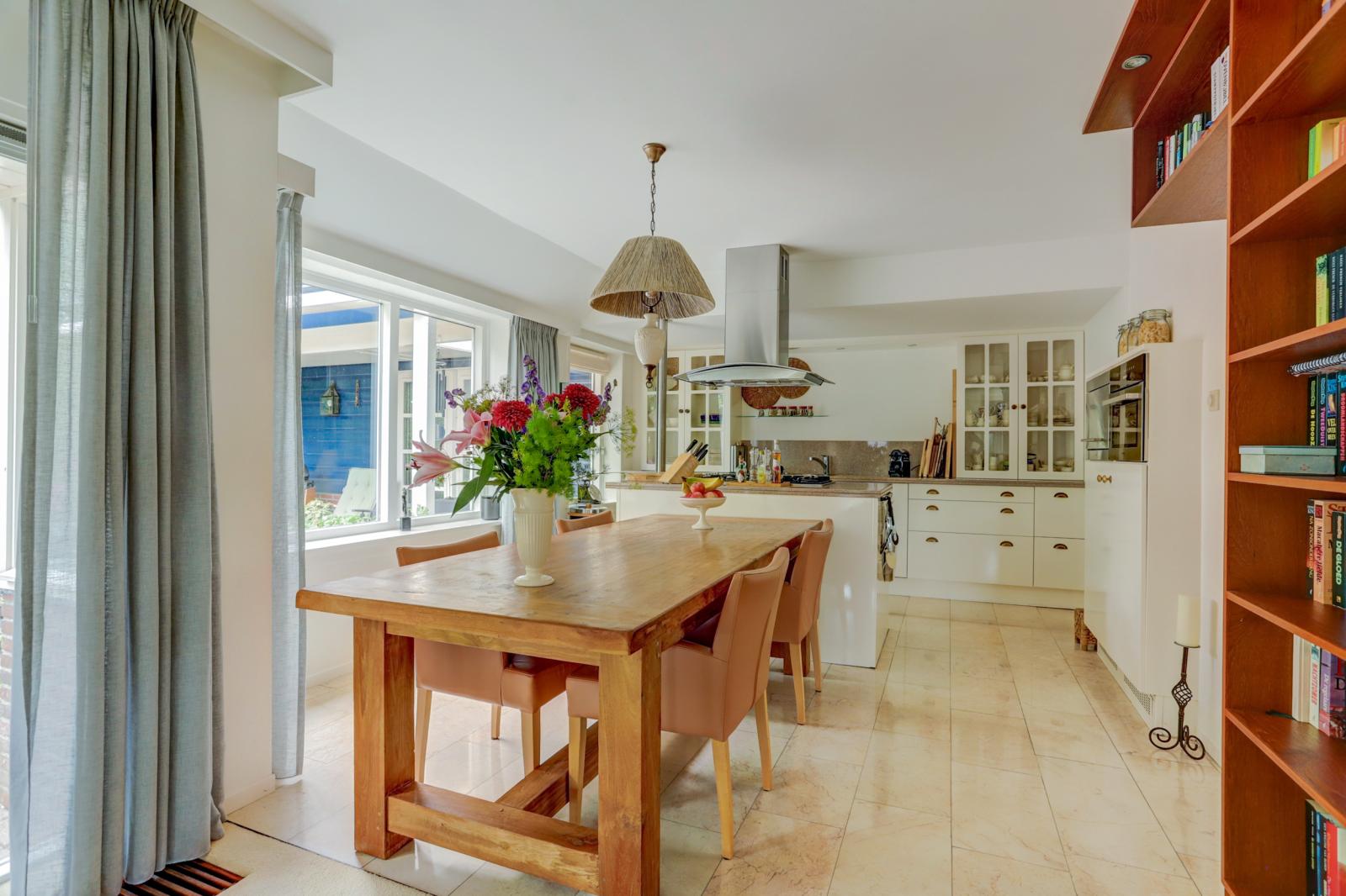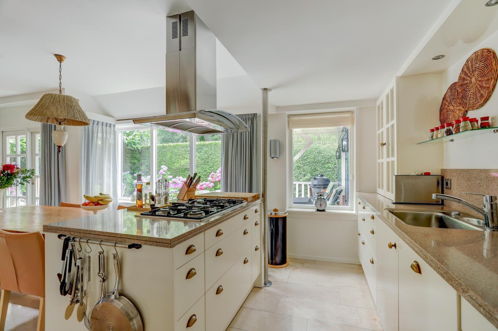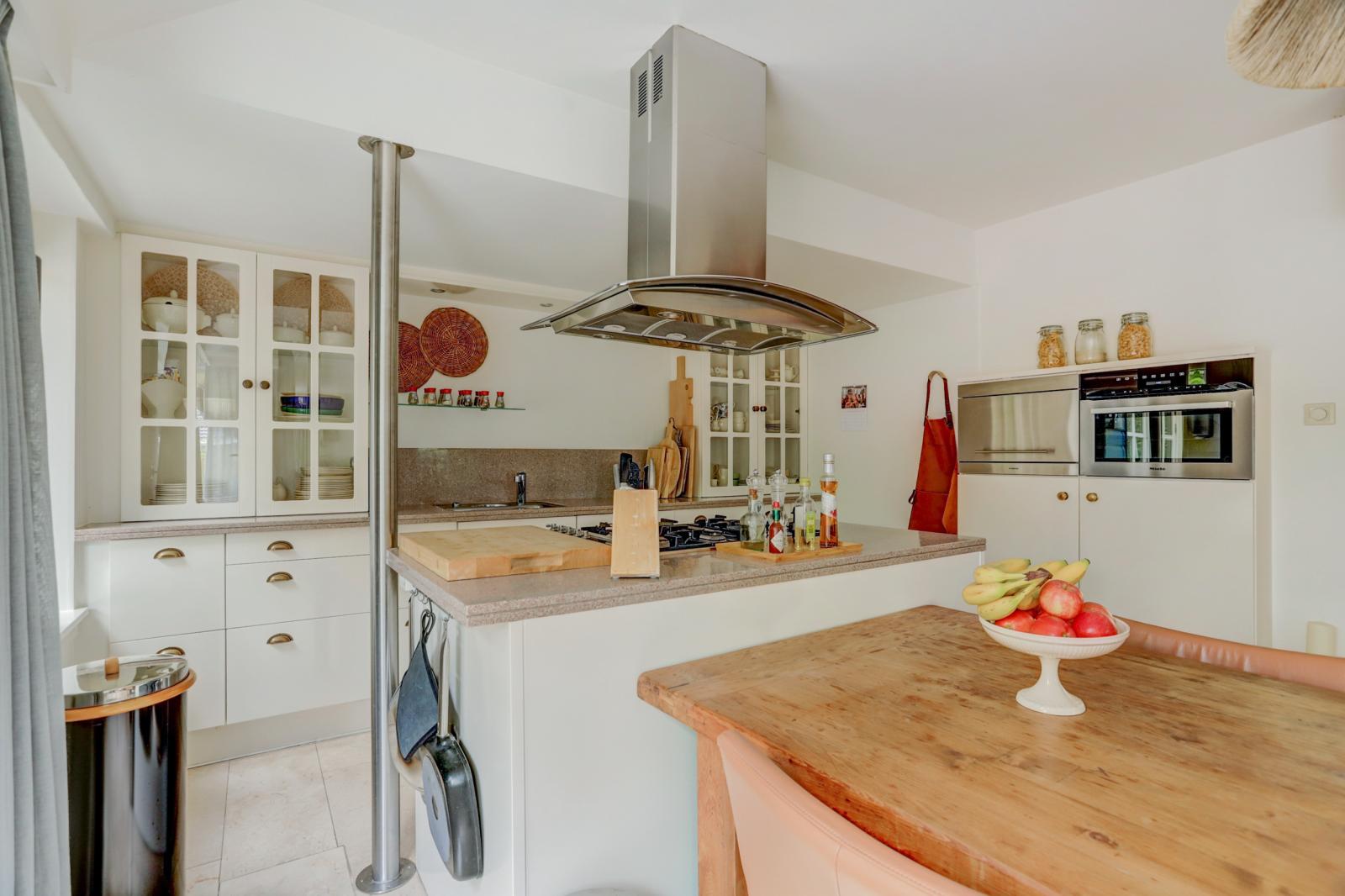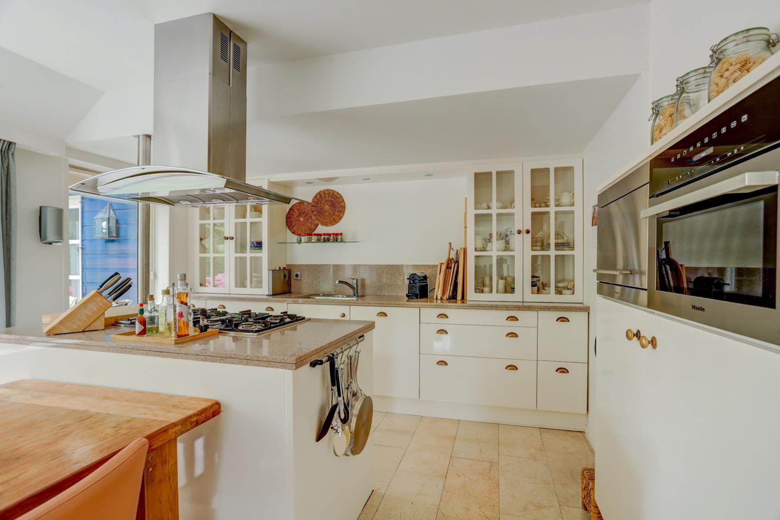 U wordt ontvangen in een royale hal met vide, garderobe en luxe toilet. Vanuit hier geven dubbele deuren toegang tot de lichte living en een schitterend uitzicht over de binnenhaven. Het eetgedeelte grenst aan de tuin en beschikt over een marmeren vloer en openslaande deuren naar het terras. De moderne open keuken is luxe uitgevoerd en voorzien van hoogwaardige inbouwapparatuur, waaronder een oven, steamer, koelkast en vriezer en vaatwasser.
