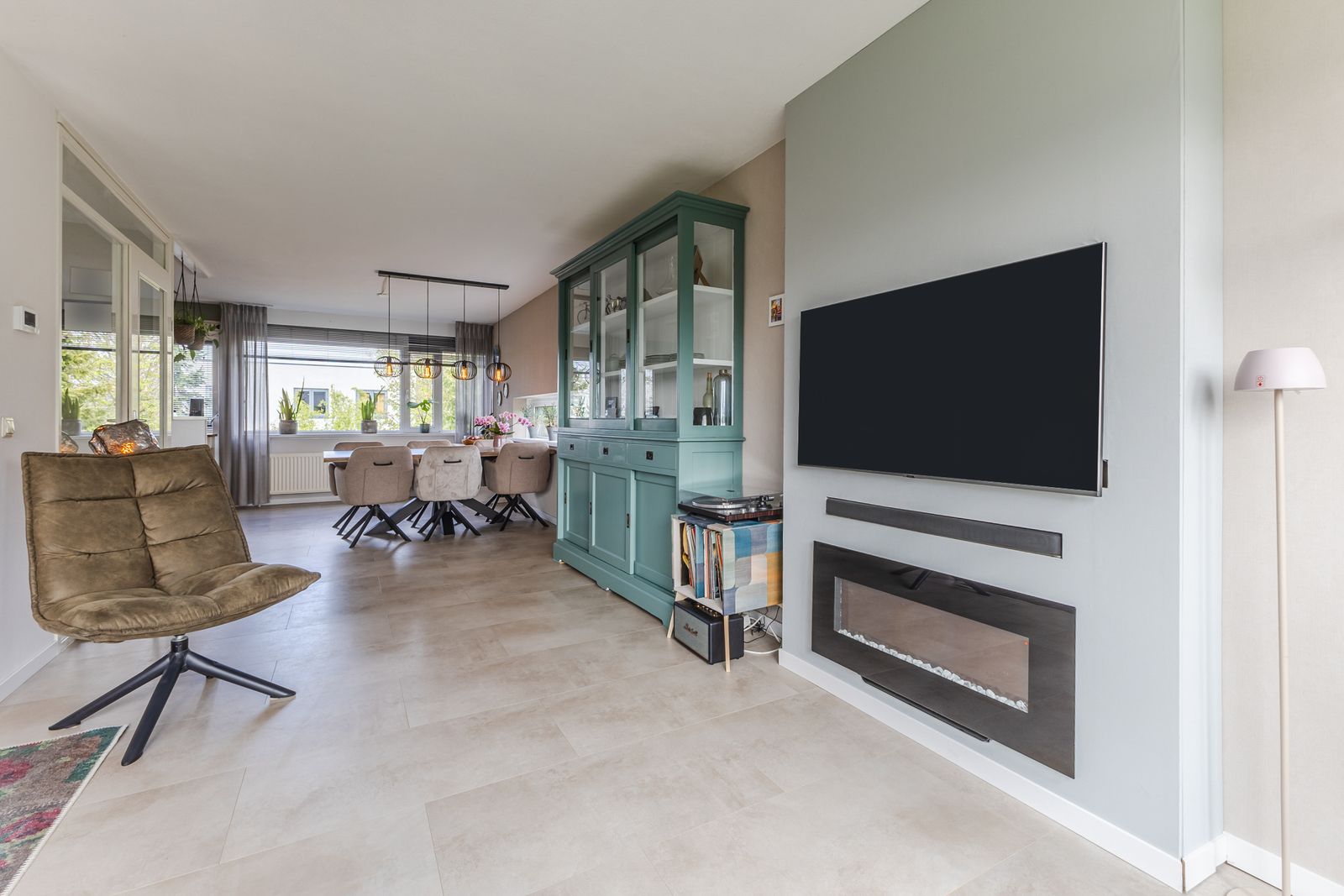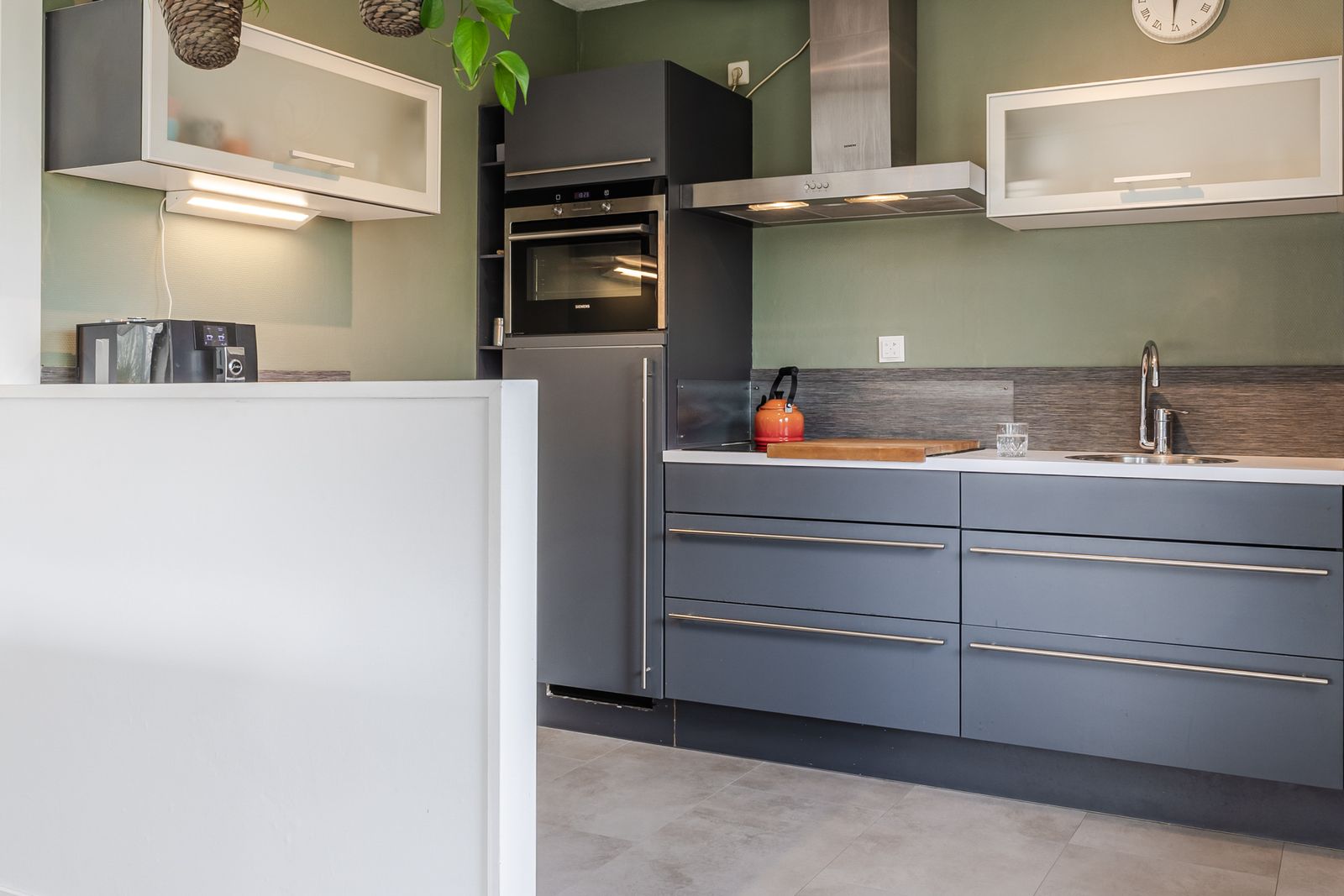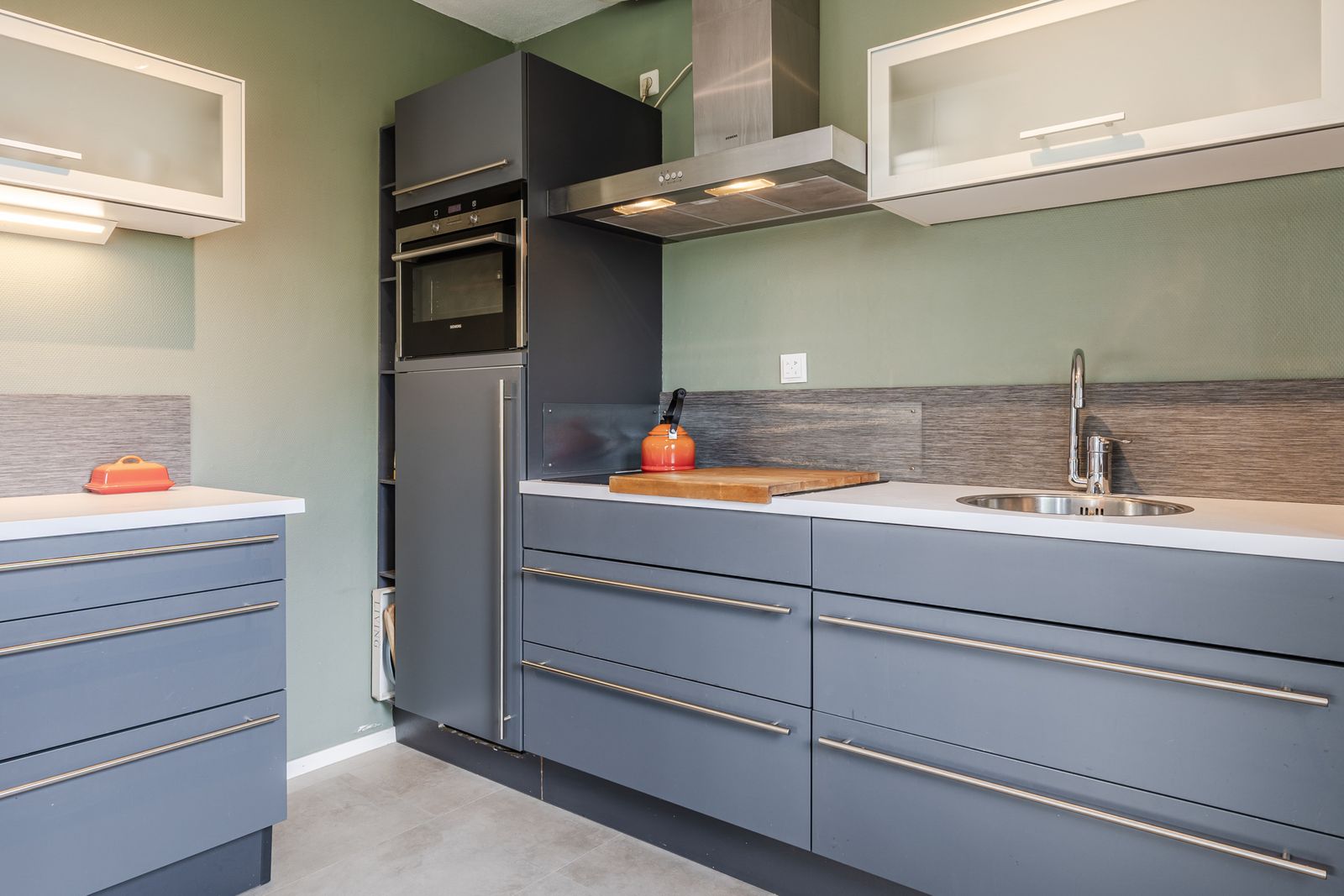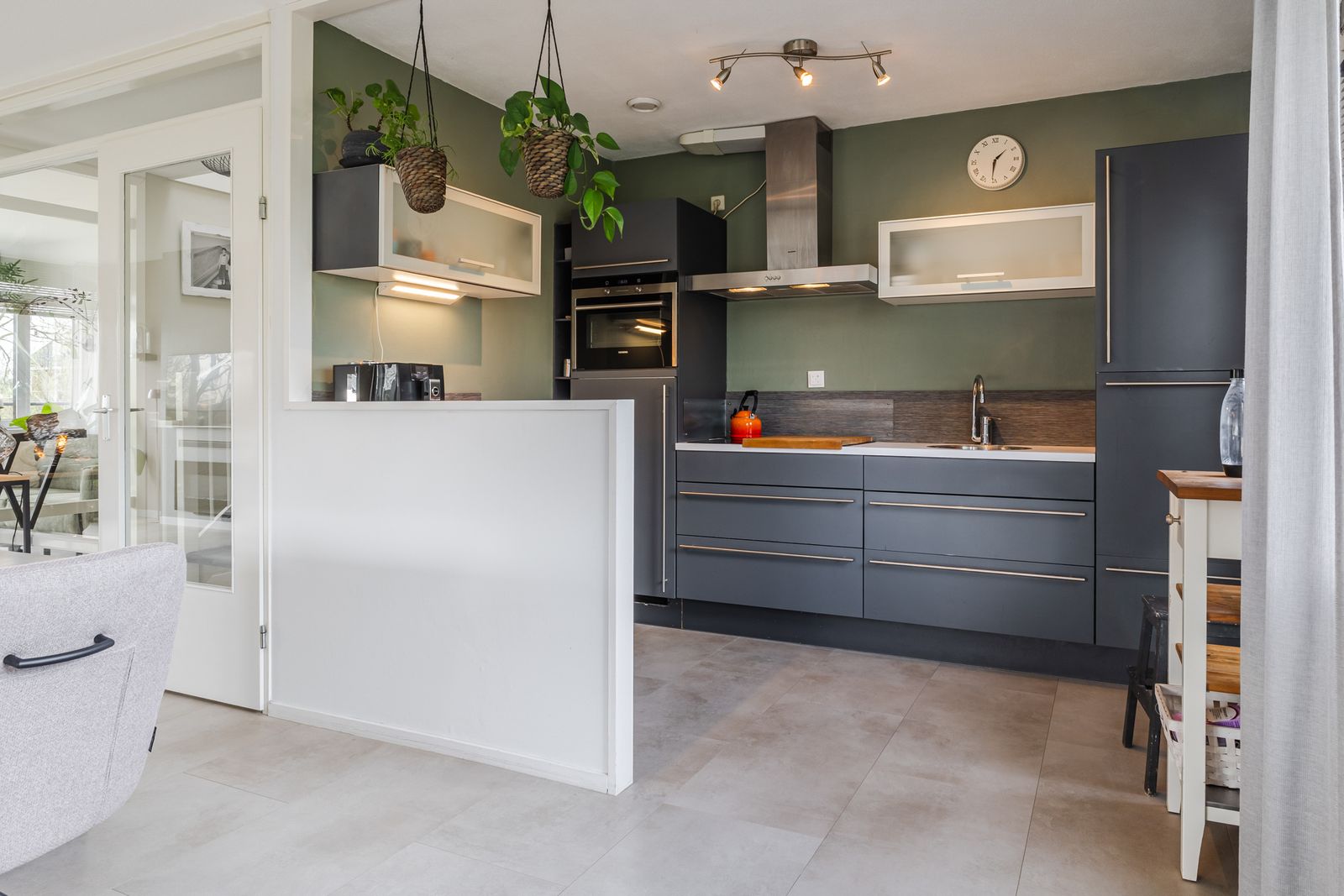 De lichte ruime woonkamer is gelegen op de eerste verdieping en geeft rondom een prachtig vrij uitzicht op het groen. De keuken is aan de achterzijde van de woning gelegen en voorzien van koelkast, vaatwasser, plint boiler en losse magnetron. De keuken is voorzien van grote inductiekookplaat. Het raam geeft een prachtige kijk op de tuin.