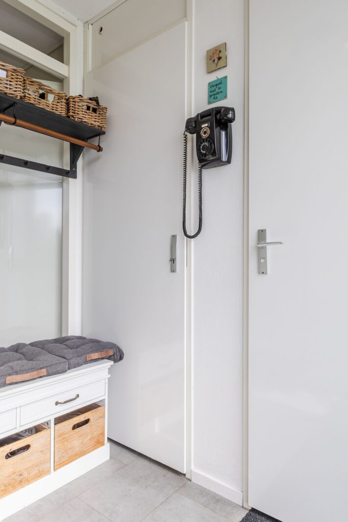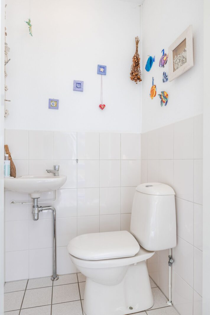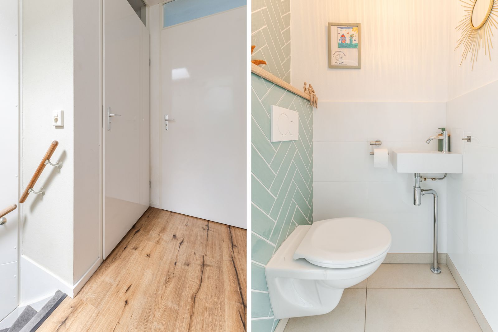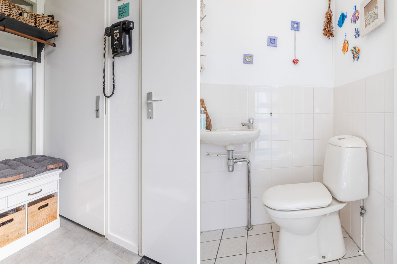 Entree van de woning met toilet en meterkast voor de tussendeur. Vanuit de hal is er rechts en slaapkamer, verder is er een grote badkamer met ligbad en wastafel.