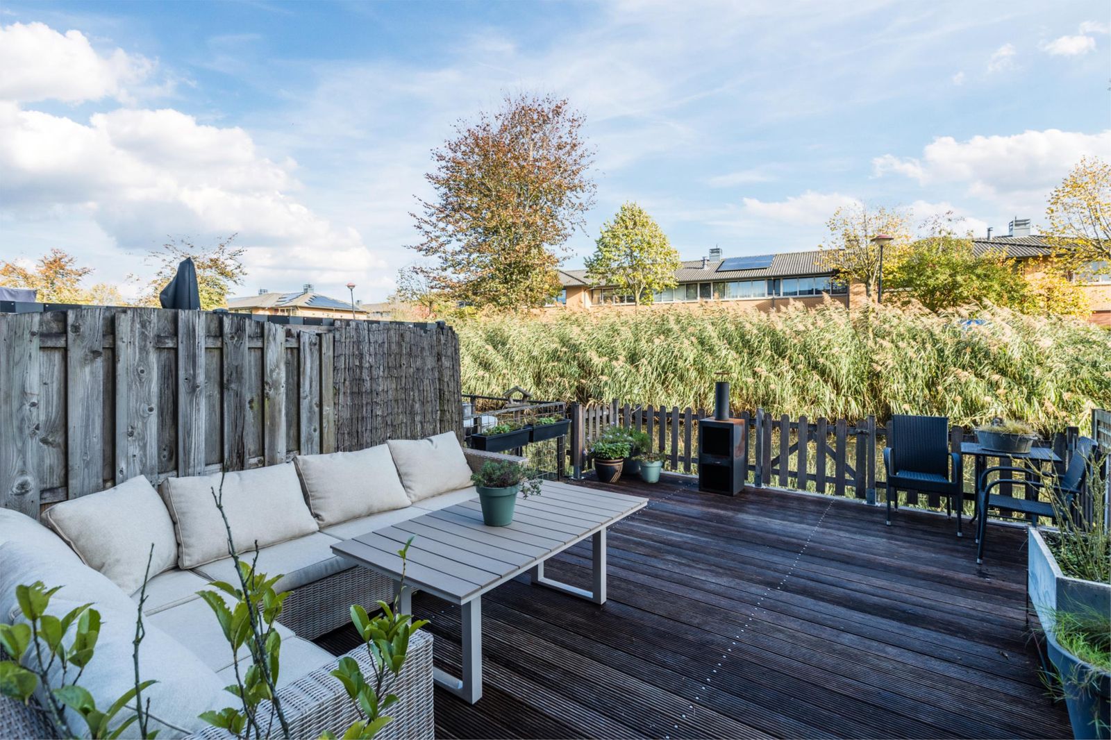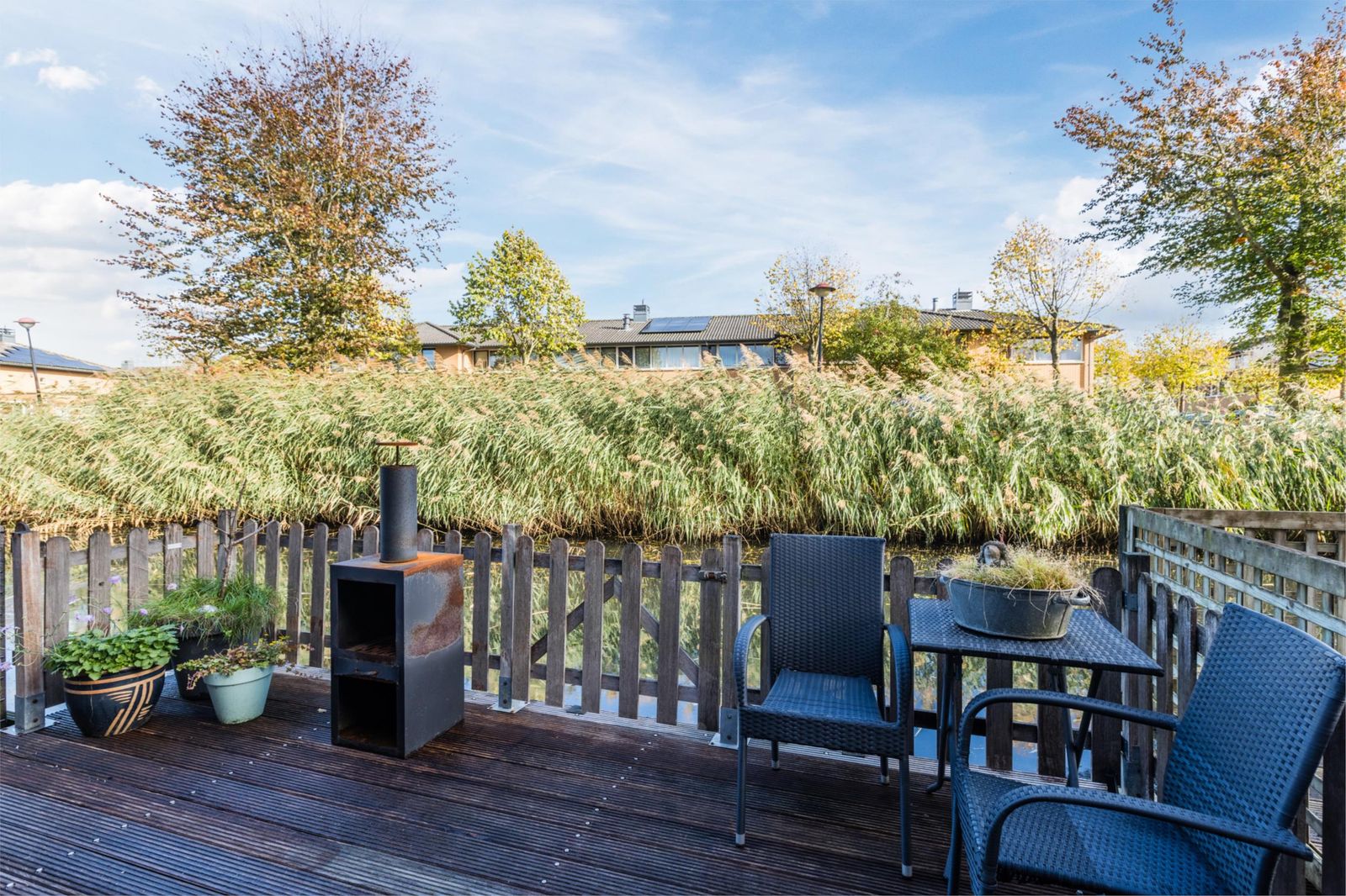 Het terras aan de achterzijde grenst direct aan het water en biedt een redelijk vrij uitzicht. Een fijne plek om tot rust te komen in een groene en rustige omgeving.