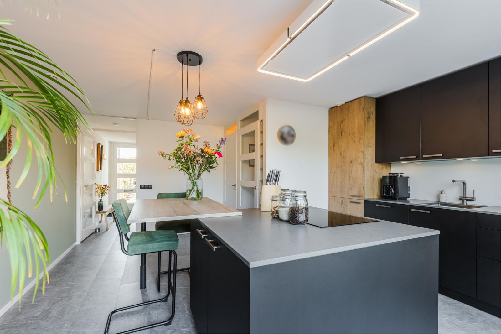 Entree met meterkast, hal met toiletruimte en trapopgang. Aan de achterzijde bevindt zich de woonkeuken, voorzien van een moderne keuken (2022) met inductiekookplaat en combi-oven. Vanuit de keuken is er directe toegang tot het terras aan het water, waar u tot in de namiddag van de zon kunt genieten.