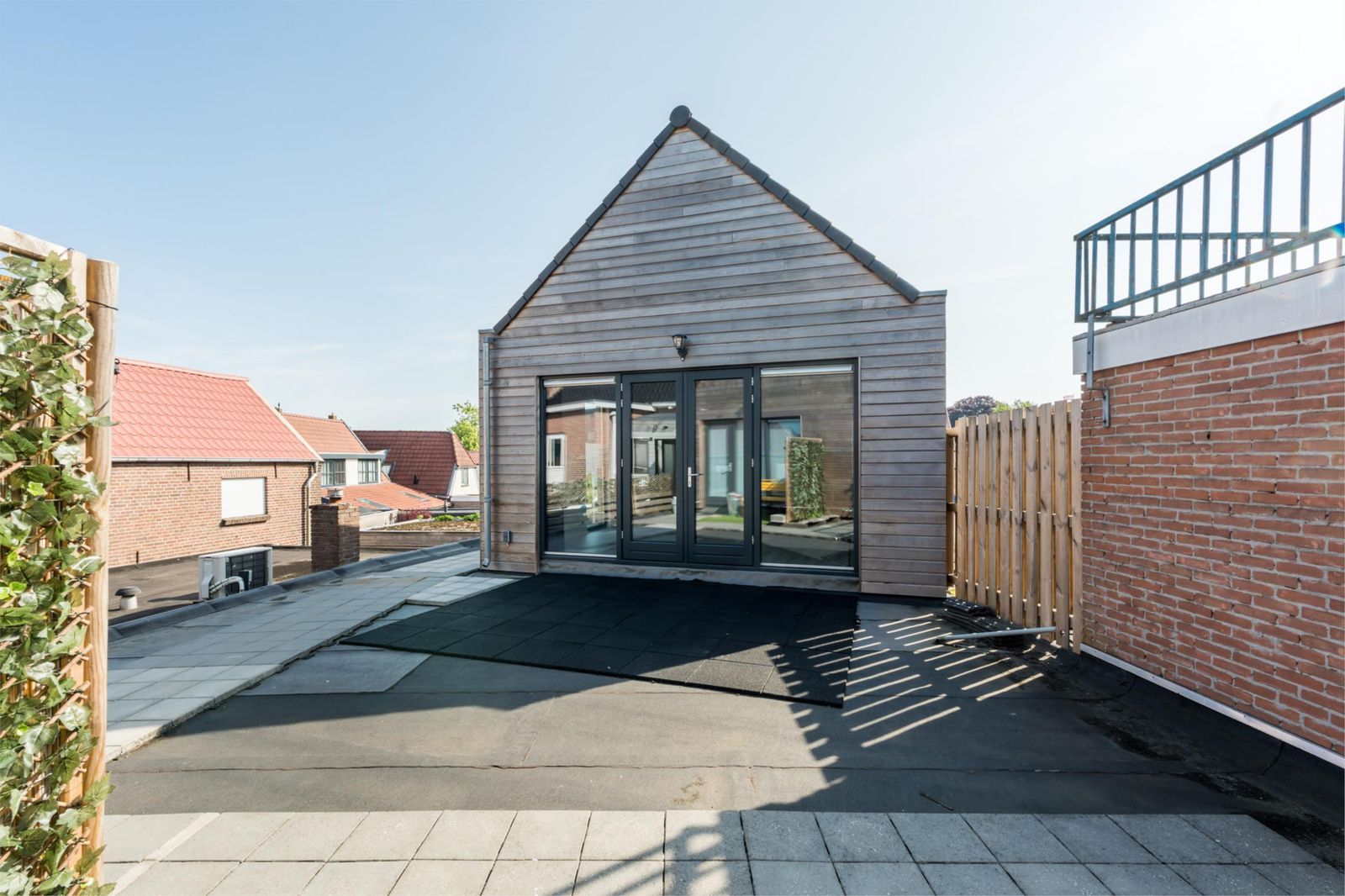 De ruime lichte woonkamer staat in verbinding met de open keuken. In de keuken en de woonkamer is het schuine dak ook meteen het plafond wat een zeer ruim effect geeft. Vanuit de woonkamer is toegang via twee openslaande deuren tot het ruime dakterras.