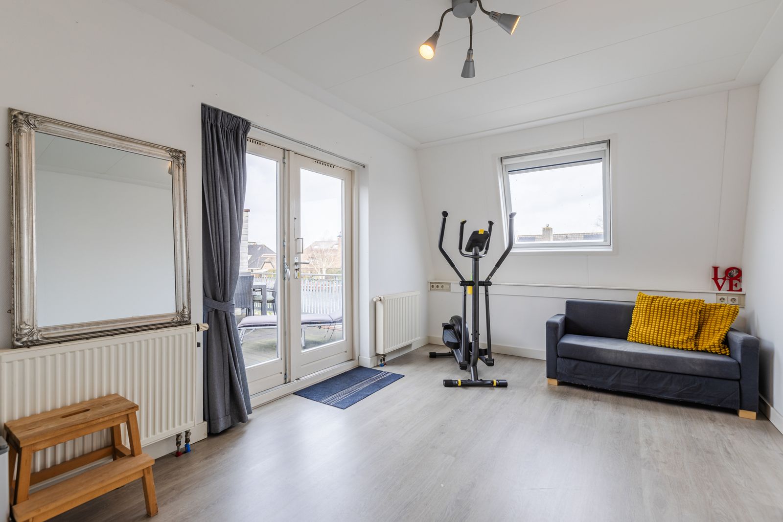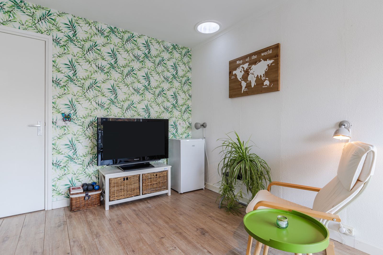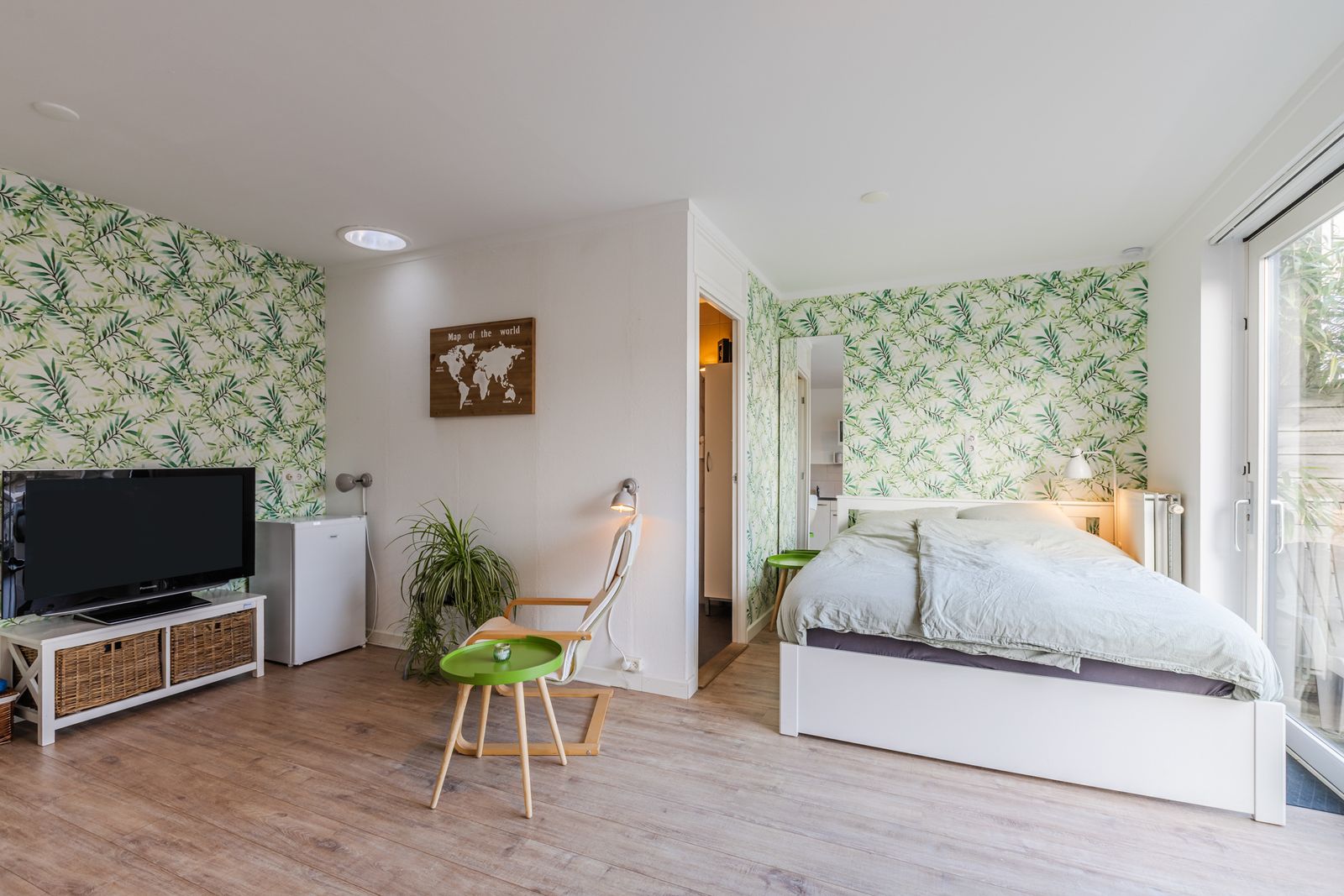 Er is nog een bijzondere plek in dit huis. Via de schuifpui op de veranda (of via de tussendeur in de keuken) is er toegang tot een mooie studio. Er is plek voor een groot bed en een gezellige zithoek. De studio heeft een eigen ruime badkamer met douche en dubbele wastafel, apart toilet en een keukenblok. Deze ruimte is uitermate geschikt voor zelfstandig wonen van een familielid of kan verhuurd worden via AirBNB voor extra inkomsten.