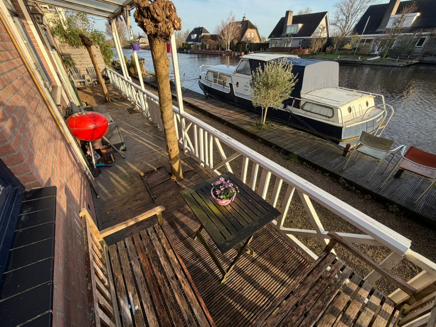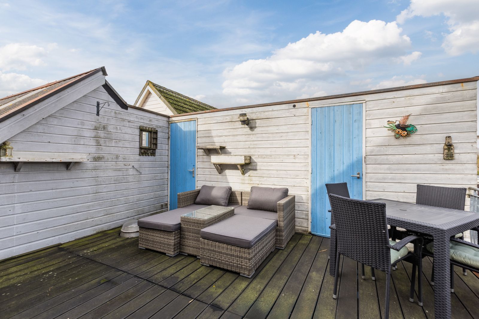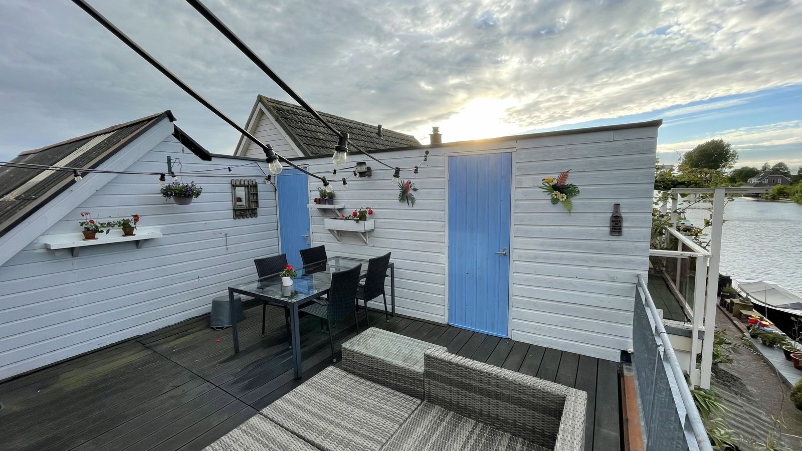 Het dakterras van 25 vierkante meter heeft de hele dag zon en heeft een prachtig uitzicht over de rivier en de voorbij varende bootjes. Op het terras is een schuurtje voor een extra koelkast en voor het opbergen van de tuinkussens. Via de andere deur kom je op de zolder van de garage.