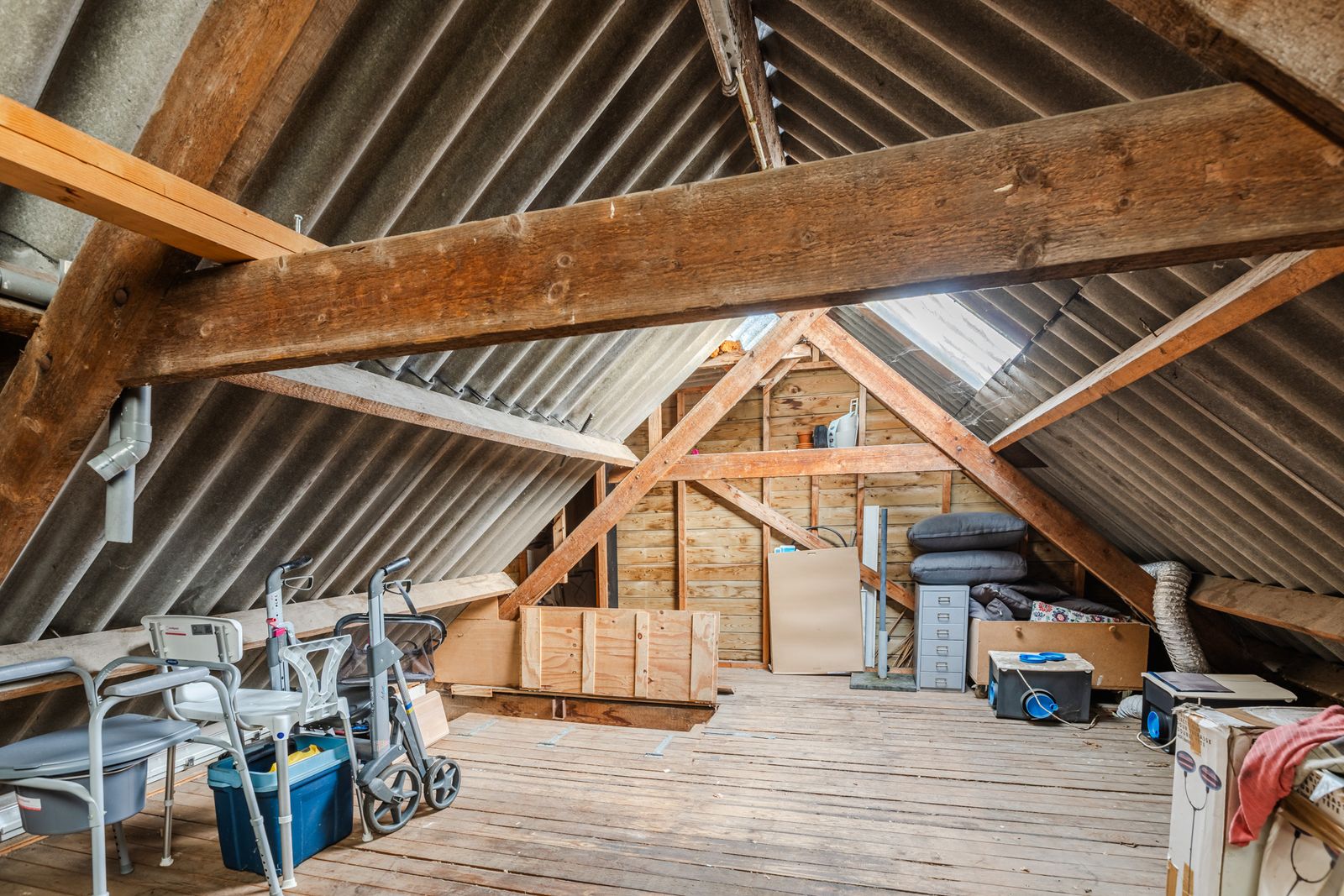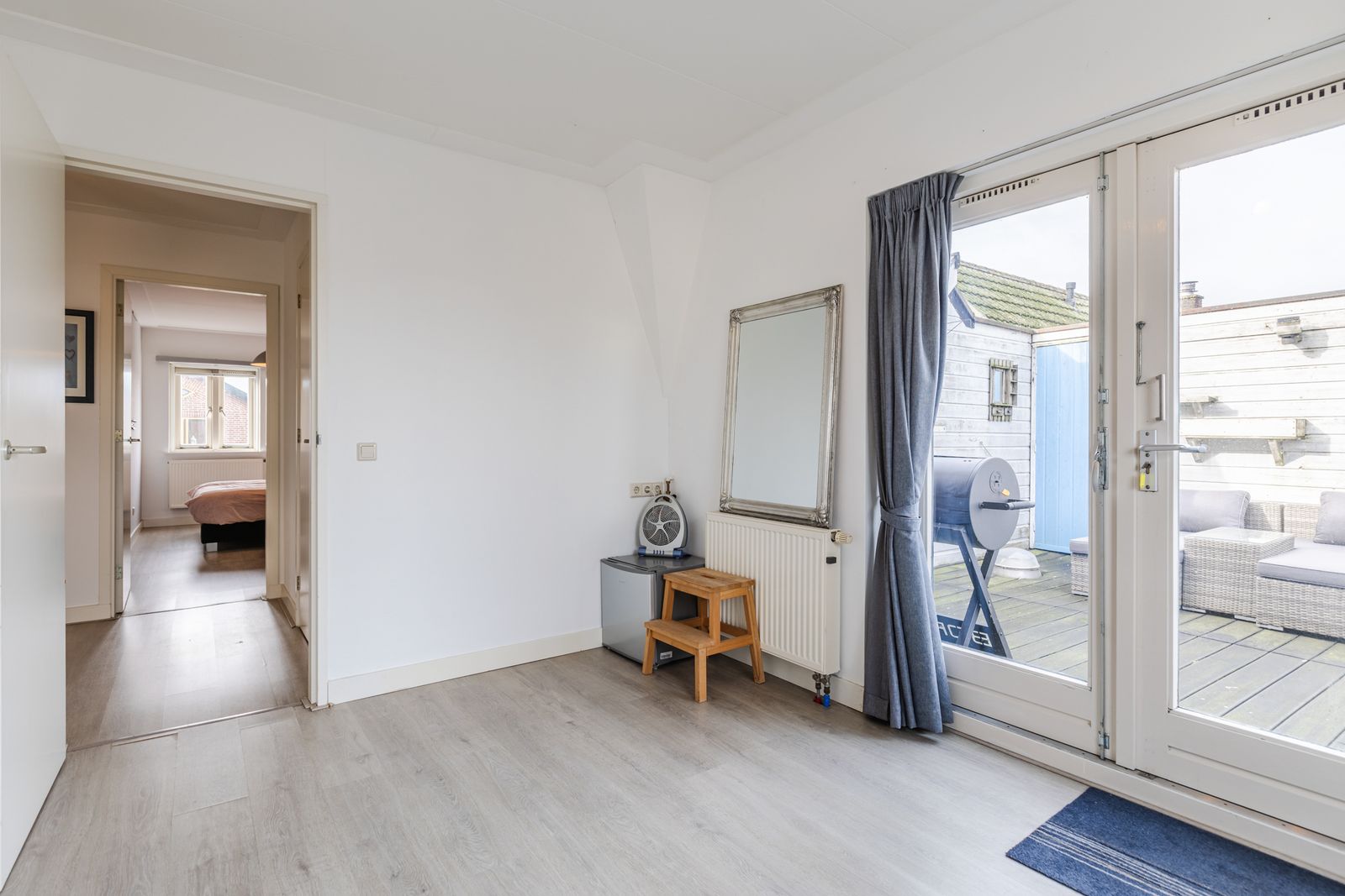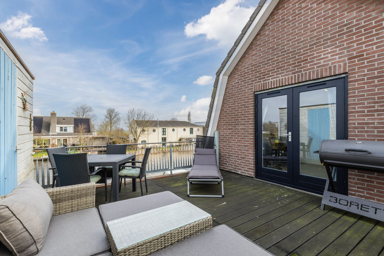 Het dakterras van 25 vierkante meter heeft de hele dag zon en heeft een prachtig uitzicht over de rivier en de voorbij varende bootjes. Op het terras is een schuurtje voor een extra koelkast en voor het opbergen van de tuinkussens. Via de andere deur kom je op de zolder van de garage.
