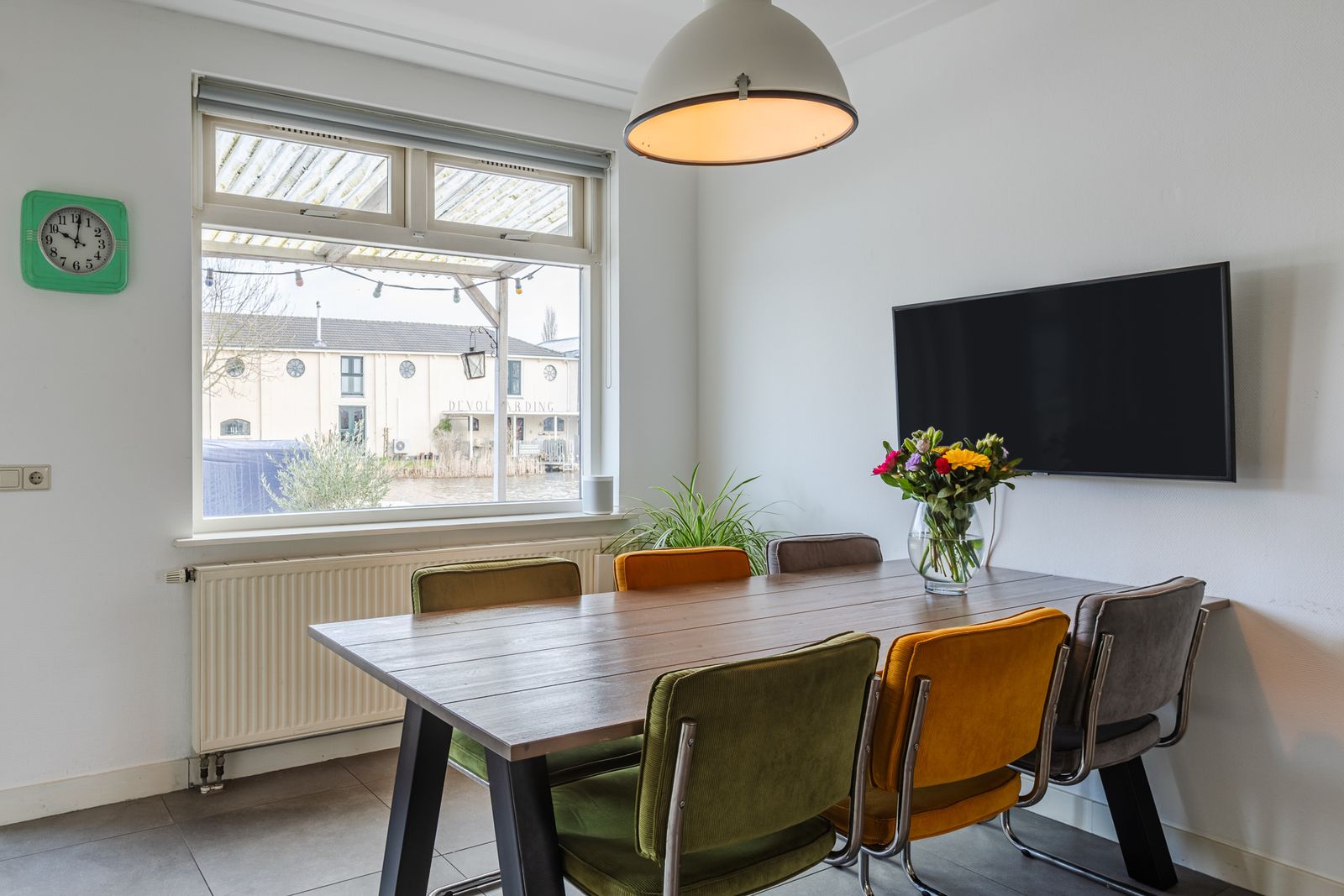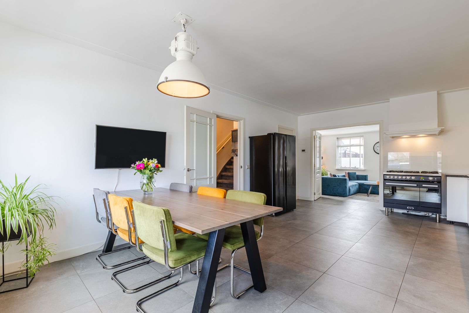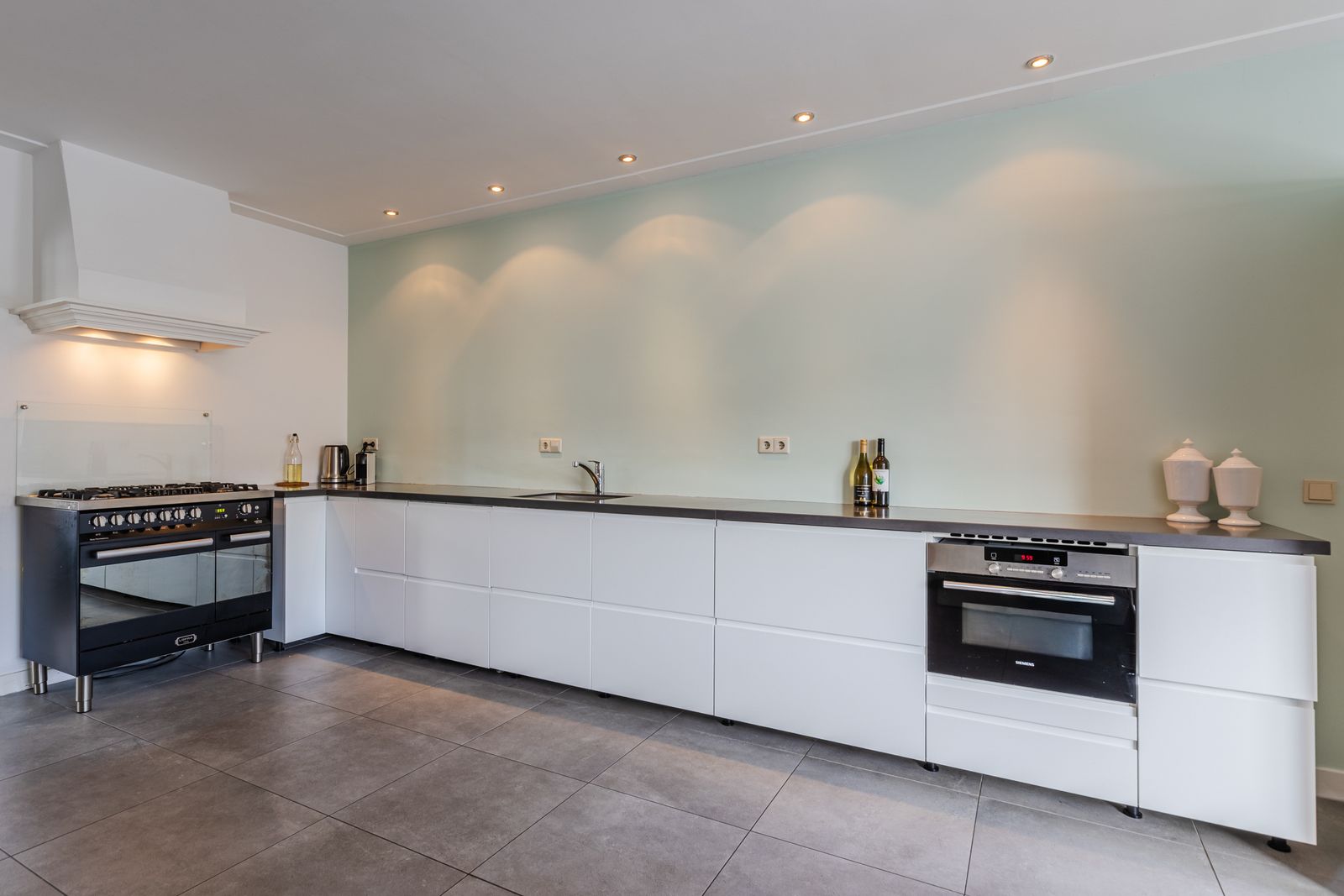 De keuken is zeer ruim met een werkblad van 5 meter met vaatwasser, combimagnetron en een 5 pits Lofra gasfornuis met dubbele oven. Er is ruimte voor een Amerikaanse koelkast en er is voldoende plek voor een grote eettafel, waardoor het echt het hart van het huis vormt. Vanuit de keuken is er direct toegang tot de veranda en zicht op de Oude Rijn met de langsvarende bootjes, wat koken en tafelen extra bijzonder maakt.